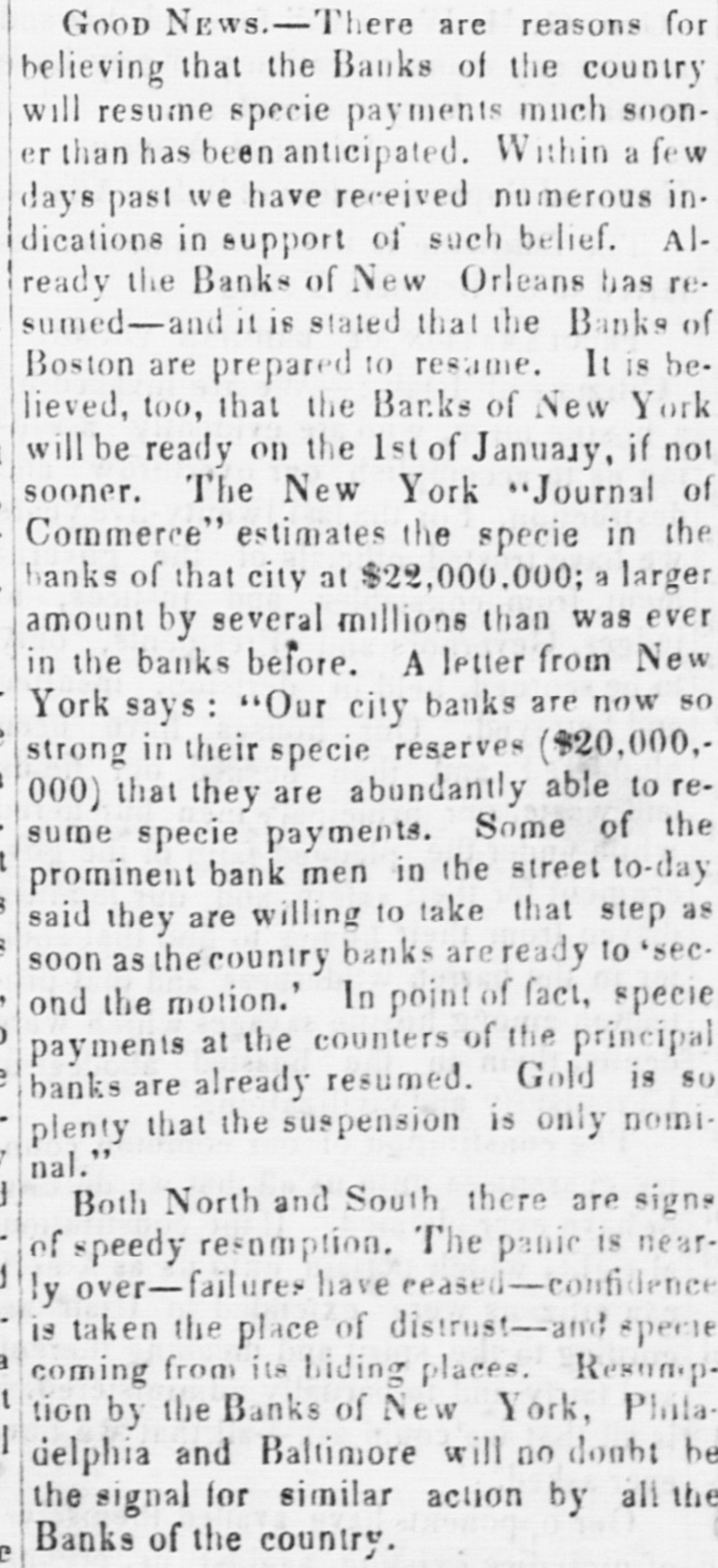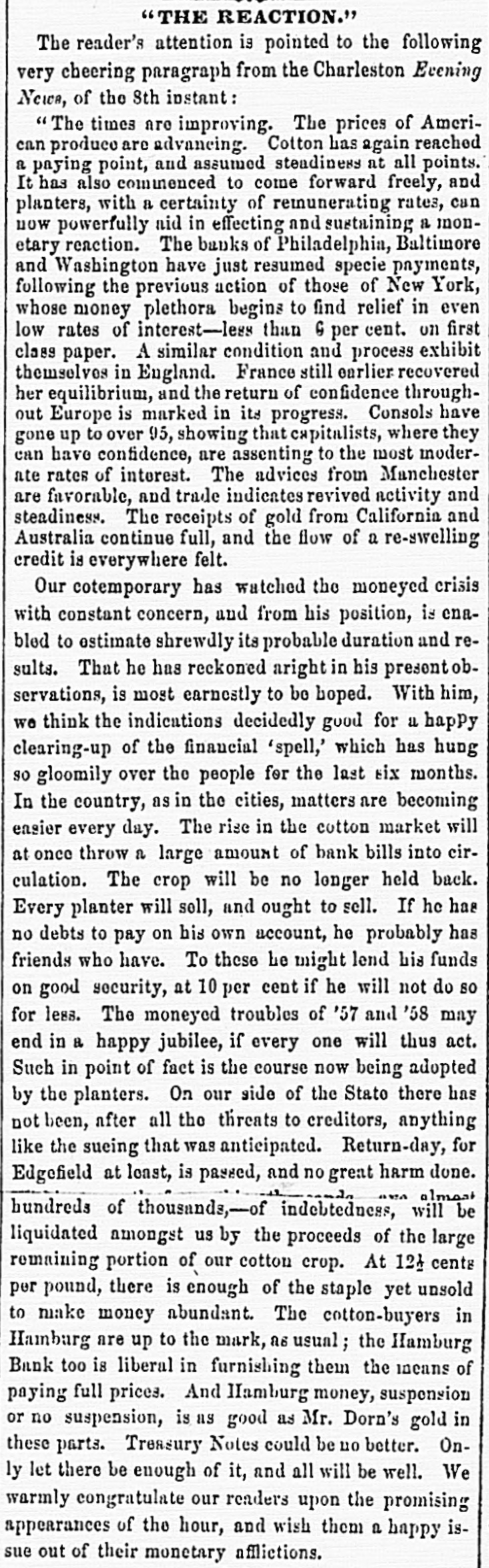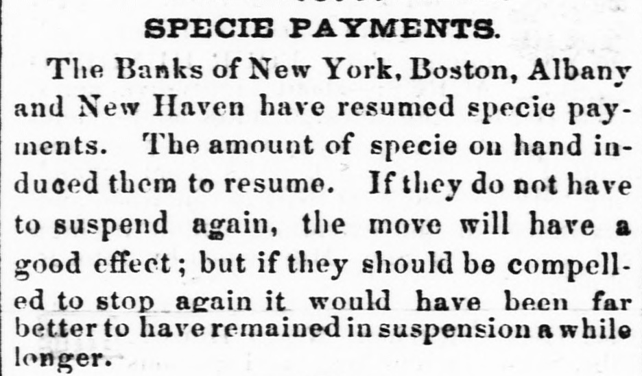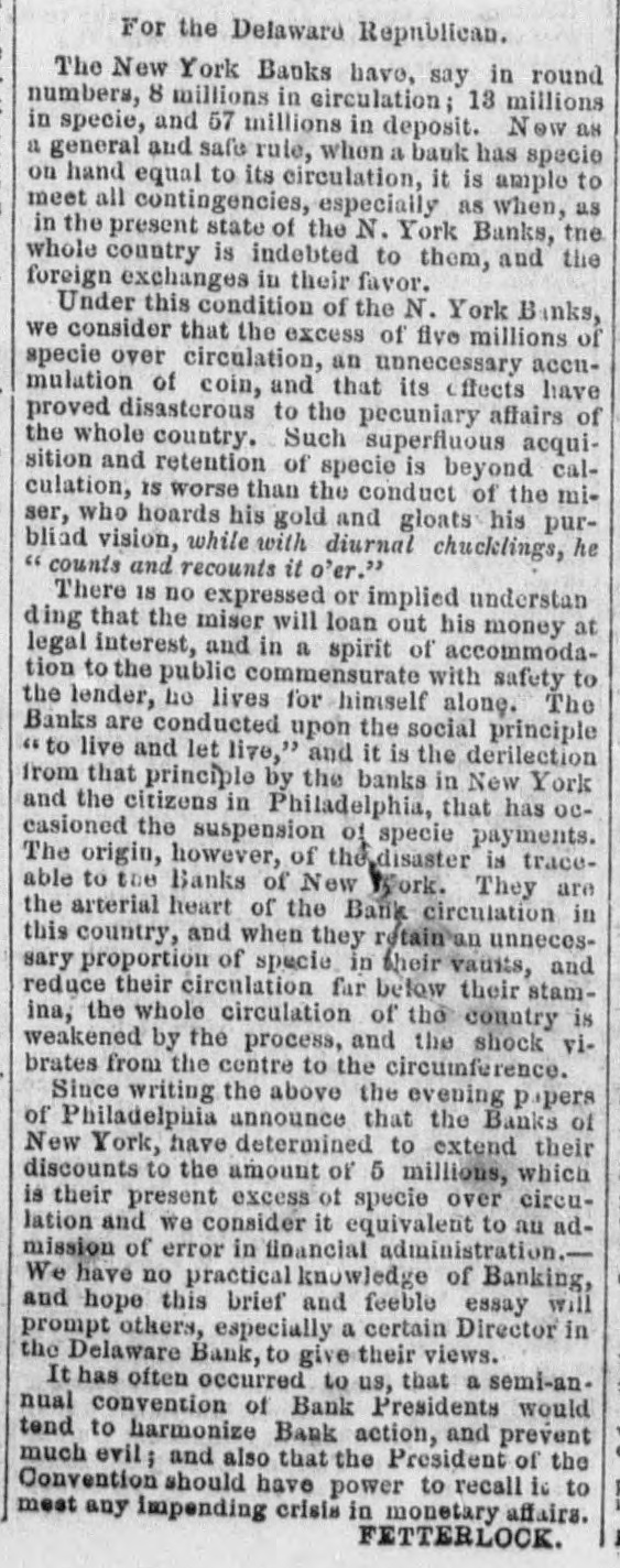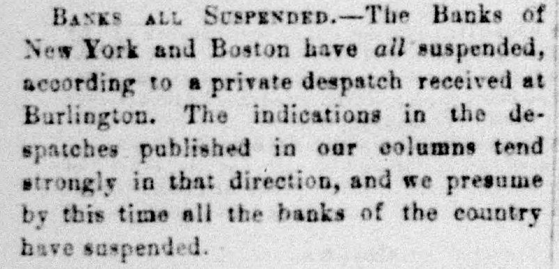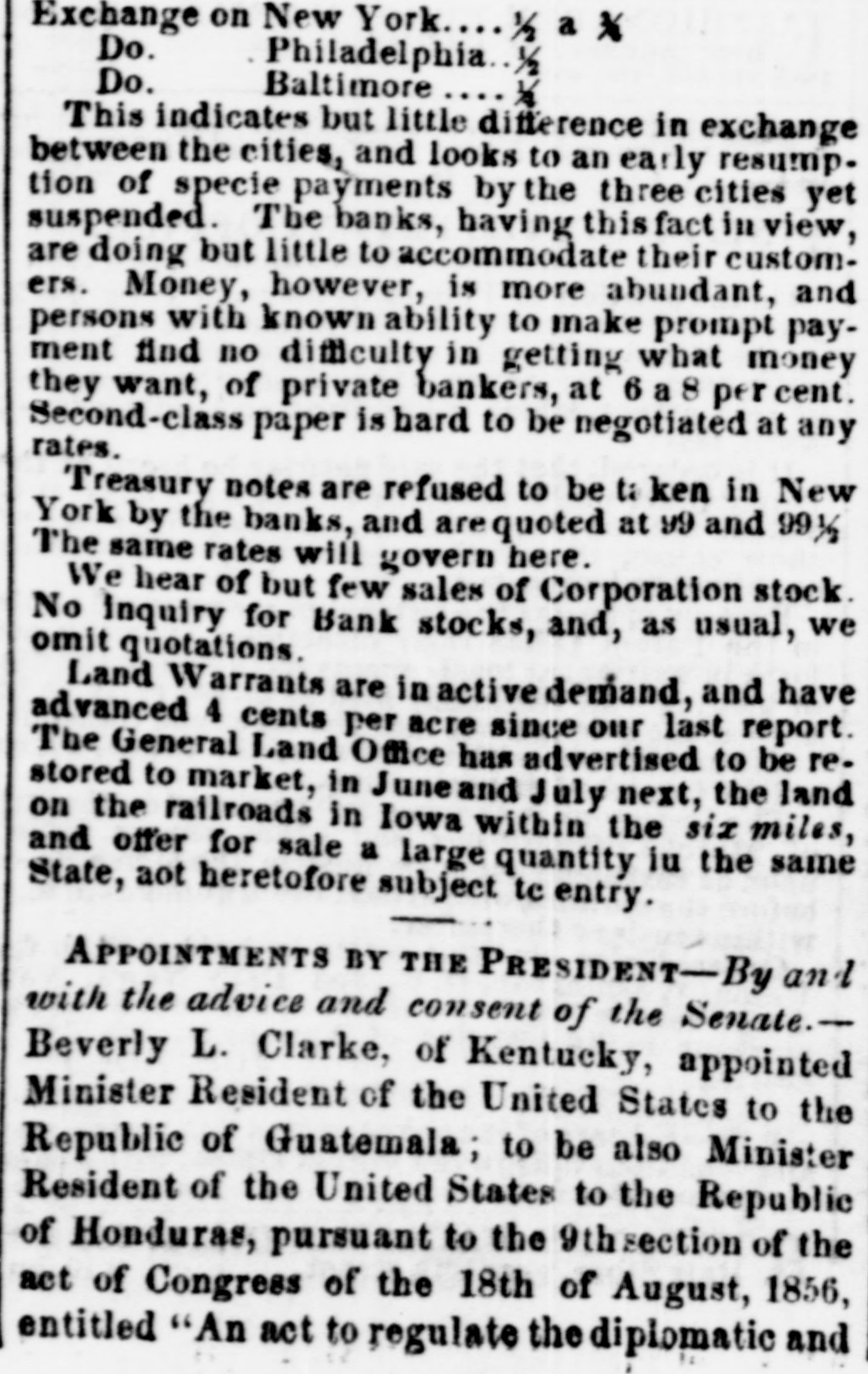 Oct Financia the New York Times, Oct. 15. The state York Money Market-The Day After Suspension. circle III No WEDNESDAY, Oct. 14. is ome de new order of business through the extract of a of the city of New York, rendered neto ommer and convenient by the stoppage of payments yesterday, was inaugurated My DEAR evening by the following proceedings at - fusion, as of bank officers held at the Clear"N THE House. New York. esolved, That we will take, at par, notes as me -h as on the State of New York, secured New York, Bank Department, at Albany, and tions at pres of each Safety Fund Banks as may to all you ha matters to esignated, from time to time on deposits of our customers only, and in payment trust any bod due our Banks, respectively anything like we will receive, or pay balances, at a parallel, W Clearing House, in such notes, the same adv counted, enveloped, tied and sealed, sidered whol the amount certified on the parcel. never the sum shall exceed $1,000 000 proTh the same be certified by an officer apby the Clearing House Association OHIO.-T will be seen that they recognize the egraph that of all the solvent banks of the City and Ohio, we reg of New York as part of the basis of have seen no are to be known. in ordinary dealings, the defeat of Funds. These and the certified ticipated cl of the bank dealers, payable in CurRepublican Funds as well as Gold and Treasury O victory. at the option of the bank, holding eiapprised the or all, will be employed in the adjust Democrats a of the daily balances growing out of lovingly in 0 inter exchanges through the Clearing Pro-Slavery The Bank of America will continue Democratic the key to the common vault in repugnance h the specie of the Associated Banks is opposition to and represented by certificates, and the didate. But opolitan Bank, it is understood, will be truth to say, the common depository of the country them gave tl notes. belonging to the Association, and racy also will be represented by certificates, Fremont's new arrangement will extend to all fall, was 16,6 bank paper secured at Albany, and 28,126. 28. It registered notes of the old Safety 10A banks as the Committee of managewould almos on this subject-aided by the experality. ^s of the Metropolitan system- shall deslast Tuesday and overeffect of the suspension upon the ex Chase's grea was not fully seen to-day. The steamtheir ticket. closed before twelve o'clock.and only thousands st transactions, and at very irregular tend to othe were made on London. We heard of The finance thousand pounds at 108 per cent. and vulsion that quotations at 105 per 107, banking men. withdr And few produce bills, with the local polities documents attached, were done at their influen but whether to carry out previous enas four-fifths ments or not, we could not ascertainBut the pe rellef to the market, however, is very mustered for and the improvement in the rate on That class and not because of the apprecia vote. As \ of gold, as compared with current funds. the telegrap could not be sold to the Brokers better unreliable. from 1a21 per cent. premium, and there tual vote is a limited market to supply Customthe telegrap wants and a few of the banks exhausilton county their supply before three b'clock yesterDemocratic, Several considerable parcels were rethe truth on general deposit to the banks free 611 Spuo remium. Most parties are disappointed 35; Ottawa indifference in the market. As 1837, fiance repor went to 13 per cent. premium immedigan is repo after the suspension. A close survey Chase 583. the circumstances attending the presties in which led us to anticipate yesterday that We think would be worth in the market not exocrats have 3 to 5 per. cent. The advice by telehaving carri that $1,250,000 is now at hand from The Repub fornia, and the general conviction to-day House bu the daring of the past few days on the nor any imp was from no popular attachment to gold legislative distrust in our New York paper currenwhich side 1 the sudden withdrawal of confidence We shall mercantile sympa thy with the City Bank count. that agement, no doubt influenced thedullness elected and market. And this will continue, unML Chicago the Southern Banks, particularly at New IOWA hold on to the specie basis, and gold changes fe equired for the purchase of cotton, or the enough, we aoption of New York State currenthat Judge bankable funds, should greatly enhance by four to fi value of foreign bills. publicans h: Democratic Exchanges will continue Legislature, ttled or immovable only a few days lonSenator, S. On the near cities little was done the present Philadelphia and Baltimore appretory more to 96a98. The Pennsylvania Legislais settled, tl has afforded the relief asked for by the yond all per in that State. They have until the April and A Monday in April next to prepare for general apa mption. The act provides for weekly strength.ments by the city banks of Philadelphia Pittsburgh, similar to the New York Important also It the jo currency equalizes The follow State in all banking operations, and it retorney Gene the depositors to the credit of the postmasters monwealth to be made specie for the SIR: You of the interest of the public debt received. in telegraph announces a general suspension aghout New England. right of post cases for sta Discount market, except in Bank, has returned not taken shape. There was not much the act of 0 paper offering to day. The failures partment, Monday have fallen off, whether from Court upon relief, or by reason of temporary exto live over a few days in the hope 578, 11 How it would be difficult to say. We ples of law brought me sure, however, that several impendfail res have been thus far averted, ing rules ou clear. cessation of such disasters fora few days A post will, from the present opinion atnong liscount brokers, bring down the rates on stamps cost them made, paper very materially. The sense of Their value from panic, if not from dear money, is general. them repres of posta