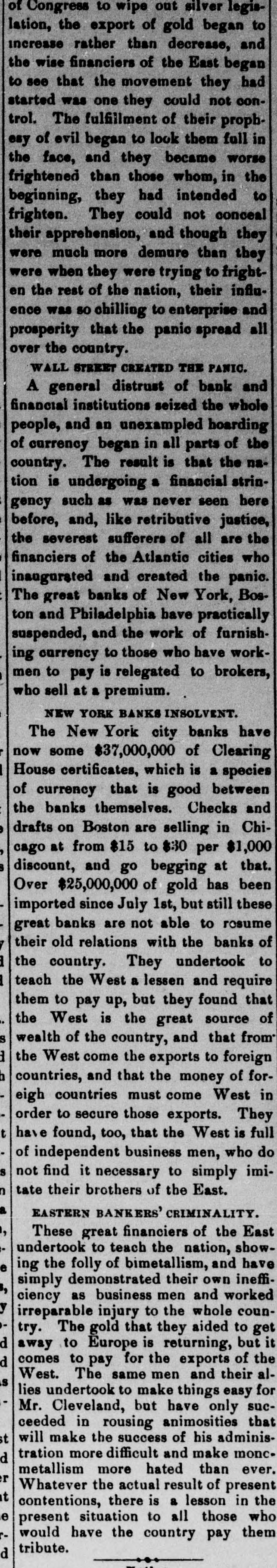 of Congress to wipe out silver legis. lation, the export of gold began to increase rather than decrease, and the wise financiers of the East began to see that the movement they had started was one they could not control. The fulfillment of their prophesy of evil began to look them full in the face, and they became worse frightened than those whom, in the beginning, they had intended to frighten. They could not conceal their apprehension, and though they were much more demure than they were when they were trying to frighten the rest of the nation, their influence was so chilling to enterprise and prosperity that the panic spread all over the country. WALL STREET CREATED THE PANIC. A general distrust of bank and financial institutions seized the whole people, and an unexampled boarding of currency began in all parts of the country. The result is that the nation is undergoing a financial stringency such as was never seen here before, and, like retributive justice, the severest sufferers of all are the financiers of the Atlantic cities who inaugurated and created the panic. The great banks of New York, Boston and Pbiladelphia have practically suspended, and the work of furnishing currency to those who have workmen to pay is relegated to brokers, who sell at a premium. NEW YORK BANKS INSOLVENT. The New York city banks have now some $37,000,000 of Clearing House certificates, which is a species of currency that is good between the banks themselves. Checks and drafts on Boston are selling in Chicago at from $15 to $30 per $1,000 discount, and go begging at that. Over $25,000,000 of gold has been imported since July 1st, but still these great banks are not able to rosume their old relations with the banks of the country. They undertook to teach the West a lessen and require them to pay up, but they found that the West is the great source of wealth of the country, and that from the West come the exports to foreign countries, and that the money of foreigh countries must come West in order to secure those exports. They t have found, too, that the West is full of independent business men, who do s not find it necessary to simply imin tate their brothers of the East. EASTERN BANKERS' CRIMINALITY. , These great financiers of the East undertook to teach the nation, showe ing the folly of bimetallism, and have simply demonstrated their own ineffi3, ciency as business men and worked y irreparable injury to the whole country. The gold that they aided to get d away to Europe is returning, but d comes to pay for the exports of the West. The same men and their alis lies undertook to make things easy for Mr. Cleveland, but have only succeeded in rousing animosities that st will make the success of his administration more difficult and make moncd metallism more hated than ever. r Whatever the actual result of present t contentions, there is a lesson in the le present situation to all those who would have the country pay them tribute. d