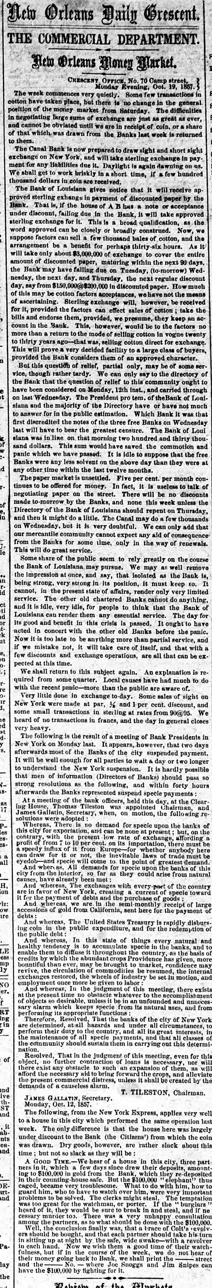 Dew Orleans Daily Grescent. THE COMMERCIAL DEPARTMENT. Hew Orleans Money Market. CHESCENT OFFICE, No. 70 Camp street. Monday Evening, Oct. 19, 1857. The week commences very quietly. Some few transactions in cotton have taken place, but there is no change in the general position of the money market from Saturday. The difficulties in negotiating large sums of exchange are just as great as ever, and cannot be obviated until we are in receipt of coin, or a share of that which was drawn from the Banks last week is returned to them. The Canal Bank is now prepared to draw sight and short sight exchange on New York, and will take sterling exchange in pay. ment for any liabilities due it. Daylight is again dawning on us. We shall get to work briskly in a short time, if a few hundred thousand dollars incoin received. The Bank of Louisiana gives notice that it will receive ap. proved sterling exhange in payment of discounted paper by the Bank. That is, if the house of A B has a note or acceptance under discount, failing due in the Bank, it will take approved sterling exchange for it. This is a broad qualification, as the word approved can be closely or broadly construed. Now, we suppose factors can sell a few thousand bales of cotton, and the arrangement be a benefit for perhaps thirty six hours. As it will take only about $3,000,000 of exchange to cover the entire amount of discounted paper, maturing within the next 90 days, the Bank may have falling due on Tuesday, (to-morrow) Wednesday, the next day, and Thursday, the next regular discount day, say from $150,000@$200,000 in discounted paper. How much of this may be cotton factors acceptances, have not the means of ascertaining. Sterling exchange will, however, be received for it, provided the factors can effect sales of cotton take the bills and endorse them, provided, we presume, they keep an account in the Bank. This, however, would be to the factors no more than a return to the mode of selling cotton in vogne twenty to thirty years ago-that was, selling cotton direct for exchange. This will prove a very decided facility to a large class of buyers, provided the Bank considers them of an approved character. But this question of relief, partial only, may be of some service, though rather tardy. We can only say to the directory of the Bank that the question of relief to this community ought to have been considered on Monday, 12th inst., and carried through on last Wednesday. The President pro tem. of theBank of Louisiana and the majority of the Directory have or have not much to answer for in the public estimation. Which Bank it was that first discredited the notes of the three free Banks on Wednesday last will have to bear the greatest censure. The Bank of Loui siana was in line on that morning two hundred and thirty thousand dollars. This sum would have saved the commotion and panic which we have passed. It is idle to suppose that the free Banks were any less solvent on the above day than they were at d any other time within the last twelve months. The paper market is unsettled. Five per cent. per month continues to be offered for money. In fact, it is useless to talk of negotiating paper on the street. There will be no discounts made to-morrow by the Banks, and none this week unless the Directory of the Bank of Louisiana should repent on Thursday, and then it might do a little. The Canal may do a few thousands on Wednesday, but it is very doubtful. We can only add that our mercantile community cannot expect any aid of consequence from the Banks for some time, only in the way of renewals. This will do great service. Some share of the public seem to rely greatly on the course the Bank of Louisiana may pursue. We may as well remove the impression at once, and say, that isolated as the Bank is, being strong. very strong in its position, it must keep EO. It cannot, in the present state of affairs, render only very limited service. The other old chartered Banks cannot do anything, and it is idle, very idle, for people to think that the Bank of Louisiana can render them any essential service. The day for its good and benefit in this crisis is passed. It ought to have acted in concert with the other old Banks before the panic. Now it is too late to be anything more than partial service, and if we mistake not, it will take care of itself, and that with a few discounts and exchange operations, are all that can be expected at this time. We shall return to this subject again. An explanation is required from some quarter. Local causes have had much to do with the recent panic-more than the public are aware of. Very little done in exchange to-day. Some sales of sight on New York were made at par, ½ and 1 per cent. discount, and some small transactions in sterling at rates from 90@95. We heard of no transactions in francs, and the day in general closes very heavy. The following is the result of a meeting of Bank Presidents in New York on Monday last. It appears, however, that two days afterwards most of the Banks of the city suspended payment. It will be well enough for all parties to wait & day or two longer to understand the New York suspension. It is hardly possible that men of information (Directors of Banks) should pass so strong resolutions as the following, and within forty hours Safterwards the Banks represented suspend specie payments: as At a meeting of the bank officers, held this day, at the Clear17 ing House, Thomas Tileston was appointed Chairman, and James Gallatin, Secretary, when, on motion, the following resolutions were adopted Whereas, There is no demand for specie upon the banks of les this city for exportation, and can be none at present but, on the contrary with the present low rate of exchange, affording a esprofit of from to 10 per cent. on its importation, there must be a speedy influx of it from Europe-for whether anybody here a can draw for it or not, the inevitable laws of trade must be all eyedob-and specie will come to the poi