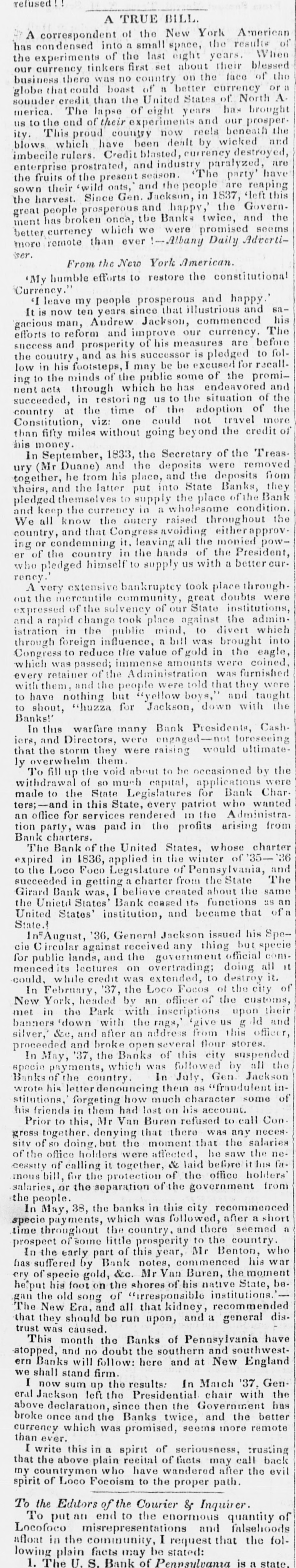 refused A TRUE BILL A correspondent of the New York American has condensed into a small space, the results of the experiments of the last eight years. When our currency tinkers first set about their blessed business there was no country on the face of the globe that could boast of 11 better currency or sounder credit than the United States of North A merica. The lapse of eight years has brought us to the end of their experiments and our prosperity. This proud country now reels beneath the blows which have been dealt by wicked and imbecile rulers. Credit blasted, currency destroyed, enterprise prostrated, and industry paralyzed, are the fruits of the present season. The party' have sown their 'wild oats, and the people are reaping the harvest. Since Gen. Jackson, in 1837, 'left this great people prosperous and happy," the Govern. ment has broken once, the Banks twice, and the better currency which we were promised seems more remote than ever :-Albany Daily Advertiser. From the New York American. 'My humble efforts to restore the constitutional Currency.' 'I leave my people prosperous and happy. It is now ten years since that illustrious and sagacious man, Andrew Jackson, commenced his efforts to reform and improve our currency. The success and prosperity of his measures are before the country, and as his successor is pledged to follow in his footsteps, I may be be excused for recalling to the minds of the public some of the prominent acts through which he has endeavored and succeeded, in restoring us to the situation of the country at the time of the adoption of the Constitution, viz: one could not travel more than fifty miles without going beyond the credit of this money. In September, 1833, the Secretary of the Treas ury (Mr Duane) and the deposits were removed together, he from his place, and the deposits from theirs, and the latter put into State Banks, they pledged themselves to supply the place of the Bank and keep the currency in a wholesome condition. We all know the outery raised throughout the country, and that Congress awoiding erapproving or condemning it. leaving all the monied power of the country in the hands of the President, pledged himself to supply us with a better cur. rency.' very extensive bankruptcy took place through out the mercantile community, great doubts were expressed of the solvency of our State institutions, and a rapid change took place against the administration in the public mind, to divert which through foreign influence, a bill was brought into Congress to reduce the value of gold in the eagle, which was passed; immense amounts were coined, every retainer of the Administration furnished with them, and the people were told that they were to have nothing but "yellow boys," and taught to shout, "huzza for Jackson, down with the Banks!' In this warfare many Bank Presidents, Cashiers, and Directors, were engaged-not foreseeing that the storm they were raising would ultimate ly overwhelm them To fill up the void about to be occasioned by the withdrawal of so much capital, applications were made to the State Legislatures for Bank Charters;-and in this State, every patriot who wanted an office for services rendered in the Administration party, was paid in the profits arising from Bank charters. The Bank of the United States, whose charter expired in 1836, applied in the winter of '35-36 to the Loco Foco Legislature of Pennsylvania, and succeeded in getting a charter from the State The Girard Bank was, I believe created about the same the Unietd States Bank ceased its functions as an United States' institution, and became that of State. InFAugust, '36, General Jackson issued his Specie Circular against received any thing but specie for public lands, and the government official com. it mencedits lectures on overtrading; doing all could, while credit was extended, to destroy it. In February, 37, the Loco Focos of the city of New York, headed by an officer of the customs, met in the Park with inscriptions upon their banners down with the rags, 'give us g Id and silver," &cc, and after an address from this officer, proceeded and broke open several flour stores. In May, '37, the Banks of this city suspended specio payments, which was followed by all the Banks of the country In July, Gen. Jackson wrote his denouncing their as "fraudulent institutions, forgeting how much character some of his friends in them had lost on his account. Prior to this, Mr Van Buren refused to call Con together. denying that there was any neces. sitv of so doing. but the moment that the salaries of the office holders were affected, he saw the necessity of calling it together, & laid before it his famous bill, for the protection of the office holders salaries, or the separation of the government from the people. In May, 38, the banks in this city recommenced specie payments, which was followed, after a short a time throughout the country, and there seemed prospect of some little prosperity to the country In the early part of this year, Mr Benton, who has suffered by Bank notes, commenced his war cry of specio gold, &c. Mr Van Buren, the moment he'put his foot on the shores of his native State, began the old song of "irresponsible institutions." The New Era, and all kidney, recommended that they should be run upon, and a general dis. trust was caused. This month the Banks of Pennsylvania have atopped, and no doubt the southern and southwestern Banks will follow: here and at New England we shall stand firm. I now sum up the results: In March '37, General Jackson left the Presidential chair with the above declaration, since then the Government has broke once and the Banks twice, and the better currency which was promised, seems more remote than ever. I write this in a spirit of seriousness, trusting that the above plain recital of facts may call back my countrymen who have wandered after the evil spirit of Loco Focoism to the proper path. To the Editors of the Courier & Inquirer. To put an end 