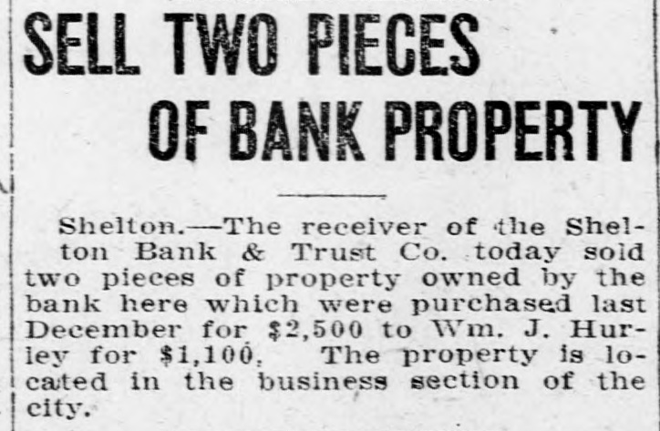 SELL TWO PIECES OF BANK PROPERTY Shelton.-The receiver of the Shelton Bank & Trust Co. today sold two pieces of property owned by the bank here which were purchased last December for $2,500 to Wm. J. HurThe property is loley for $1,100. cated in the business section of the city.