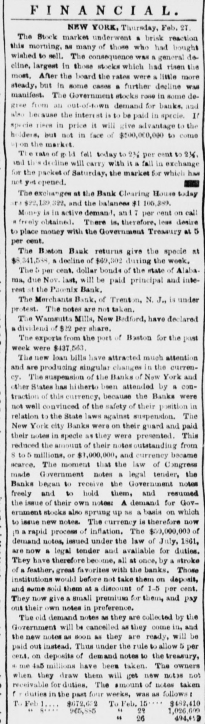 FINANCIAL. NEW YORK, Thursday, Feb. 27. The Stock market underwent a brisk reaction this morning, as many of those who had bought wished to sell. The consequence was a general de cline, largest in those stocks which had risen the most. After the board the rates were a little more steady, but in some cases a further decline was manifest. The Government stocks rose in some degive from an out-of-town demand for banks, and also because the interest is to be paid in specie. If specie riees in price it will give advantage to the holders, but not in face of $500,000,000 to come upon the market T e rate of gold fell today to 21/4 per cent to 21. and this decline will carry with it a fall in exchange for the packet of Saturday, the market for which has not yet opened. THE The exchanges at the Bank Clearing House today $22,139,322 and the balances $1 106,389. Money is in active demand, an17 per cent on call R freely obtained. There is, therefore, less desire to place money with the Government Treasury at 5 per cent. I The Boston Bank returns give the specie at $8,341,588 a decline of $69,302 during the week. The per cent. dollar bonds of the state of Alaba. . ma, due Nov. last, will be paid principal and interest at the Pacenix Bank, , The Merchants Bank, of Trenton, N.J., is under protest. The notes are not taken. I The Wamsutta Mills, New Bedford, have declared ) a dividend of $22 per share. ) The exports from the port of Boston for the past ) week were $437,563. The new loan bills have attracted much attention ) and are producing singular changes in the currency. The suspension of the Banks of New York and other States has hisherto been attended by a con) traction of this currency, because the Banks were not well convinced of the safety of their position in ) relation to the State laws against suspension. The New York city Banks were on their guard and paid their notes in specie as they were presented. This reduced the amount of their notes outstanding from 8 to 5 millions, or $1,000,000, and currency became scarce, The moment that the law of Congress made Government notes a legal tender, the Banks began to receive the Government notes freely and to hold them, and resumed : the issue of their own notes: A demand for Government stocks also sprung up as a basis on which I to issue new notes. The currency is therefore now in a rapid process of inflation. The $59,000,000 of . demand notes, issued under the law of July, 1861, : , are now a legal tender and available for duties. : They have therefore become, all at once, by a stroke of a feather, great favorites with the banks. Those institutions would before not take them on deposit, and some sold them at a discount of 1-5 per cent. They now give a small premium for them, and pay out their own notes in preference. The old demand notes as they are collected by the Government will be cancelled as they come in, and the new notes as soon as they are ready, will be paid out instead. Thus under the rule to allow 5 per cent. on deposits of demand notes to the treasury, H. me 4a5 millions have been taken. The owners , when they draw them will get new notes not receivable for duties. The amount of notes taken ) . f r duties in the past four weeks, was as follows I To Feb 1 $672,652 To Feb. 15 $482,410 " " 29 . 1,026,600 965,885 " 494,619 26 )