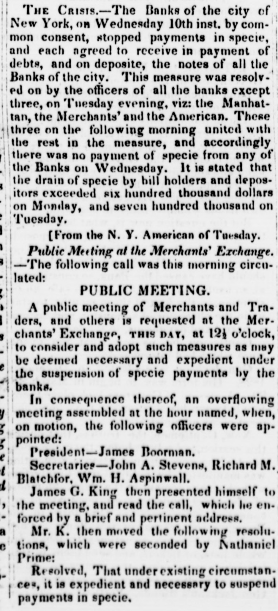 In contemplation of the resumption of specie payments, by the banks of the city of New York, on, or before the tenth of May next, and under the uncertain contingency of a simultaneous or early resumption by the banks of some of the other great commercial cities, it is incumbent on those of New York to adont all the measures within the limits of their resources, which may enable them not only to resume, but also to maintain the specie payments.