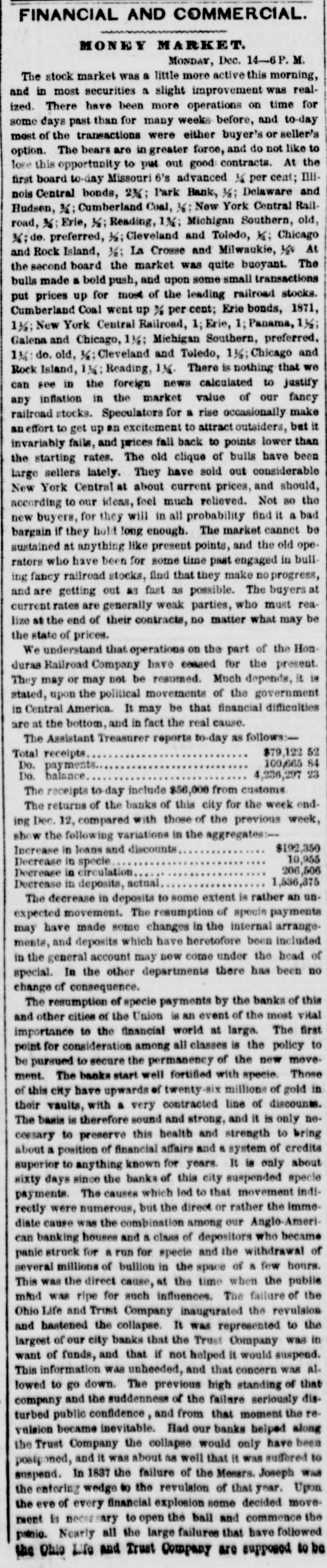 FINANCIAL AND COMMERCIAL. MONEY MARKET. MONDAY, Dec. 14-6 P M. The stock market was a little more active this morning, and in most securities a slight improvement was realized. There have been more operations on time for some days past than for many weeks before, and to-day most of the transactions were either buyer's or seller's option. The bears are in greater force, and do not like to lose this opportunity to put out good contracts. At the first board to-day Missouri 6's advanced ½ per cent; Illinois Central bonds, 2%; Park Bank, 3/2; Delaware and Hudson, %; Cumberland Coal, ½; New York Central Railroad, %; Erie, ½; Reading, 1%; Michigan Southern, old, 3/2; preferred, ½; Cleveland and Toledo, Va; Chicago and Rock Island, ½; La Crosse and Milwaukie, 3/20 At the second board the market was quite buoyant. The bulls made a bold push, and upon some small transactions put prices up for most of the leading railroad stocks. Cumberland Coal went up % per cent; Erie bonds, 1871, 1½; New York Central Railroad, 1; Erie, 1; Panama, 1½; Galena and Chicago, 1½; Michigan Southern, preferred. 13/4 do. old, 3/2; Cleveland and Toledo, 1½; Chicago and Rock Island, 1½; Reading, 11/4. There is nothing that we can see in the foreign news calculated to justify any inflation in the market value of our fancy railroad stocks. Speculators for a rise occasionally make an effort to get up an excitement to attract outsiders, but it invariably fails, and prices fall back to points lower than the starting rates. The old clique of bulls have been large sellers lately. They have sold out considerable New York Central at about current prices, and should, according to our ideas, feel much relieved. Not so the new buyers, for they will in all probability find it a bad bargain if they hold long enough. The market cannet be sustained at anything like present points, and the old operators who have been for some time past engaged in bulling fancy railroad stocks, find that they make no progress, and are getting out as fast as possible. The buyers at current rates are generally weak parties, who must realize at the end of their contracts, no matter what may be the state of prices. We understand that operations on the part of the Honduras Railroad Company have ceased for the present. They may or may not be resumed. Much depends, it is stated, upon the political movements of the government in Central America. It may be that financial difficulties are at the bottom, and in fact the real cause. The Assistant Treasurer reports to-day as follows:$79,122 52 Total receipts 100,665 84 Do. payments Do. balance 4,236,297 23 The receipts to-day include $56,000 from customs The returns of the banks of this city for the week ending Dec. 12, compared with those of the previous week, show the following variations in the aggregates:-$192,350 Increase in loans and discounts 10,955 Decrease in specie 206,506 Decrease in circulation 1,536,375 Decrease in deposits, actual The decrease in deposits to some extent is rather an unexpected movement. The resumption of specie payments may have made some changes in the internal arrangements, and deposits which have heretofore been included in the general account may now come under the head of special. In the other departments there has been no change of consequence. The resumption of specie payments by the banks of this and other cities of the Union is an event of the most vital importance to the financial world at large. The first point for consideration among all classes is the policy to be pursued to secure the permanency of the new movement. The banks start well fortified with specie. Those of this city have upwards of twenty-six millions of gold in their vaults, with a very contracted line of discounts. The basis is therefore sound and strong, and it is only necessary to preserve this health and strength to bring about a position of financial affairs and a system of credits superior to anything known for years. It is only about sixty days since the banks of this city suspended specie payments. The causes which led to that movement indirectly were numerous, but the direct or rather the immediate cause was the combination among our Anglo-American banking houses and a class of depositors who became panic struck for a run for specie and the withdrawal of several millions of bullion in the space of a few hours. This was the direct cause, at the time when the public mind was ripe for such influences. The failure of the Ohio Life and Trust Company inaugurated the revulsion and bastened the collapse. It was represented to the largest of our city banks that the Trust Company was in want of funds, and that if not helped it would suspend. This information was unheeded, and that concern was allowed to go down. The previous high standing of that company and the suddenness of the failure seriously disturbed public confidence, and from that moment the revulsion became inevitable. Had our banks helped along the Trust Company the collapse would only have been postponed, and it was about as well that it was suffered to suspend. In 1837 the failure of the Messrs. Joseph Was the entering wedge to the revulsion of that year. Upon the eve of every financial explosion some decided movement is necessary to open the ball and commence the panio. Nearly all the large failures that have followed the Ohio Life and Trust Company are supposed to be