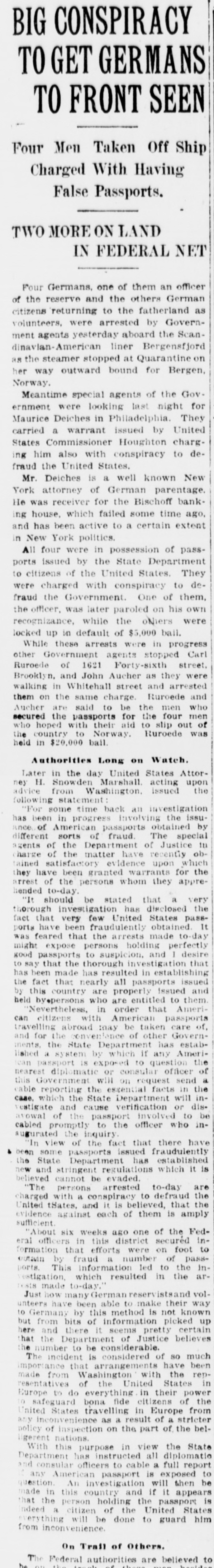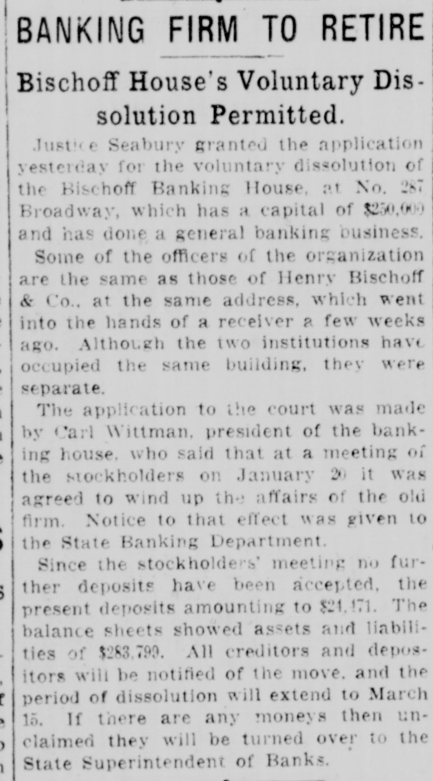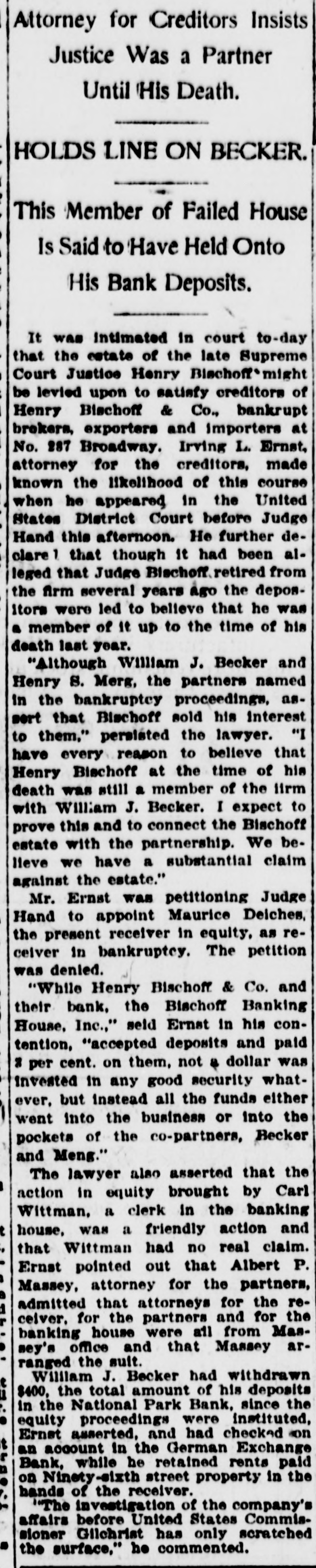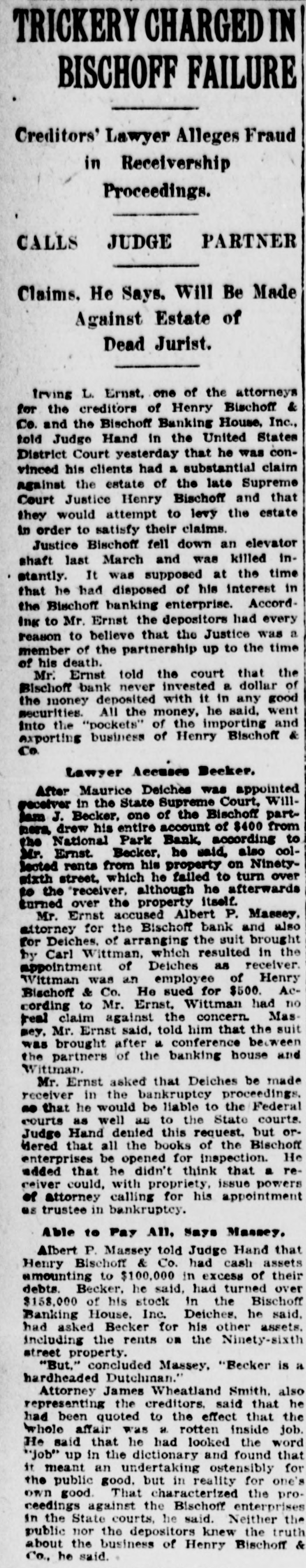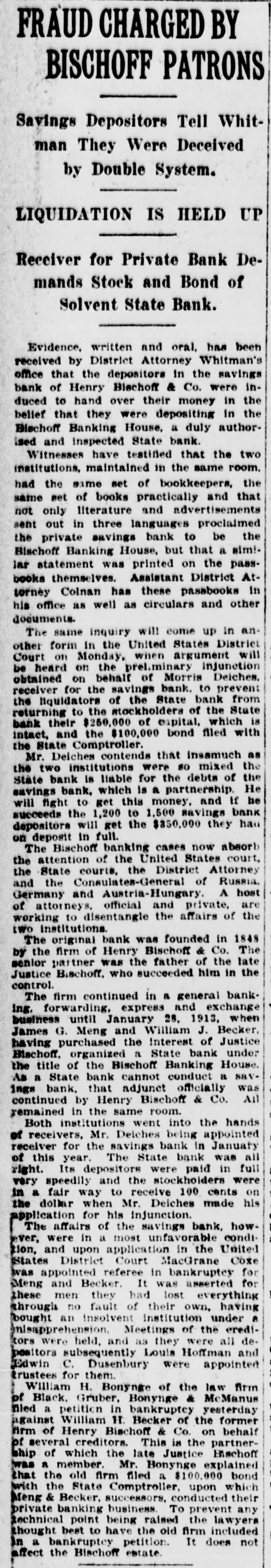 FRAUD CHARGED BY BISCHOFF PATRONS Savings Depositors Tell Whitman They Were Deceived by Double System. LIQUIDATION IS HELD UP Receiver for Private Bank Demands Stock and Bond of Solvent State Bank. Evidence, written and oral, has been received by District Attorney Whitman's office that the depositors in the savings bank of Henry Bischoff & Co. were induced to hand over their money in the belief that they were depositing In the Bischoff Banking House, a duly authorised and inspected State bank. Witnesses have testified that the two institutions, maintained in the same room. had the same set of bookkeepers, the same set of books practically and that not only literature and advertisements sent out in three languages proclaimed the private savings bank to be the Bischoff Banking House, but that a similar statement was printed on the passbooks themselves. Assistant District Attorney Colnan has these passbooks in his office as well as circulars and other documents. The same inquiry will come up in another form in the United States District Court on Monday, when argument will be heard on the prel.minary injunction obtained on behalf of Morris Deiches. receiver for the savings bank. to prevent the liquidators of the State bank from returning to the stockholders of the State bank their $250,000 of capital, which is intact, and the $100,000 bond filed with the State Comptroller. Mr. Deiches contends that inssmuch as the two institutions were 80 mixed the State bank is liable for the debts of the savings bank, which is a partnership. He will fight to get this money, and If he succeeds the 1,200 to 1,500 savings bank depositors will get the $350,000 they has on deposit in full. The Bischoff banking cases now absorb the attention of the United States court, the State courts, the District Attorney and the Consulates-General of Russia. Germany and Austria-Hungary. A host of attorneys, official and private, are working to disentangle the affairs of the two institutions. The original bank was founded in 1848 by the firm of Henry Bischoff & Co. The senior partner was the father of the late Justice Bischoff, who succeeded him in the control. The firm continued in a general banking, forwarding, express and exchange business until January 28, 1913, when James G. Meng and William J. Becker, having purchased the interest of Justice Bischoff. organized a State bank under the title of the Bischoff Banking House. As a State bank cannot conduct a savings bank, that adjunct officially was continued by Henry Bischoff & Co. All remained in the same room. Both institutions went into the hands of receivers, Mr. Deiches being appointed receiver for the savings bank in January of this year. The State bank was all right. Its depositors were paid in full very speedily and the stockholders were in a fair way to receive 100 cents on the dollar when Mr. Deiches made his application for his injunction. The affairs of the savings bank, however, were in a most unfavorable condition, and upon application in the United States District Court MacGrane Coxe was appointed referee in bankruptcy for Meng and Becker. It was asserted for these men they had lost everything through no fault of their own, having bought an insolvent institution under a misapprehension. Meetings of the ereditors were held, and as they were all depositors subsequently Louis Hoffman and Edwin C. Dusenbury were appointed trustees for them. William H. Bonynge of the law firm of Black. Gruber, Bonynge & McManus filed a petition in bankruptey yesterday against William H. Becker of the former firm of Henry Bischoff & Co. on behalf of several creditors. This is the partnership of which the late Justice Bischoff was a member. Mr. Bonynge explained that the old firm filed a $100,000 bond with the State Comptroller, upon which Meng & Becker, successors, conducted their private banking business. To prevent any technical point being raised the lawyers thought best to have the old firm included in a bankruptcy petition It does not affect the Bischoff estate.