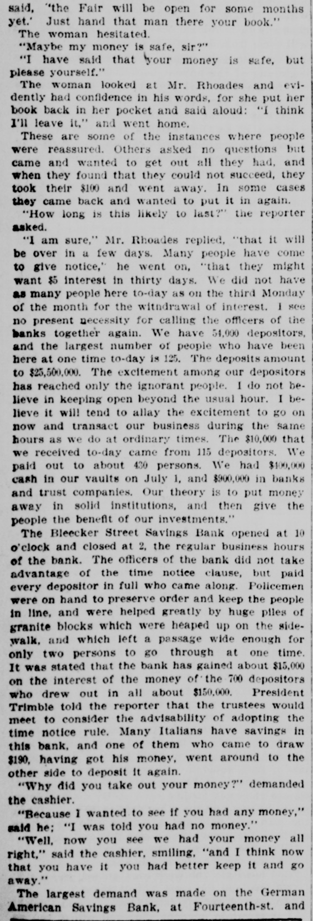 A RUSH OF DEPOSITORS Chaotic Crowds Congregate About the Banks AND OLAMOR FOR DEPOSITED CASH New York All Astir Over the Bank Regulations Which Went Into Effect This Morning-Police Had to Be Called Upon Early This Afternoon-Business Disturbances of To-day. NEW YORK, July 31. In many of the savings banks notices was pasted to day to the effect the bank of withdrawal rule adopted by the savings banks last|week was in effect. One or two banks made the limit of withdrawal 100 requiring the legal notice for withdrawal of greater sums. The action of the banks has not caused what might be called 8 panie, but there were heavy withdrawals at most of the savings banks and doubtless the check on depositors will go into effect generally to-morrow. At the Seaman's Savings Bank there were 250 people demanding their money; at the Dry Dock Savings Bank, 500; at the Bowery Savings Bank, 200; at the the Union Dime Savings oBank, 150; at German Savings Bank, 300; at the Bleecker Street Savings Bank, 400. At the latter institution the crowd was so e haotic and disorderly that the police were sent for. The police formed the crowd in line and each depositor drew out all his book called for. The legal notice was not asked for by the bank, but the directors will probably order the rule enforced after to-day Bankers are of the opinion that if the rule is not enforced to-morrow a senseless run will result and millions of dollars taken out of circuit. All the banks are sound and their money is well invested but to force the instant payment of the immense sums deposited would wreck many of them. In Brooklyn, Williamsburgh and in several cities throughout the state heavy withdrawal deposits are reported. Several Brooklyn banks compelled depositors to give the legal notice but the rules have not gone into effect generally. The crowds at the savings banks increased toward noon and 'at that hour most of the savings institutions posted the rule governing withdrawals. Money at noon on the stock exchange was 48 per cent. and the Clearing House Loan Committee issued a million dollars worth of clearing house certificates with a promise of a million more before the day ended to ease the market. Nearly half a million of gold came from Havanna to-day and half a million was started from London to New York,