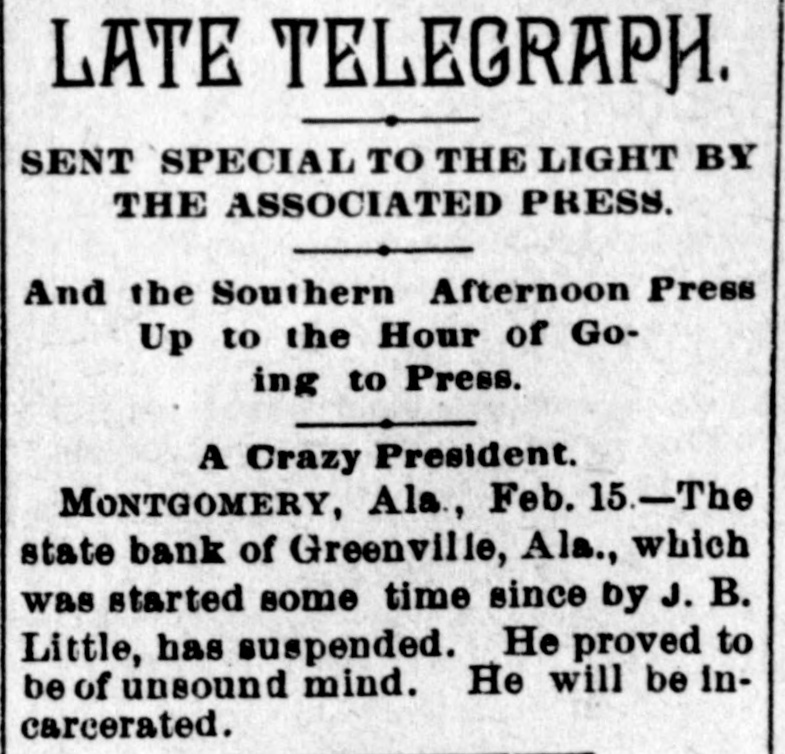 LATE TELEGRAPH. SENT SPECIAL TO THE LIGHT BY THE ASSOCIATED PRESS. And the Southern Afternoon Press Up to the Hour of Going to Press. A Crazy President. MONTGOMERY, Ala, Feb. 15-The state bank of Greenville, Ala., which was started some time since by J. B. Little, has suspended. He proved to be of unsound mind. He will be incarcerated.