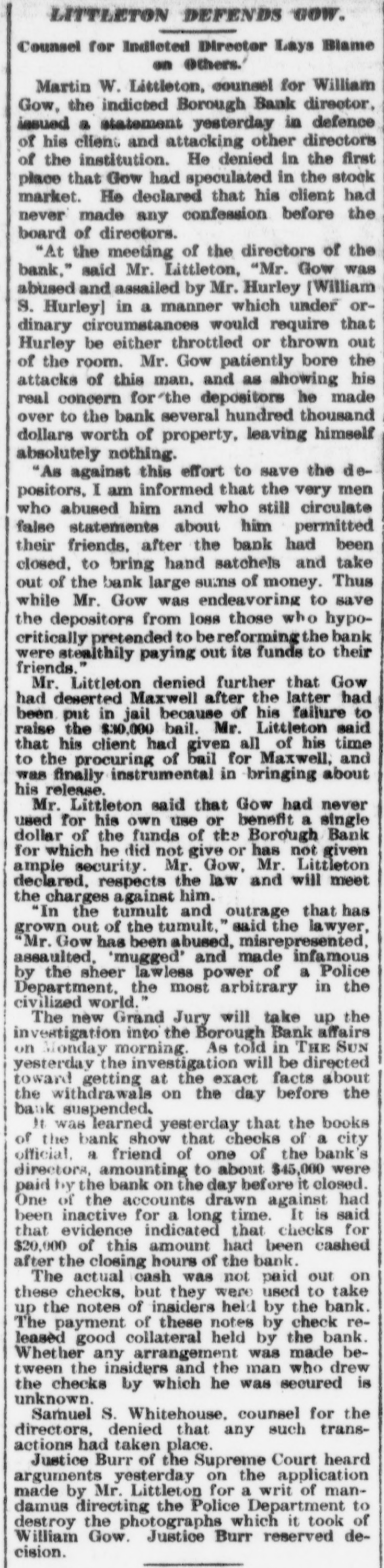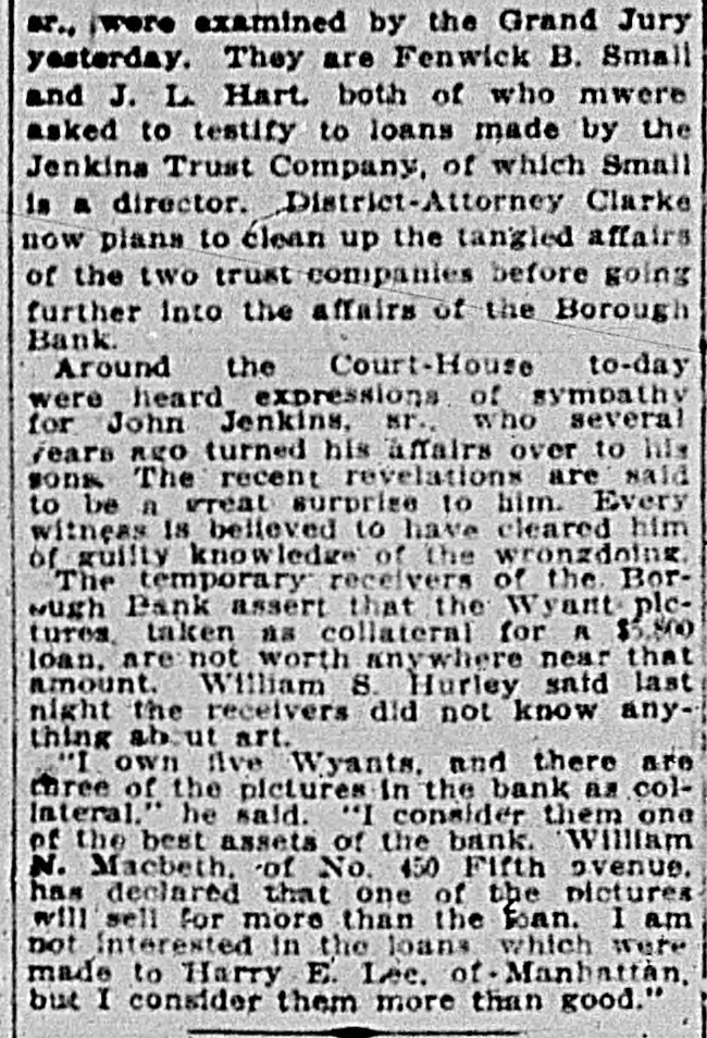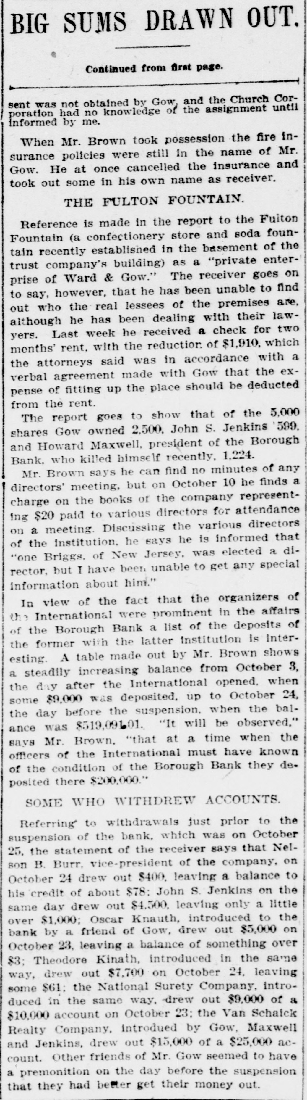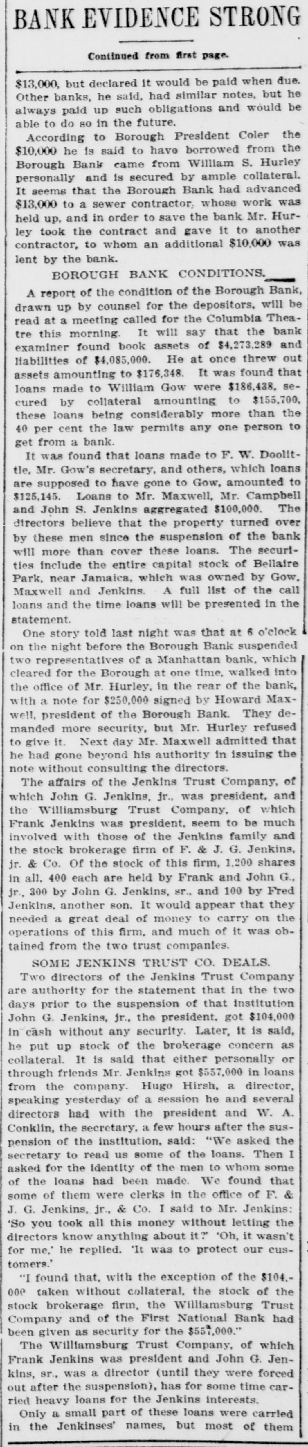 BANK EVIDENCE STRONG Continued from first page. $13,000, but declared it would be paid when due. Other banks, he said, had similar notes, but he always paid up such obligations and would be able to do so in the future. According to Borough President Coler the $10,000 he is said to have borrowed from the Borough Bank came from William S. Hurley personally and is secured by ample collateral. It seems that the Borough Bank had advanced $13,000 to a sewer contractor whose work was held up, and in order to save the bank Mr. Hurley took the contract and gave it to another contractor, to whom an additional $10,000 was lent by the bank. BOROUGH BANK CONDITIONS. A report of the condition of the Borough Bank, drawn up by counsel for the depositors, will be read at a meeting called for the Columbia Theatre this morning. It will say that the bank examiner found book assets of $4,273,289 and liabilities of $4,085,000. He at once threw out assets amounting to $176,348. It was found that loans made to William Gow were $186,438. secured by collateral amounting to $155,700. these loans being considerably more than the 40 per cent the law permits any one person to get from a bank. It was found that loans made to F. W. Doolittle, Mr. Gow's secretary, and others, which loans are supposed to have gone to Gow, amounted to $125,145. Loans to Mr. Maxwell, Mr. Campbell and John S. Jenkins aggregated $100,000. The directors believe that the property turned over by these men since the suspension of the bank will more than cover these loans. The securtties include the entire capital stock of Bellaire Park, near Jamaica, which was owned by Gow, Maxwell and Jenkins. A full list of the call loans and the time loans will be presented in the statement. One story told last night was that at 6 o'clock on the night before the Borough Bank suspended two representatives of a Manhattan bank, which cleared for the Borough at one time, walked into the office of Mr. Hurley, in the rear of the bank, with a note for $250,000 signed by Howard Maxwell, president of the Borough Bank. They demanded more security, but Mr. Hurley refused to give it. Next day Mr. Maxwell admitted that he had gone beyond his authority in issuing the note without consulting the directors. The affairs of the Jenkins Trust Company, of which John G. Jenkins, jr., was president, and the Williamsburg Trust Company, of which Frank Jenkins was president, seem to be much involved with those of the Jenkins family and the stock brokerage firm of F. & J. G. Jenkins, jr. & Co. Of the stock of this firm, 1,200 shares in all, 400 each are held by Frank and John G., jr., 300 by John G. Jenkins, sr., and 100 by Fred Jenkins, another son. It would appear that they needed a great deal of money to carry on the operations of this firm, and much of it was obtained from the two trust companies. SOME JENKINS TRUST CO. DEALS. Two directors of the Jenkins Trust Company are authority for the statement that in the two days prior to the suspension of that institution John G. Jenkins, jr., the president, got $104,000 in cash without any security. Later, it is said, he put up stock of the brokerage concern as collateral. It is said that either personally or through friends Mr. Jenkins got $557,000 in loans from the company. Hugo Hirsh, a director, speaking yesterday of a session he and several directors had with the president and W. A. Conklin, the secretary. a few hours after the suspension of the institution, said: "We asked the secretary to read us some of the loans. Then I asked for the identity of the men to whom some of the loans had been made. We found that some of them were clerks in the office of F. & J. G. Jenkins, jr., & Co. I said to Mr. Jenkins: 'So you took all this money without letting the directors know anything about it?" 'Oh, it wasn't for me, he replied. 'It was to protect our customers.' "I found that, with the exception of the $104.000 taken without collateral, the stock of the stock brokerage firm, the Williamsburg Trust Company and of the First National Bank had been given as security for the $557,000." The Williamsburg Trust Company, of which Frank Jenkins was president and John G. Jenkins, sr., was a director (until they were forced out after the suspension), has for some time carried heavy loans for the Jenkins interests. Only a small part of these loans were carried in the Jenkinses' names, but most of them