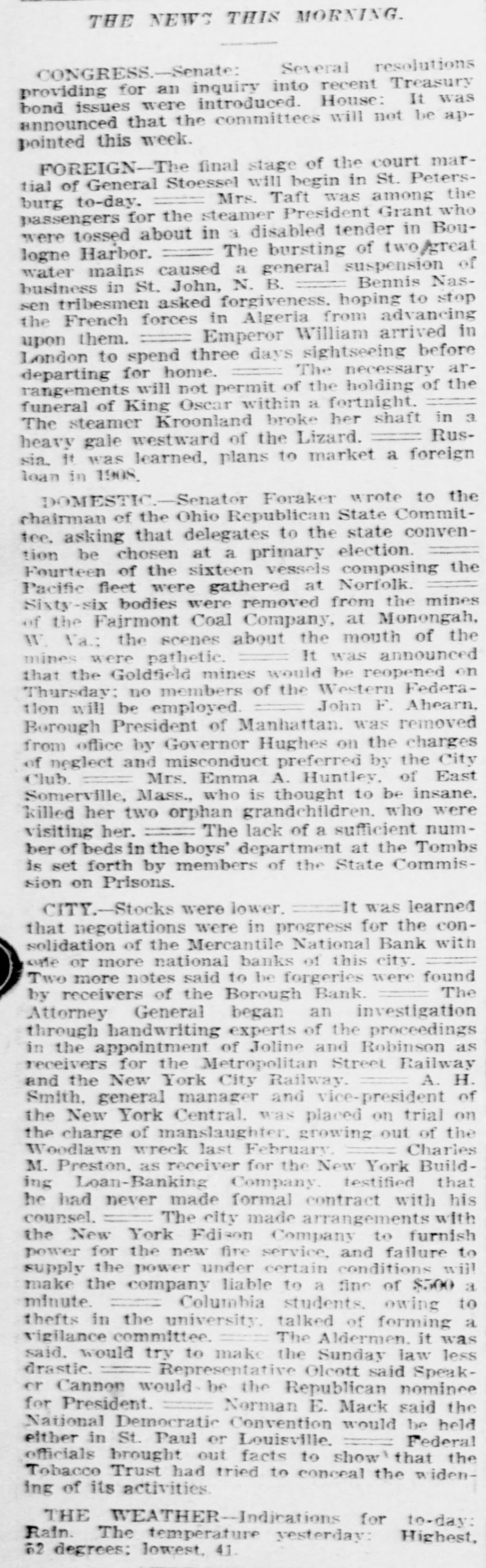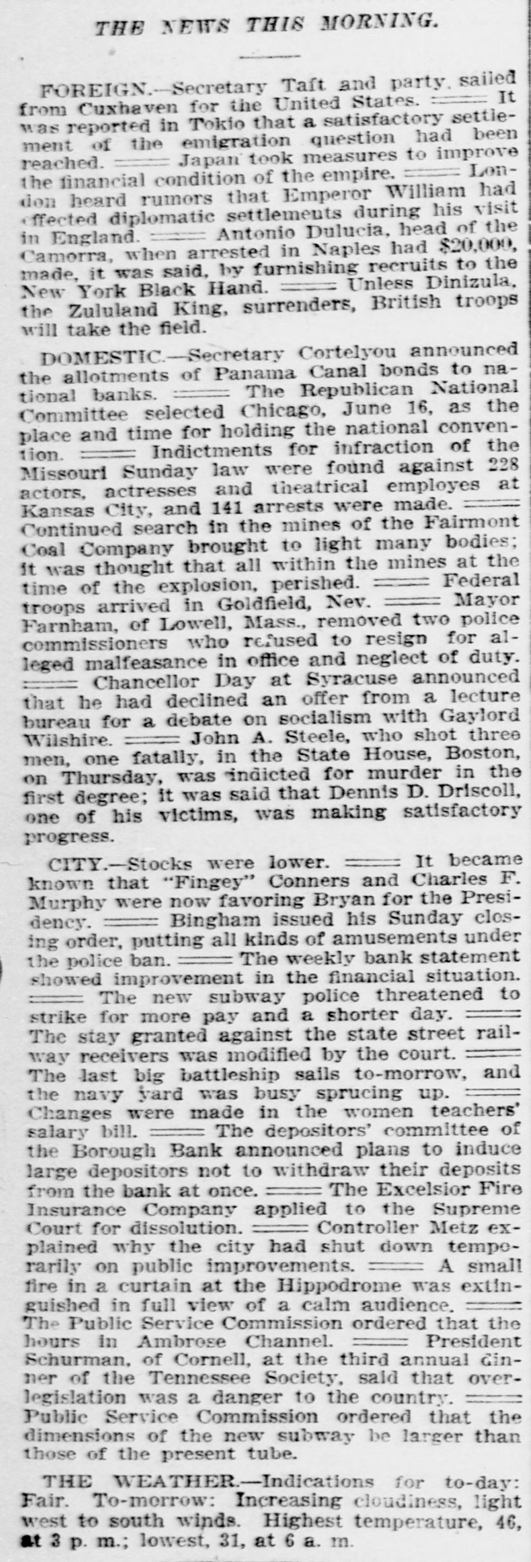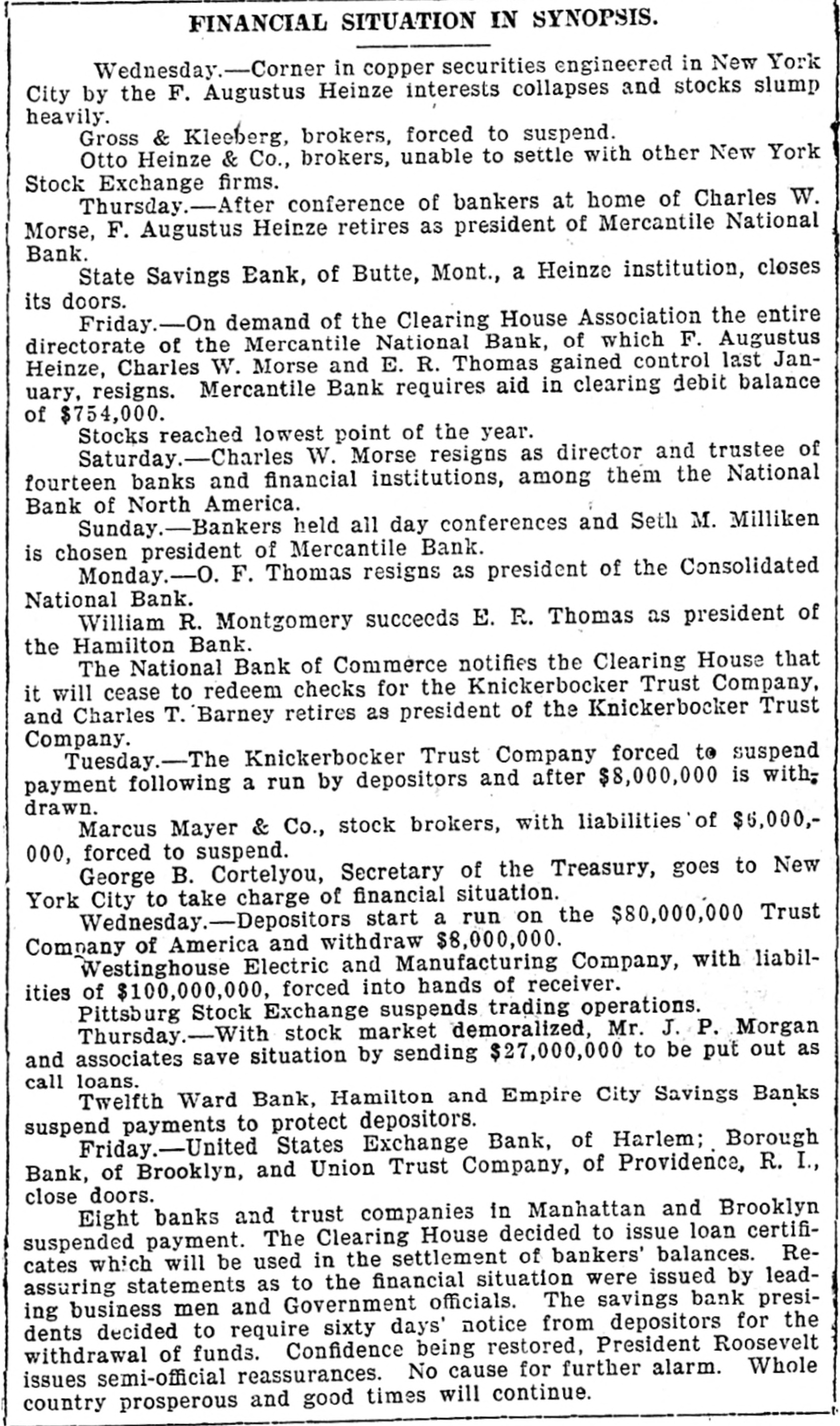 BANK EVIDENCE STRONG Continued from first page. $13,000, but declared it would be paid when due. Other banks, he said, had similar notes, but he always paid up such obligations and would be able to do so in the future. According to Borough President Coler the $10,000 he is said to have borrowed from the Borough Bank came from William S. Hurley personally and is secured by ample collateral. It seems that the Borough Bank had advanced $13,000 to a sewer contractor whose work was held up, and in order to save the bank Mr. Hurley took the contract and gave it to another contractor, to whom an additional $10,000 was lent by the bank. BOROUGH BANK CONDITIONS. A report of the condition of the Borough Bank, drawn up by counsel for the depositors, will be read at a meeting called for the Columbia Theatre this morning. It will say that the bank examiner found book assets of $4,273,289 and liabilities of $4,085,000. He at once threw out assets amounting to $176,348. It was found that loans made to William Gow were $186,438. secured by collateral amounting to $155,700. these loans being considerably more than the 40 per cent the law permits any one person to get from a bank. It was found that loans made to F. W. Doolittle, Mr. Gow's secretary, and others, which loans are supposed to have gone to Gow, amounted to $125,145. Loans to Mr. Maxwell, Mr. Campbell and John S. Jenkins aggregated $100,000. The directors believe that the property turned over by these men since the suspension of the bank will more than cover these loans. The securtties include the entire capital stock of Bellaire Park, near Jamaica, which was owned by Gow, Maxwell and Jenkins. A full list of the call loans and the time loans will be presented in the statement. One story told last night was that at 6 o'clock on the night before the Borough Bank suspended two representatives of a Manhattan bank, which cleared for the Borough at one time, walked into the office of Mr. Hurley, in the rear of the bank, with a note for $250,000 signed by Howard Maxwell, president of the Borough Bank. They demanded more security, but Mr. Hurley refused to give it. Next day Mr. Maxwell admitted that he had gone beyond his authority in issuing the note without consulting the directors. The affairs of the Jenkins Trust Company, of which John G. Jenkins, jr., was president, and the Williamsburg Trust Company, of which Frank Jenkins was president, seem to be much involved with those of the Jenkins family and the stock brokerage firm of F. & J. G. Jenkins, jr. & Co. Of the stock of this firm, 1,200 shares in all, 400 each are held by Frank and John G., jr., 300 by John G. Jenkins, sr., and 100 by Fred Jenkins, another son. It would appear that they needed a great deal of money to carry on the operations of this firm, and much of it was obtained from the two trust companies. SOME JENKINS TRUST CO. DEALS. Two directors of the Jenkins Trust Company are authority for the statement that in the two days prior to the suspension of that institution John G. Jenkins, jr., the president, got $104,000 in cash without any security. Later, it is said, he put up stock of the brokerage concern as collateral. It is said that either personally or through friends Mr. Jenkins got $557,000 in loans from the company. Hugo Hirsh, a director, speaking yesterday of a session he and several directors had with the president and W. A. Conklin, the secretary. a few hours after the suspension of the institution, said: "We asked the secretary to read us some of the loans. Then I asked for the identity of the men to whom some of the loans had been made. We found that some of them were clerks in the office of F. & J. G. Jenkins, jr., & Co. I said to Mr. Jenkins: 'So you took all this money without letting the directors know anything about it?" 'Oh, it wasn't for me, he replied. 'It was to protect our customers.' "I found that, with the exception of the $104.000 taken without collateral, the stock of the stock brokerage firm, the Williamsburg Trust Company and of the First National Bank had been given as security for the $557,000." The Williamsburg Trust Company, of which Frank Jenkins was president and John G. Jenkins, sr., was a director (until they were forced out after the suspension), has for some time carried heavy loans for the Jenkins interests. Only a small part of these loans were carried in the Jenkinses' names, but most of them