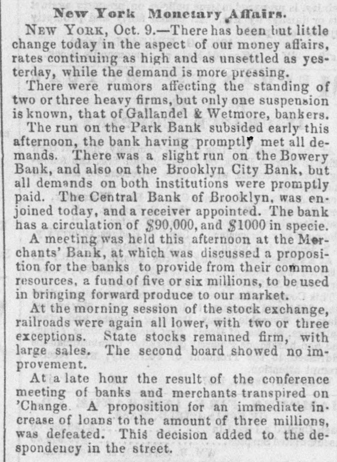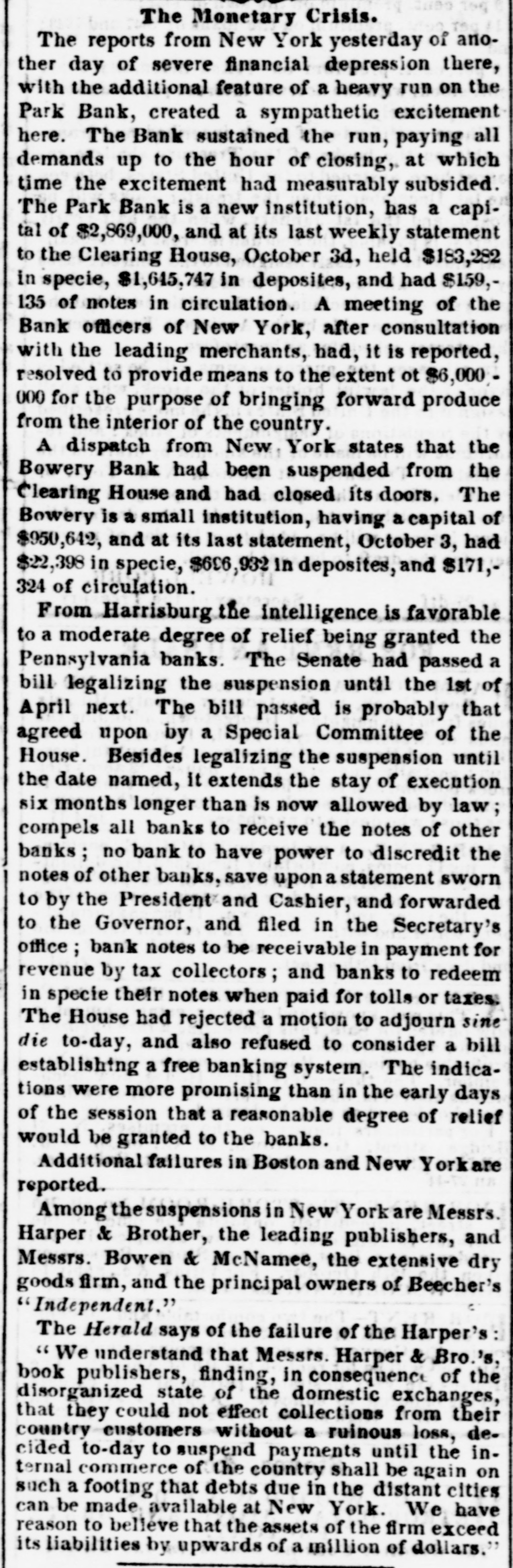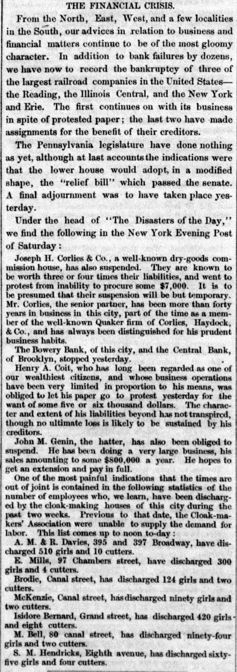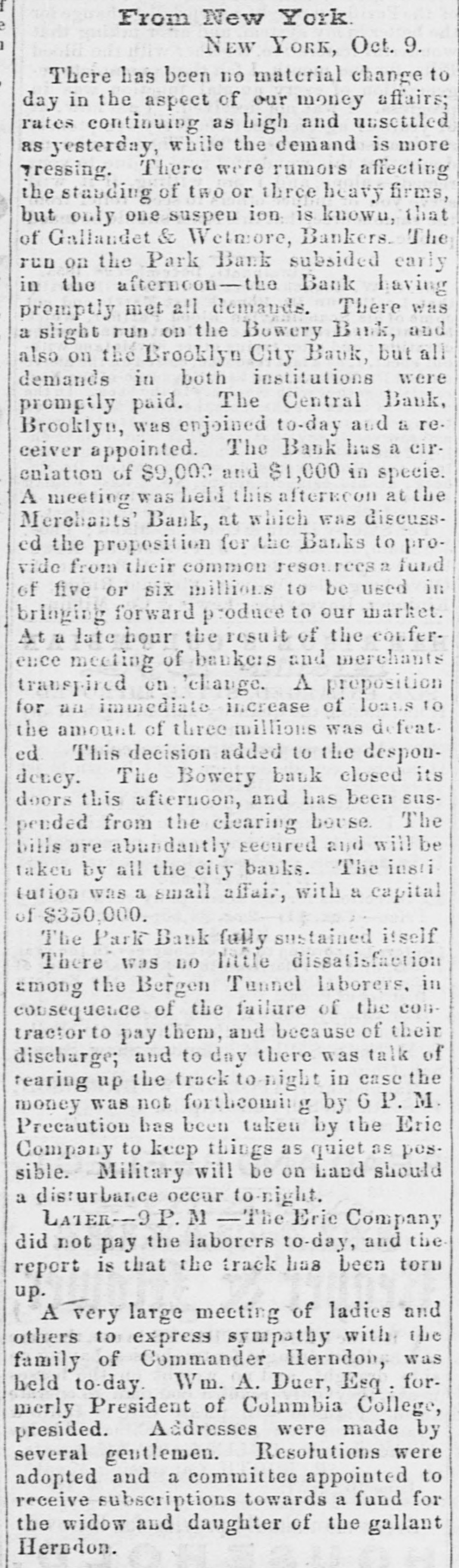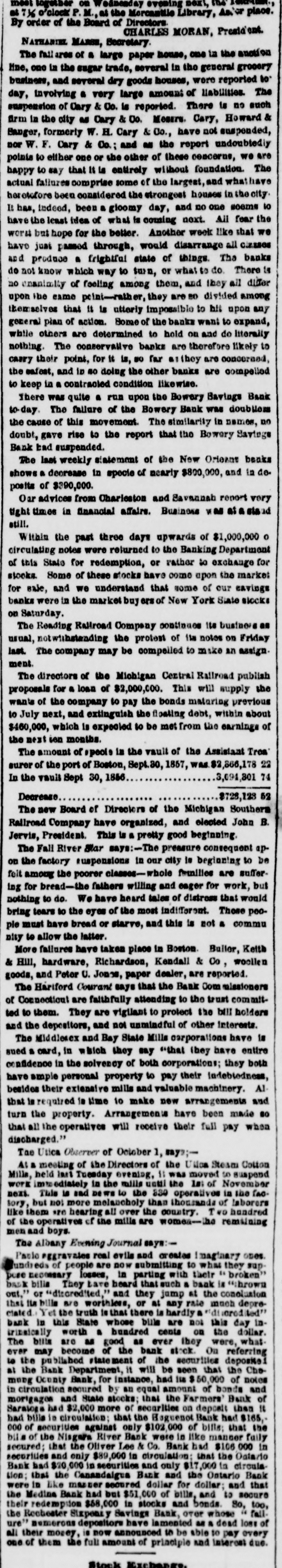 meet together on Wednesday evening next, the at 716 o'clock P. M., at the Mercantile Library, Ander place. By order of the Board of Directors. CHARLES MORAN, President. NATHANIEL MARSE, Secretary. The fail ares of a large paper house, one in the anotion line, one in the sugar trade, several in the general grocery business, and several dry goods houses, were reported to: day, involving a very large amount of liabilities. The suspension of Cary & Do. is reported. There is no such firm in the city as Cary & Do. Mesers. Cary, Howard & Banger, formerly W. H. Cary & Co., have not suspended, nor W. F. Cary & Oo.: and as the report undoubtedly points to either one or the other of these concerns, we are happy to say that It is entirely without foundation. The actual failures comprise some of the largest, and whathave heretofore been considered the strongest houses in the city. It has, indeed, been a gloomy day, and no one seems to have the least idea of what is coming next. All fear the worst but hope for the better. Another week like that we have just passed through, would disarrange all Classes and produce a frightful state of things. The banks do not know which way to twn, or what to do. There is no unanimity of feeling among them, and they all differ upon the came print-rather, they are so divided among themselves that It is utterly impossible to his upon any general plan of action. Some of the banks want to expand, while others are determined to hold on and do literally nothing. The conservative banks are therefore likely to carry their point, for it is, NO far they are concerned, the safest, and in so doing the other banks are competted to keep in a contracted condition likewise. There was quite a run upon the Bowery Bavings Bank to-day. The failure of the Bowery Bank was doubliers the cause of this movement. The similarity in names, no doubt, gave rise to the report that the Bowery Savings Bank bad suspended. The last weekly sistement of the New Oriens banks shows a decrease in specie of nearly $800,000, and in deposits of $390,000. Oar advices from Charleston and Savannah report very tight times in financial affairs. Business MM at a stand still. Within the past three days upwards of $1,000,000 0 circulating notes were returned to the Banking Department of this State for redemption, or rather to exchange for stocks. Some of these stocks have come upon the market for sale, and we understand that some of our savings banks were in the market ers of New York State stocks on Saturday. The Reading Railroad Company continues its business as usual, notwishstanding the protest of its notes on Friday last. The company may be compelled to make an assign. ment. The directors of the Michigan Central Railroad publish proposals for a loan of $2,000,000. This will supply the wants of the company to pay the bonds maturing previous to July next, and extinguish the floating debt, within about $460,000, which is expected to be met from the earnings of the next sen months. The amount of specis in the vault of the Assistant Trea surer of the port of Boston, Sept.30, 1857, was $2,866,178 22 3,094,301 74 In the vault Sept 30, 1856 Decrease $728,123 52 The new Board of Directors of the Michigan Southern Railroad Company have organized, and elected John B. Jervis, President. This is a pretty good beginning. The Fall River Star says:-The pressure consequent apon the factory suspensions in our city is beginning to be felt among the poorer classes-whole families are suffering for bread-the fathers willing and enger for work, but nothing to do. We have heard tales of distross that would bring tears to the eyes of the most indifferent. These people must have bread or starve, and this is not a commu nity to allow the latter. More failures have taken place in Boston. Buller, Keith & Hill, hardware, Richardson, Kendall & Co woollen goods, and Peter U. Jones, paper dealer, are reported. The Hariford Courant says that the Bank Com missioners of Connecticut are faithfully attending to the trust committed to them. They are vigilant to protect the bill holders and the depositors, and not unmindful of other interests. The Middlesex and Bay State Mills cerporations have is sued a card, in which they say "that they have entire confidence in the solvency of both corporations; they both have ample personal property to pay their indebiedness, besides their extensive mills and valuable machinery. AIthat is required is time to make new arrangements and turn the property. Arrangements have been made so that all the operatives will receive their full pay when discharged." Tae Utica Observer of October 1, mys:At a meeting of the Directors of the Ulion Steam Cotton Mills, held last Tuesday ovening, 11 was moved to suspend work immediately in the mills until the Is: of November next. This is sad news to the 839 operatives in the (aoBory, but not more melancholy than thousands of laborers like them *** hearing all over the country. T 40 hundred of the operatives of the mills are womea-the remaining and boys. The Albany Evening Journal says:Pasio regravates real ovils and creates maginary ones. fundreds of people are now submitting to what they suppose necessary losses, in parting with their " broken" bank bills They have heard that such a bank is "thrown out," or "discredited, and they jump at the conclusion that its bills are worthless, or at any rate much depreclated. Yet the truth is that there is hardly a bank in this State whose bills are not this day intrinsically worth a hundred cents on the dollar. The bills are as good as over they were, whatever may become of the bank stock. On referring to the published vistement of the securities deposite at the Bank Department, it will be seen that the Chemung Ocunty Bank, for instance, had iss 000 of notes in circulation secured by an equal amount of bonds and mortgages and State stocks; that the Farmers' Bank of Saratoga had $2,000 more of securities on deposit than It had bills in circulatio