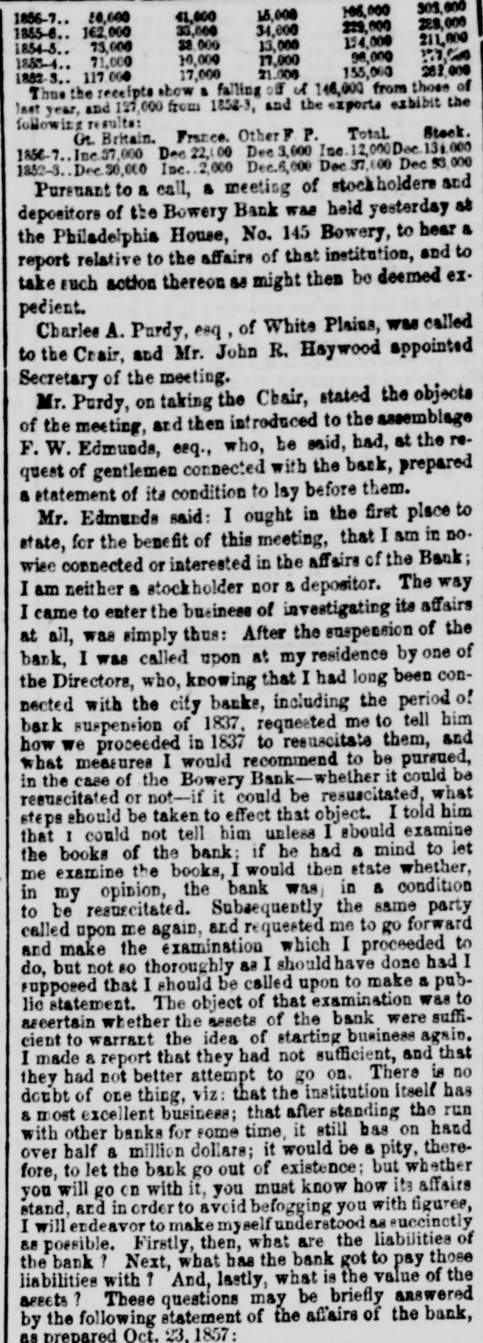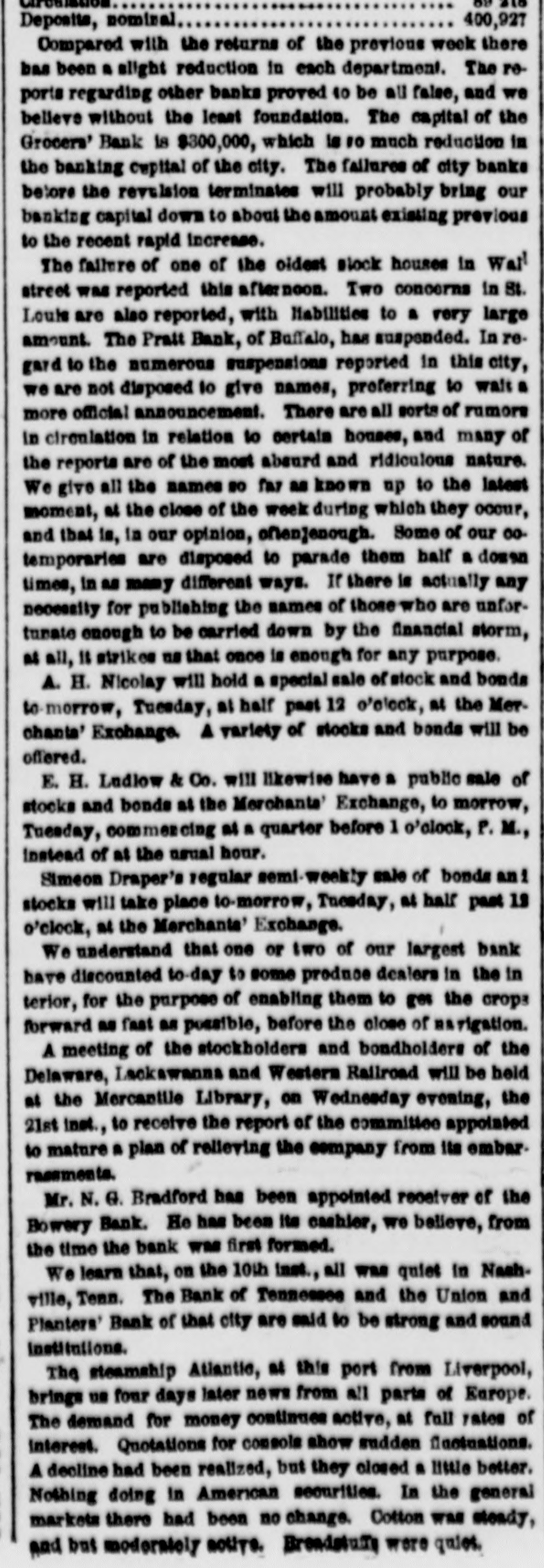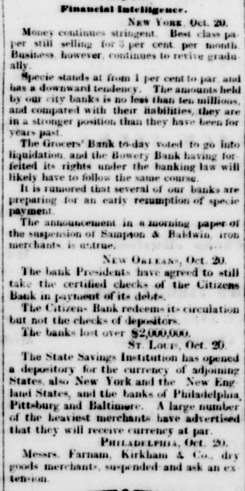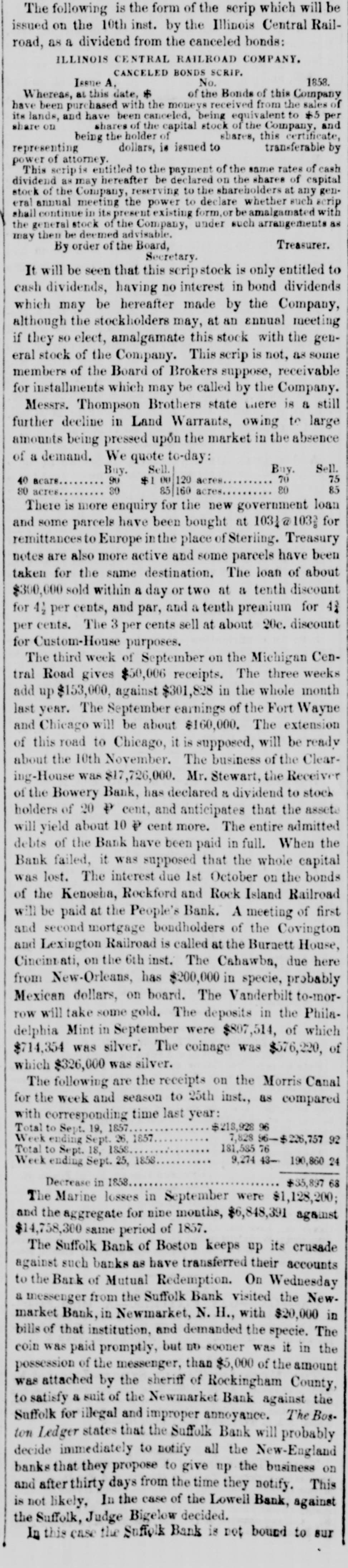 meet together on Wednesday evening next, the at 716 o'clock P. M., at the Mercantile Library, Ander place. By order of the Board of Directors. CHARLES MORAN, President. NATHANIEL MARSE, Secretary. The fail ares of a large paper house, one in the anotion line, one in the sugar trade, several in the general grocery business, and several dry goods houses, were reported to: day, involving a very large amount of liabilities. The suspension of Cary & Do. is reported. There is no such firm in the city as Cary & Do. Mesers. Cary, Howard & Banger, formerly W. H. Cary & Co., have not suspended, nor W. F. Cary & Oo.: and as the report undoubtedly points to either one or the other of these concerns, we are happy to say that It is entirely without foundation. The actual failures comprise some of the largest, and whathave heretofore been considered the strongest houses in the city. It has, indeed, been a gloomy day, and no one seems to have the least idea of what is coming next. All fear the worst but hope for the better. Another week like that we have just passed through, would disarrange all Classes and produce a frightful state of things. The banks do not know which way to twn, or what to do. There is no unanimity of feeling among them, and they all differ upon the came print-rather, they are so divided among themselves that It is utterly impossible to his upon any general plan of action. Some of the banks want to expand, while others are determined to hold on and do literally nothing. The conservative banks are therefore likely to carry their point, for it is, NO far they are concerned, the safest, and in so doing the other banks are competted to keep in a contracted condition likewise. There was quite a run upon the Bowery Bavings Bank to-day. The failure of the Bowery Bank was doubliers the cause of this movement. The similarity in names, no doubt, gave rise to the report that the Bowery Savings Bank bad suspended. The last weekly sistement of the New Oriens banks shows a decrease in specie of nearly $800,000, and in deposits of $390,000. Oar advices from Charleston and Savannah report very tight times in financial affairs. Business MM at a stand still. Within the past three days upwards of $1,000,000 0 circulating notes were returned to the Banking Department of this State for redemption, or rather to exchange for stocks. Some of these stocks have come upon the market for sale, and we understand that some of our savings banks were in the market ers of New York State stocks on Saturday. The Reading Railroad Company continues its business as usual, notwishstanding the protest of its notes on Friday last. The company may be compelled to make an assign. ment. The directors of the Michigan Central Railroad publish proposals for a loan of $2,000,000. This will supply the wants of the company to pay the bonds maturing previous to July next, and extinguish the floating debt, within about $460,000, which is expected to be met from the earnings of the next sen months. The amount of specis in the vault of the Assistant Trea surer of the port of Boston, Sept.30, 1857, was $2,866,178 22 3,094,301 74 In the vault Sept 30, 1856 Decrease $728,123 52 The new Board of Directors of the Michigan Southern Railroad Company have organized, and elected John B. Jervis, President. This is a pretty good beginning. The Fall River Star says:-The pressure consequent apon the factory suspensions in our city is beginning to be felt among the poorer classes-whole families are suffering for bread-the fathers willing and enger for work, but nothing to do. We have heard tales of distross that would bring tears to the eyes of the most indifferent. These people must have bread or starve, and this is not a commu nity to allow the latter. More failures have taken place in Boston. Buller, Keith & Hill, hardware, Richardson, Kendall & Co woollen goods, and Peter U. Jones, paper dealer, are reported. The Hariford Courant says that the Bank Com missioners of Connecticut are faithfully attending to the trust committed to them. They are vigilant to protect the bill holders and the depositors, and not unmindful of other interests. The Middlesex and Bay State Mills cerporations have is sued a card, in which they say "that they have entire confidence in the solvency of both corporations; they both have ample personal property to pay their indebiedness, besides their extensive mills and valuable machinery. AIthat is required is time to make new arrangements and turn the property. Arrangements have been made so that all the operatives will receive their full pay when discharged." Tae Utica Observer of October 1, mys:At a meeting of the Directors of the Ulion Steam Cotton Mills, held last Tuesday ovening, 11 was moved to suspend work immediately in the mills until the Is: of November next. This is sad news to the 839 operatives in the (aoBory, but not more melancholy than thousands of laborers like them *** hearing all over the country. T 40 hundred of the operatives of the mills are womea-the remaining and boys. The Albany Evening Journal says:Pasio regravates real ovils and creates maginary ones. fundreds of people are now submitting to what they suppose necessary losses, in parting with their " broken" bank bills They have heard that such a bank is "thrown out," or "discredited, and they jump at the conclusion that its bills are worthless, or at any rate much depreclated. Yet the truth is that there is hardly a bank in this State whose bills are not this day intrinsically worth a hundred cents on the dollar. The bills are as good as over they were, whatever may become of the bank stock. On referring to the published vistement of the securities deposite at the Bank Department, it will be seen that the Chemung Ocunty Bank, for instance, had iss 000 of notes in circulation secured by an equal amount of bonds and mortgages and State stocks; that the Farmers' Bank of Saratoga had $2,000 more of securities on deposit than It had bills in circulatio