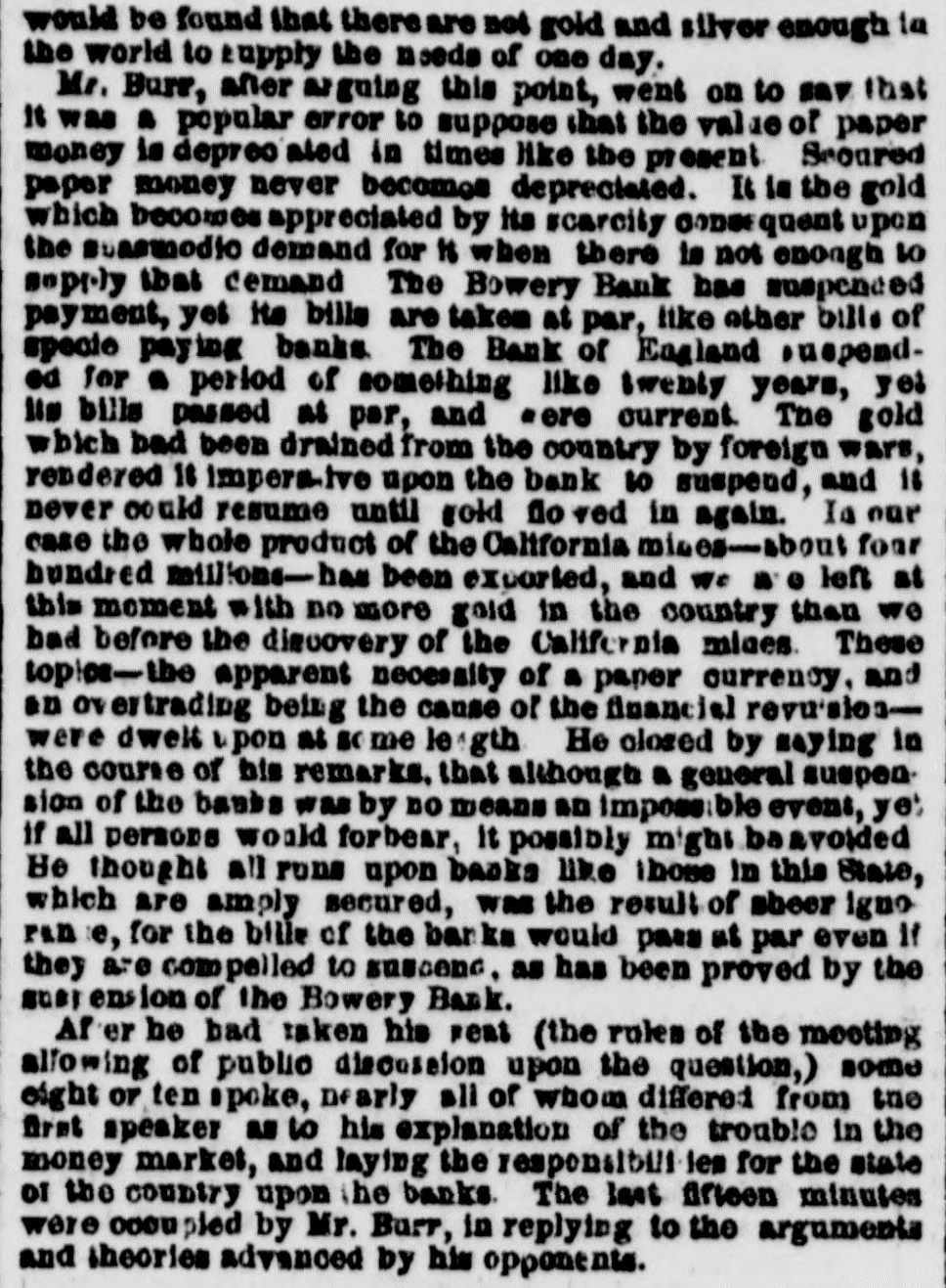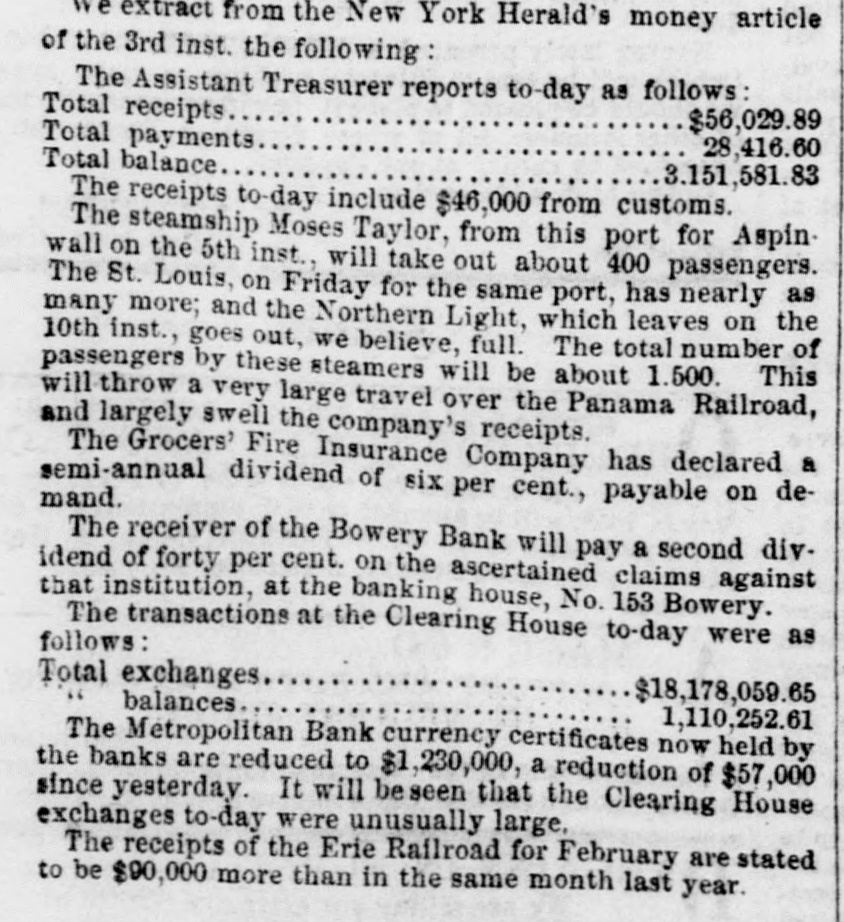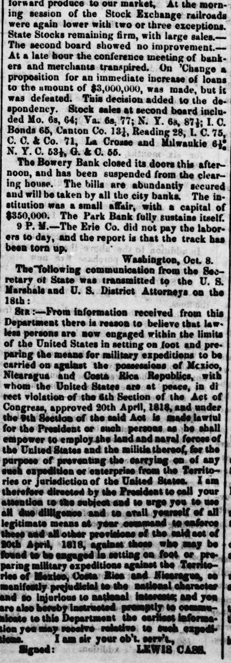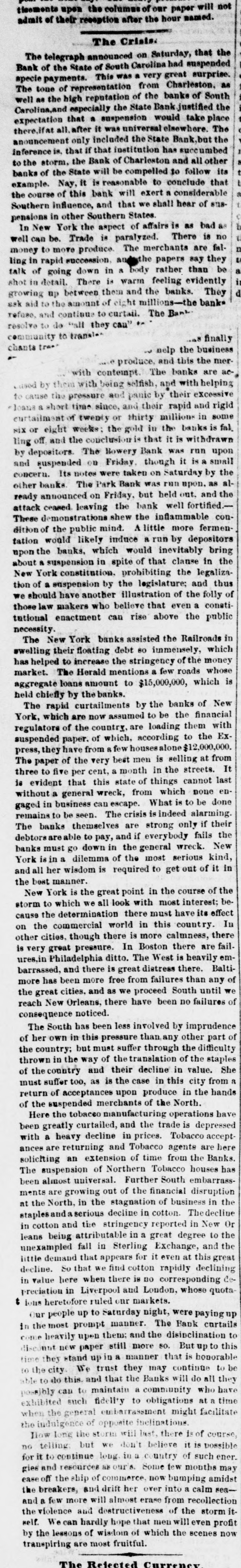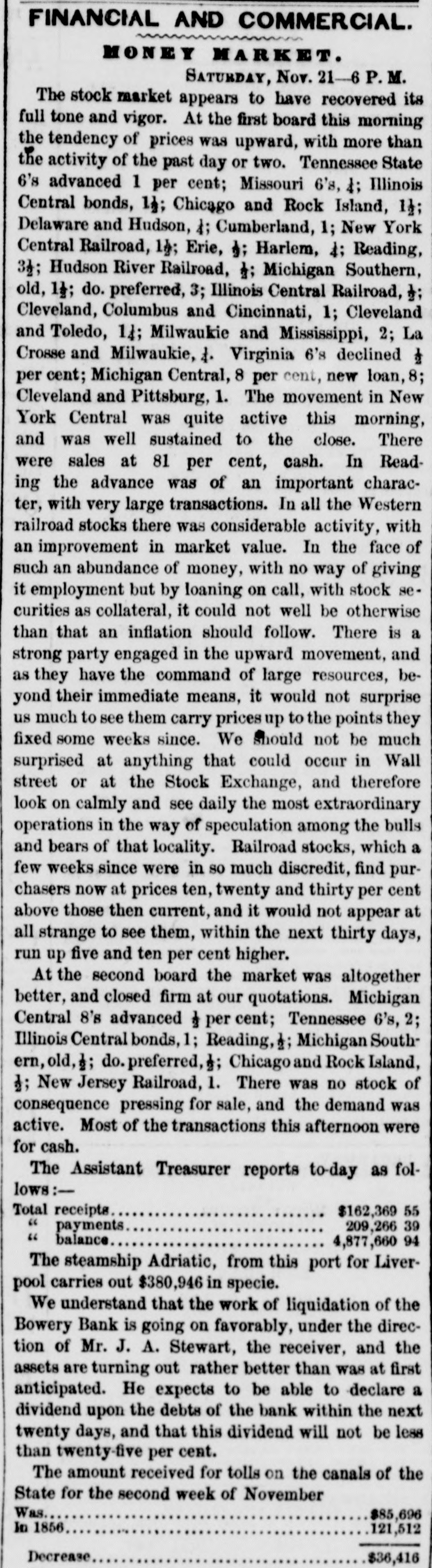 meet together on Wednesday evening next, the at 716 o'clock P. M., at the Mercantile Library, Ander place. By order of the Board of Directors. CHARLES MORAN, President. NATHANIEL MARSE, Secretary. The fail ares of a large paper house, one in the anotion line, one in the sugar trade, several in the general grocery business, and several dry goods houses, were reported to: day, involving a very large amount of liabilities. The suspension of Cary & Do. is reported. There is no such firm in the city as Cary & Do. Mesers. Cary, Howard & Banger, formerly W. H. Cary & Co., have not suspended, nor W. F. Cary & Oo.: and as the report undoubtedly points to either one or the other of these concerns, we are happy to say that It is entirely without foundation. The actual failures comprise some of the largest, and whathave heretofore been considered the strongest houses in the city. It has, indeed, been a gloomy day, and no one seems to have the least idea of what is coming next. All fear the worst but hope for the better. Another week like that we have just passed through, would disarrange all Classes and produce a frightful state of things. The banks do not know which way to twn, or what to do. There is no unanimity of feeling among them, and they all differ upon the came print-rather, they are so divided among themselves that It is utterly impossible to his upon any general plan of action. Some of the banks want to expand, while others are determined to hold on and do literally nothing. The conservative banks are therefore likely to carry their point, for it is, NO far they are concerned, the safest, and in so doing the other banks are competted to keep in a contracted condition likewise. There was quite a run upon the Bowery Bavings Bank to-day. The failure of the Bowery Bank was doubliers the cause of this movement. The similarity in names, no doubt, gave rise to the report that the Bowery Savings Bank bad suspended. The last weekly sistement of the New Oriens banks shows a decrease in specie of nearly $800,000, and in deposits of $390,000. Oar advices from Charleston and Savannah report very tight times in financial affairs. Business MM at a stand still. Within the past three days upwards of $1,000,000 0 circulating notes were returned to the Banking Department of this State for redemption, or rather to exchange for stocks. Some of these stocks have come upon the market for sale, and we understand that some of our savings banks were in the market ers of New York State stocks on Saturday. The Reading Railroad Company continues its business as usual, notwishstanding the protest of its notes on Friday last. The company may be compelled to make an assign. ment. The directors of the Michigan Central Railroad publish proposals for a loan of $2,000,000. This will supply the wants of the company to pay the bonds maturing previous to July next, and extinguish the floating debt, within about $460,000, which is expected to be met from the earnings of the next sen months. The amount of specis in the vault of the Assistant Trea surer of the port of Boston, Sept.30, 1857, was $2,866,178 22 3,094,301 74 In the vault Sept 30, 1856 Decrease $728,123 52 The new Board of Directors of the Michigan Southern Railroad Company have organized, and elected John B. Jervis, President. This is a pretty good beginning. The Fall River Star says:-The pressure consequent apon the factory suspensions in our city is beginning to be felt among the poorer classes-whole families are suffering for bread-the fathers willing and enger for work, but nothing to do. We have heard tales of distross that would bring tears to the eyes of the most indifferent. These people must have bread or starve, and this is not a commu nity to allow the latter. More failures have taken place in Boston. Buller, Keith & Hill, hardware, Richardson, Kendall & Co woollen goods, and Peter U. Jones, paper dealer, are reported. The Hariford Courant says that the Bank Com missioners of Connecticut are faithfully attending to the trust committed to them. They are vigilant to protect the bill holders and the depositors, and not unmindful of other interests. The Middlesex and Bay State Mills cerporations have is sued a card, in which they say "that they have entire confidence in the solvency of both corporations; they both have ample personal property to pay their indebiedness, besides their extensive mills and valuable machinery. AIthat is required is time to make new arrangements and turn the property. Arrangements have been made so that all the operatives will receive their full pay when discharged." Tae Utica Observer of October 1, mys:At a meeting of the Directors of the Ulion Steam Cotton Mills, held last Tuesday ovening, 11 was moved to suspend work immediately in the mills until the Is: of November next. This is sad news to the 839 operatives in the (aoBory, but not more melancholy than thousands of laborers like them *** hearing all over the country. T 40 hundred of the operatives of the mills are womea-the remaining and boys. The Albany Evening Journal says:Pasio regravates real ovils and creates maginary ones. fundreds of people are now submitting to what they suppose necessary losses, in parting with their " broken" bank bills They have heard that such a bank is "thrown out," or "discredited, and they jump at the conclusion that its bills are worthless, or at any rate much depreclated. Yet the truth is that there is hardly a bank in this State whose bills are not this day intrinsically worth a hundred cents on the dollar. The bills are as good as over they were, whatever may become of the bank stock. On referring to the published vistement of the securities deposite at the Bank Department, it will be seen that the Chemung Ocunty Bank, for instance, had iss 000 of notes in circulation secured by an equal amount of bonds and mortgages and State stocks; that the Farmers' Bank of Saratoga had $2,000 more of securities on deposit than It had bills in circulatio