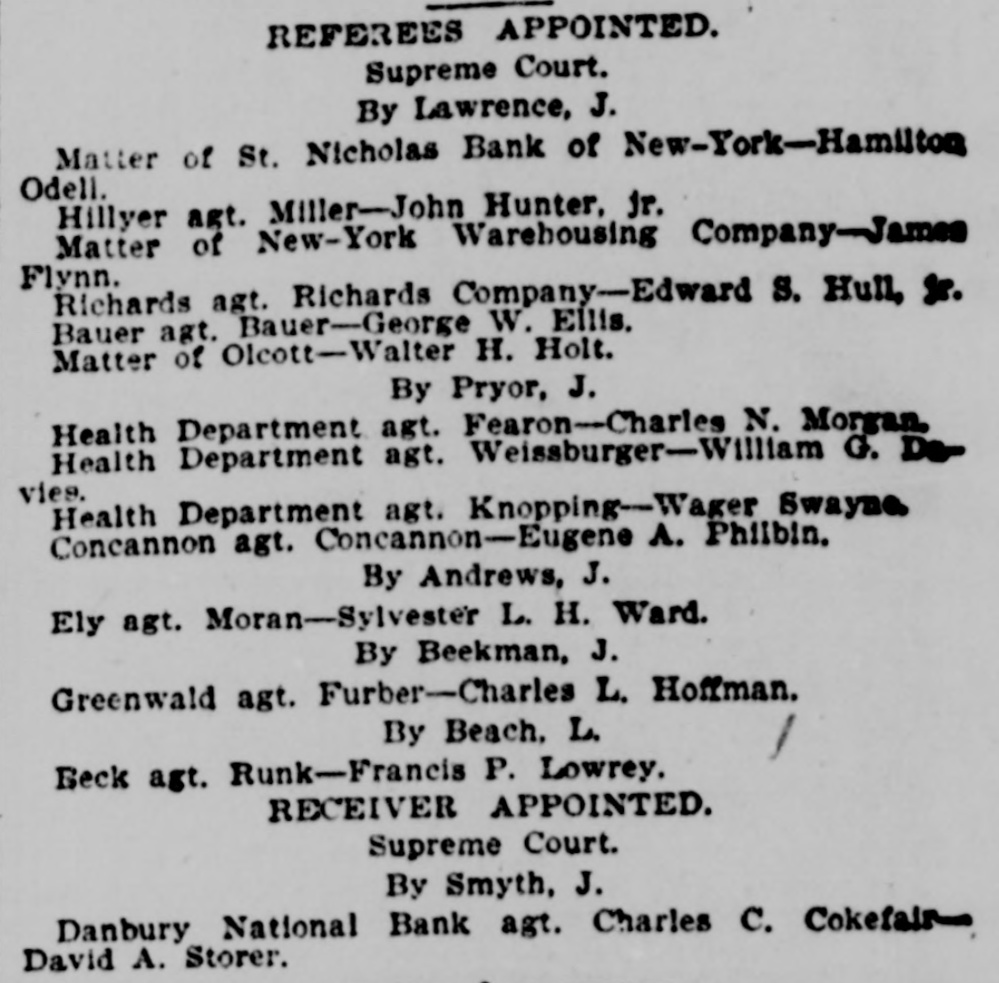 REFEREES APPOINTED. Supreme Court. By Lawrence, J. Matter of St. Nicholas Bank of New-York-Hamiltom Odell. Hillyer agt. Miller-John Hunter, jr. Matter of New-York Warehousing Company-James Flynn. Richards agt. Richards Company-Edward S. Hull, Jr. Bauer agt. Bauer-George W. Ellis. Matter of Olcott-Walter H. Holt. By Pryor, J. Health Department agt. Fearon-Charles N. Morgan. Health Department agt. Weissburger-William G. vies. Health Department agt. Knopping-Wager Swayne. Concannon agt. Concannon-Eugene A. Philbin. By Andrews, J. Ely agt. Moran-Sylvester L. H. Ward. By Beekman, J. Greenwald agt. Furber-Charles L. Hoffman. By Beach, L. Beck agt. Runk-Francis P. Lowrey. RECEIVER APPOINTED. Supreme Court. By Smyth, J. Danbury National Bank agt. Charles C. CokefalsDavid A. Storer.