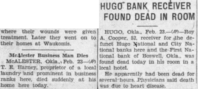 HUGO BANK RECEIVER FOUND DEAD IN ROOM HUGO, Okla., Cooper, receiver for the funct Hugo National and City tional banks here and the National bank of Boswell, Okla., found dead today in his room in local hotel. apparently had been dead for Physicians said death due to heart disease.