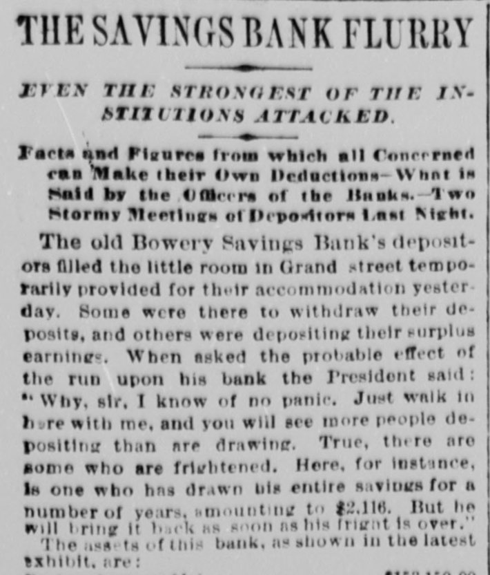 THE SAVINGS BANK FLURRY EVEN THE STRONGEST OF THE INSTITUTIONS ATTACKED Facts and Figures from which all Concerned can Make their Own Deductions- What is Said by the Officers of the Banks.-Two Stormy Meetings of Depositors Last Night. The old Bowery Savings Bank's depositors filled the little room in Grand street temporarily provided for their accommodation yesterday. Some were there to withdraw their deposits, and others were depositing their surplus earnings. When asked the probable effect of the run upon his bank the President said "Why, sir. I know of no panic. Just walk in here with me. and you will see more people depositing than are drawing. True, there are some who are frightened. Here, for instance, Is one who has drawn bis entire savings for a number of years, amounting to $2,116. But he will bring it back 88 soon as his fright is over. The assets of this bank. as shown in the latest exhibit. are: