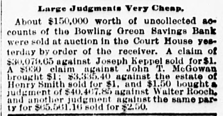 Large Judgments Very Cheap. About $150,000 worth of uncollected aocounts of the Bowling Green Savings Bank were sold at auction in the Court House yesterday by order of the receiver. A claim of $30,079.65 against Joseph Keppel sold for $1. A $930 claim against John T. McGowan brought $1; $3,335.40 against the estate of Henry Smith sold for $1, and $1.50 bought a judgment of $40,467.85 against Walter Rooch, and another judgment against the same party for $65,561.16 sold for $2.50.