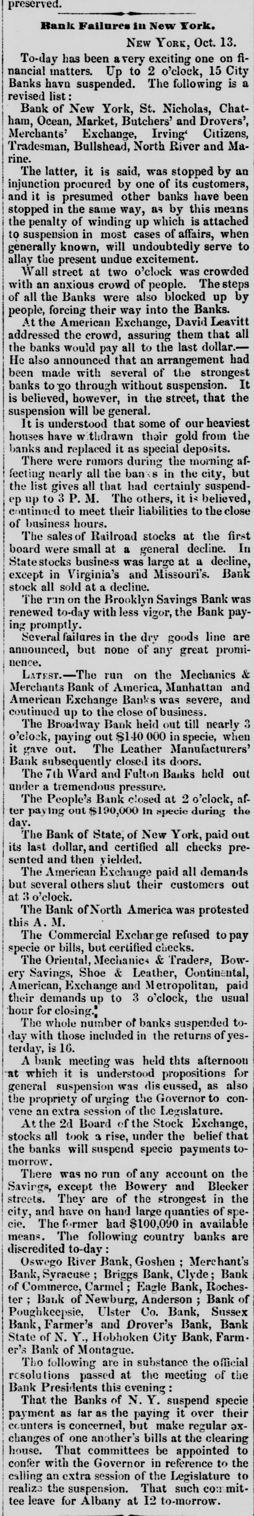 The street is full of rumors, with eager crowds at every corner. The country bankers here are numerous, some telegraphing their own banks, and others awaiting the result of events during the day. Of course if suspension here becomes general it is inevitable the suspension will follow throughout the State, if not throughout the country. The Broadway, the Artizans', and the Leather Manufacturers' Banks have also suspended, and finally the suspension of the Bank of the State of New York ends the catalogue for to-day, making the total suspension today number eighteen, and leaving thirty-three solvent institutions. The greater portion of these, however, will, it is expected, go to-morrow. The Merchants' Exchange Bank refuses to pay out either specie or bills, only certifying checks. The Bank of North America was protested this afternoon. Several of the banks held open till after three o'clock, the usual hour of closing, meeting every demand others shut down promptly at the regular hour, leaving a large number of applicants to try again. All of the savings banks paid up promptly. Effect of the New York Bank Failures In Boston-Decline In Bank Stocks-Meeting of Bank Officers, &c. BOSTON, Oct. 13.-There was a general decline in stocks here to-day, and bank stocks were from two to four per cent. lower. The bank failures in New York created intense excitement, but there was no run of consequence upon the Boston banks. Money, however, remains very stringent. An informal meeting of the presidents of the several city banks was held to-day, at which a feeling of security was expressed, as also an ability to maintain specie payments. A motion was carried for the appointment of a committee to proceed to New York and consult with the officers of the banks of that city upon the expediency or practicability of extending the line of discounts.The Hon. Wm. Appleton was appointed chairman of the committee. The suspension of Francis Skinner & Co., the most extensive domestic goods commission house in the city, is announced. The Bank Failures In New York-Meeting of Bank Officers. NEW YORK, Oct. 13, P. To-day has been a very exciting one in financial matters. Up to 2 o'clock fifteen of our city banks had suspended, of which the following is a revised list, namely :-Bank of New York, Artizans', St. Nicholas, Chatham, Ocean, Market, Butchers' and Drovers', Merchants' Exchange, Irving, Citizens', Tradesmen's, Bull's Head, New York Exchange, North River, and Marine Bank. Wall street, at 2 o'clock, was crowded with an anxious mass of people. The steps of all the banks were also blocked up by the people foreing their way into the banks. There were rumors during the morning affecting nearly all the banks in the city, but the above list gives all that had certainly suspended up to 3 o'clock. The sales of railroad stocks at the first board were small, at a general decline. In State stocks the business done was quite large at a decline, excepting Virginia and Missouri stocks. Bank stocks were also sold at a decline. The run on the Brooklyn Savings Bank was renewed to-day, but with less vigor and the bank paying promptly. There have been several failures in the dry goods line announced to-day, but none very prominent. Latest-Great Run on the Banks and Failure of some of the Strongest In the City. The run upon the Mechanics', Bank of America, Manhattan and American Banks was very severe, and continued up to the close of business. The Broadway Bank held out till nearly 3 o'clock and paid out $140,000 in specie, when it gave out. The Leather Manufacturers' Bank subsequently closed its doors. The Seven Ward and Fulton Banks held out under a tremendous pressure. The People's Bank closed at 2 o'clock, after paying out $19,000 in specie during the day. The Bank of the State of New York paid out its last dollar and certified all checks presented, and then yielded. The American Exchange Bank paid all demands upon it, but several others shut out their customers at 3 o'clock. The Bank of North America suffered protest this afternoon. The Corn Exchange Bank refused to pay specie or bills. but certified checks. The Oriental, Mechanics and Traders', Bowery Savings, Shoe and Leather, Continental, American Exchange and Metropolitan paid every demand up to the usual hour of closing. A bank meeting was held this afternoon, at which it is understood the proposition of a general suspension was to be discussed, as also the propriety of urging the Governor to convene an extra session of the Legislature. At the second board of the stock exchange stocks all took a rise, under the belief that the banks will suspend specie payments to-morrow. Still Later-The Banks Resolved to Suspend. NEW YORK, Oct. 13-11 P. M.-The following official announcement has been made from the bank meeting The banks have all resolved to suspend specie payments. as far as paying at the counter is concerned, and to make a regular exchange of each other's bills at the Clearing House. It has also been resolved to send a committee to confer with the Governor in reference to calling a meeting of the Legislature. The committee will leave for Albany to-morrow at 12 o'clock. It appears that the Marine Bank was stopped by an injunction, at the instacne of one of its customers. It is presumed that the other stoppages were effected in the same way. By this means the penalty of winding up which attaches to suspension under the banking laws of this State is evaded, and it is rendered probable that the suspension in most cases is only temporary. This understanding relieves the excitement. From Mexico-Monoy Matters at New Orleans. NEW ORLEANS, Oct. 12.-Dates from Vera Cruz to the 7th inst. have been received. The Mexican Congress had held a primary meeting and Manuel Ruise was elected President. There was a rumor that General Svavex had been assassinated. The insurgents at the South still held out, and robberies were rife throughout the country. The failure of Messrs Comming & Co., of New 