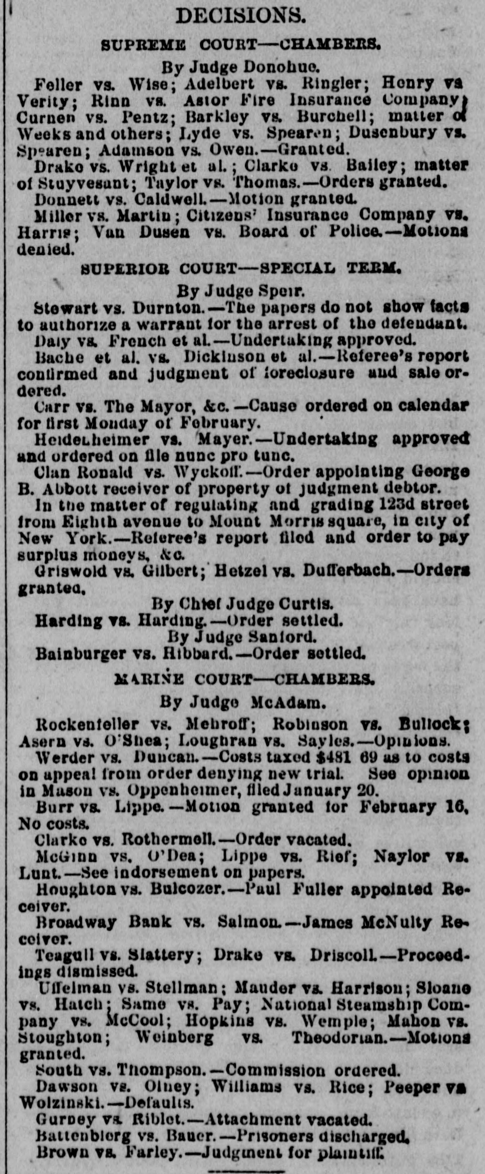 DECISIONS. SUPREME COURT-CHAMBERS. By Judge Donohue. Feller vs. Wise; Adelbert vs. Ringler; Henry vs Verity; Rinn V8. Astor Fire Insurance Company Curnen vs. Pentz; Barkley vs. Burchell; matter of Weeks and others; Lyde vs. Spearen; Dusenbury vs. Spearen; Adamson vs. Owen.-Granted. Drako vs. Wright et al.; Clarko vs. Bailey; matter of Stuyvesant; Taylor vs. Thomas.-Orders granted. Donnett vs. Caldwell.-Motion granted. Miller vs. Martin; Citizens Insurance Company vs. Harris; Van Dusen vs. Board of Police.-Motions denied. SUPERIOR COURT-SPECIAL TERM. By Judge Speir. Stewart vs. Durnton. - -The papers do not show facts to authorize a warrant for the arrest of the defendant. Daiy vs. French et -Undertaking approved. Bache et al. vs. Dickinson et al.-Referee's report confirmed and judgment of foreclosure and sale ordered. Carr vs. The Mayor, &c. -Cause ordered on calendar for first Monday of February. Heidenheimer vs. Mayer.-Undertaking approved and ordered on file nunc pro tunc. Clan Ronald vs. Wyckoff.- Order appointing George B. Abbott receiver of property of judgment debtor. In the matter of regulating and grading 123d street from Eighth avenue to Mount Morris square, in city of New York.-Referee's report filed and order to pay surplus moneys, &c. Griswold vs. Gilbert; Hetzel vs. Dufferbach.-Orders grantea. By Chief Judge Curtis. Harding vs. Harding.-Order settled. By Judge Sanford. Bainburger vs. Hibbard. -Order settled. MARINE COURT-CHAMBERS. By Judge McAdam. Rockenteller vs. Mebroff; Robinson vs. Bullock; Asern vs. O'Shea; Loughran vs. Sayles.-Opinions. Werder vs. Duncan. Costs taxed $481 69 as to costs on appea! from order denying new trial. See opinion in Mason vs. Oppenheimer, filed January 20. Burr vs. Lippe. -Motion granted for February 16, No costs. Clarke vs. Rothermell. -Order vacated. McGinn vs. O'Dea; Lippe vs. Rief; Naylor vs. Lunt.-See indorsement on papers. Houghton vs. Bulcozer.-Paul Fuller appointed Receiver. Broadway Bank vs. Salmon-James McNuity Recoiver. Teagull vs. Slattery; Drake vs. Driscoll.-Procoed. ings dismissed. Uffelman VS. Stellman: Mauder V3. Harrison; Sloane vs. Hatch; Same VS. Pay; National Steamship Company vs. McCool; Hopkins vs. Wemple; Mahon vs. Stoughton; Weinberg vs. Theodorian.-Motions granted. South vs. T'nompson.-Commission ordered. Dawson ve. Olney; Williams vs. Rice; Peeper va Wolzinski.-Defaults. Gurdey VR. Riblet.-Attachment vacated. Battenblerg vs. Bauer.-Prisoners discharged. Brown VS. Farley.-Judgment for plaintiff.