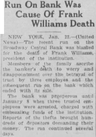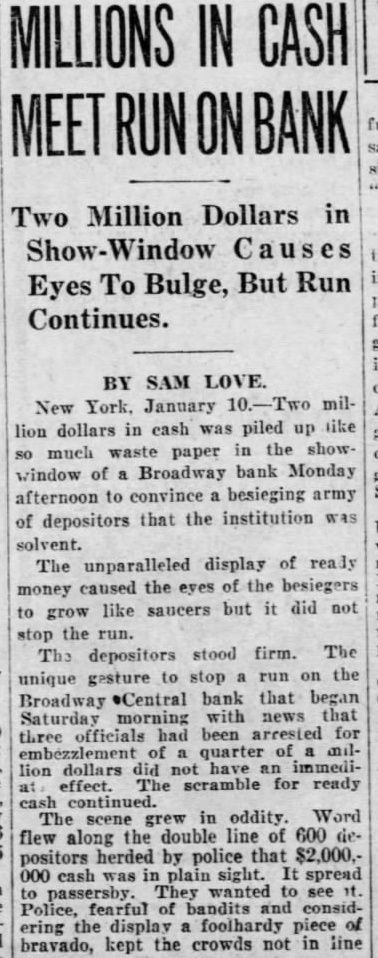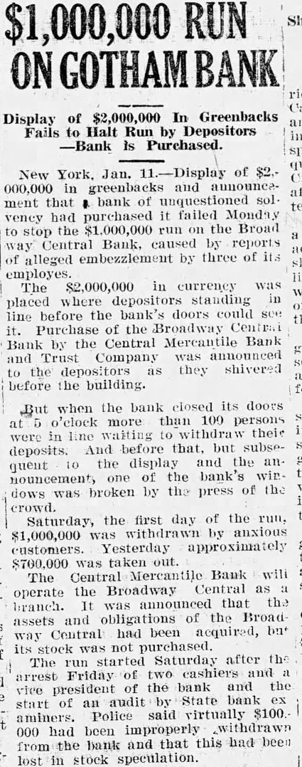 RUN of $2,000,000 In Greenbacks Display Fails Halt Run by Depositors -Bank is Purchased. New York. Jan. of 000,000 in greenbacks and announcement that bank of unquestioned solvency had purchased it failed Monday to stop the $1,000,000 on the Broad way Bank, caused by reports embezzlement by three of its of alleged employes. The $2,000,000 in currency was placed where depositors standing line before the bank's doors could see Purchase of the Broadway the Central Mercantile Bank Bank by Trust announced and Company they shivered the depositors as before the building. But when the bank closed its doors o'clock more than 100 persons their were in line And before that, but subsedeposits. 10 the display and the an quent one of the bank's nouncement, dows was broken by the press of the crowd. Saturday, the first day of the run. withdrawn by anxious $1,000,000 was customers. Yesterday approximately $700,000 was taken out. The Central Mercantile Bank will operate the Broadway Central branch. was announced that the assets and obligations of the Broad been acquired, but Central had way its stock was not purchased. The started Saturday after the of two cashiers and Friday vice president of the bank and the audit State bank ex start of an Police said virtually $100. aminers. improperly withdrawn 000 had been and that this had been from the bank lost in stock speculation.