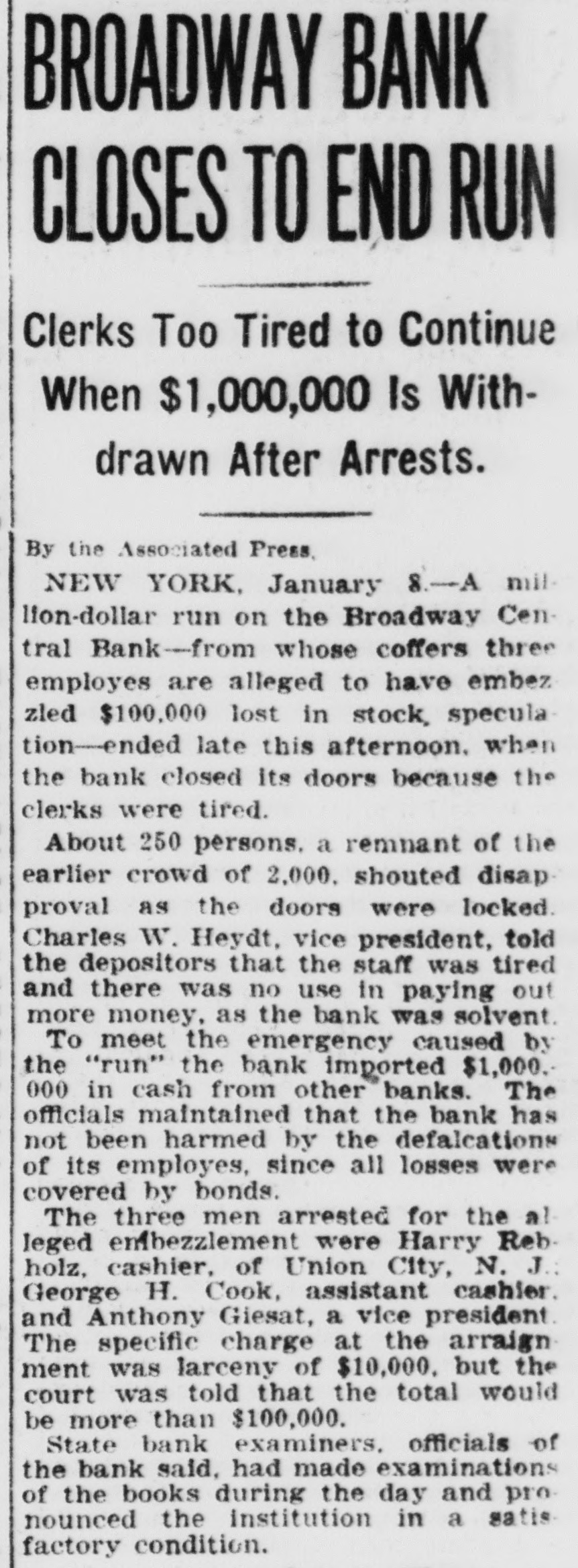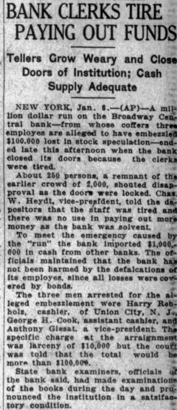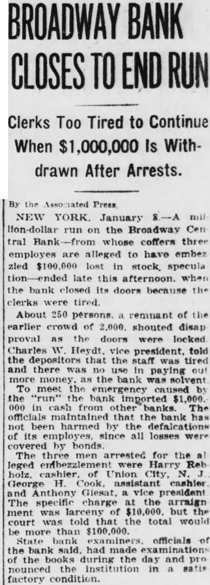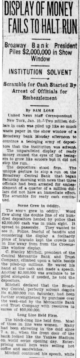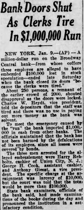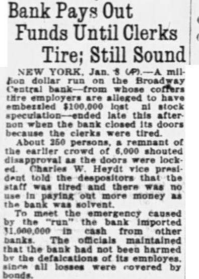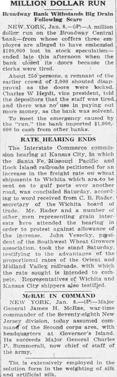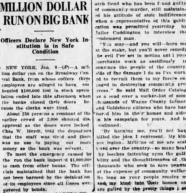 MILLION DOLLAR Officers Declare New York Institution is in Safe Condition NEW YORK, Jan. mil. convince the people of the countrylion dollar run on the Broadway Cen side of the damage do as I've worktral Bank, from whose coffers three ed to recruit them to my forces enemployees are alleged to have em gaged in destroying community probezzled $100,000 lost in stock specu- So said Mail Order Catalog lation ended late this afternoon when read over sucker-list of some the banks closed their doors be- housands of Wayne County farmers cause the clerks were tired. and Goldsboro citizens who have har About 250 persons remnant of the him in and aided carlier crowd of 2,000 shouted dis. his campaign for years. And approval as the doors were locked ontinued: Chas Heydt, told the depositors barning me, not have that the staff was and there killed the idea represent. My kind was no use in paying out more legion. Millions of me scatmoney as the bank solvent. over the country- many healTo meet the emergency caused by by leeches fattening the gullithe run the bank imported $1,000,00* bility and the thoughtlessness of the in cash from other banks. The offi thousands who seek to save penntes dals maintained that the bank has at the expense of community welfare. not been harmed by the So long as your people receive me employees since all losses wer and my kind into their homes and gulled by the pretty things covered by bonds.