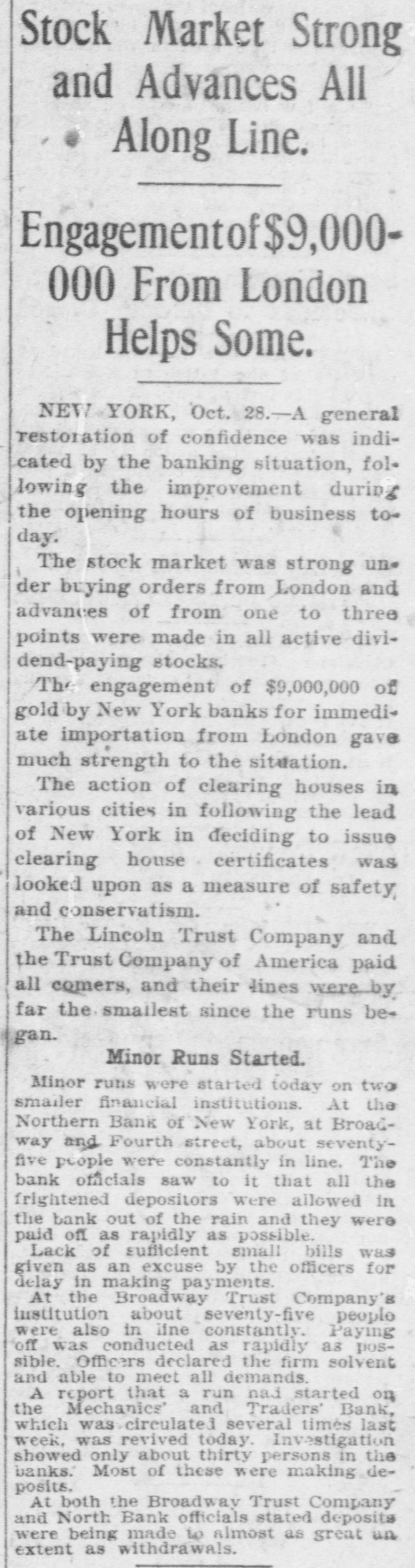 Stock Market Strong and Advances All Along Line. Engagementof$9,000000 From London Helps Some. NEW YORK, Oct. 28.-A general restoration of confidence was indicated by the banking situation, following the improvement during the opening hours of business today. The stock market was strong under buying orders from London and advances of from one to three points were made in all active dividend-paying stocks. The engagement of $9,000,000 of gold by New York banks for immedi< ate importation from London gave much strength to the situation. The action of clearing houses in various cities in following the lead of New York in deciding to issue clearing house certificates was looked upon as a measure of safety and conservatism. The Lincoln Trust Company and the Trust Company of America paid all comers, and their lines were by far the smailest since the runs began. Minor Runs Started. Minor runs were started today on two smailer financial institutions. At the Northern Bank of New York, at Broadway and Fourth street, about seventyfive people were constantly in line. The bank officials saw to it that all the frightened depositors Were allowed in the bank out of the rain and they were paid off as rapidly as possible. Lack of sufficient small bills was given as an excuse by the officers for delay in making payments. At the Broadway Trust Company's institution about seventy-five people were also in line constantly. Paying off was conducted as rapidly as pos= sible. Officers declared the firm solvent and able to meet all demands. A report that a run nad started on the Mechanics' and Traders' Bank, which was circulated several times last week, was revived today. Investigation shewed only about thirty persons in the banks. Most of these were making deposits. At both the Broadway Trust Company and North Bank officials stated deposits were being made to almost as great an extent as withdrawals.