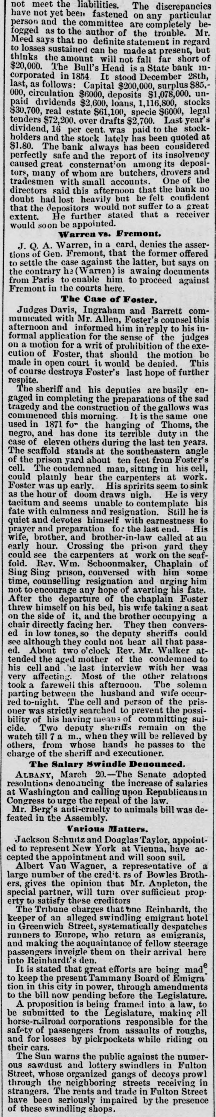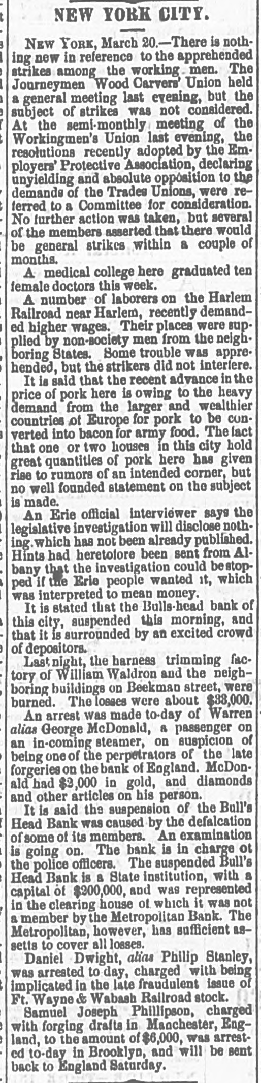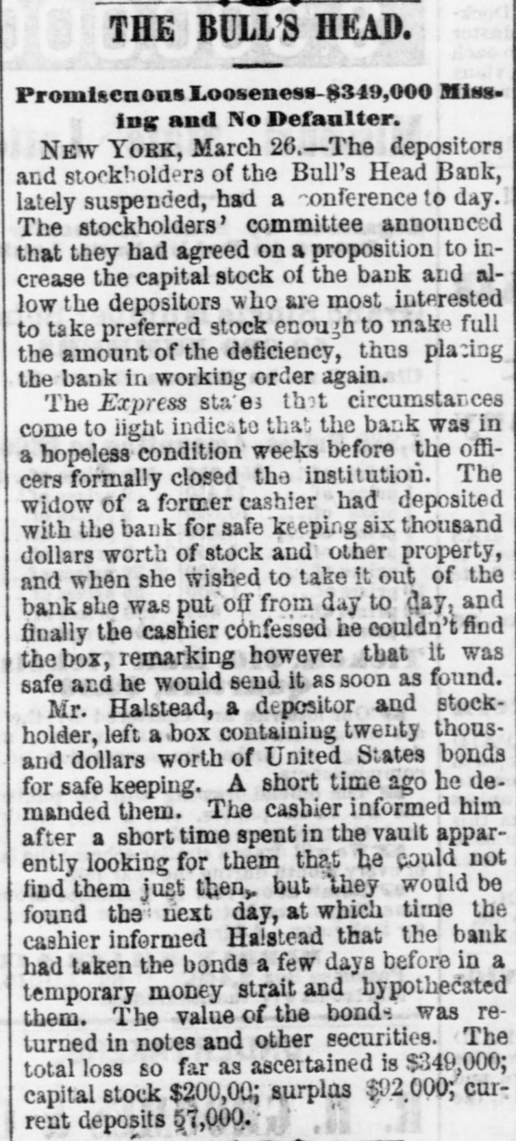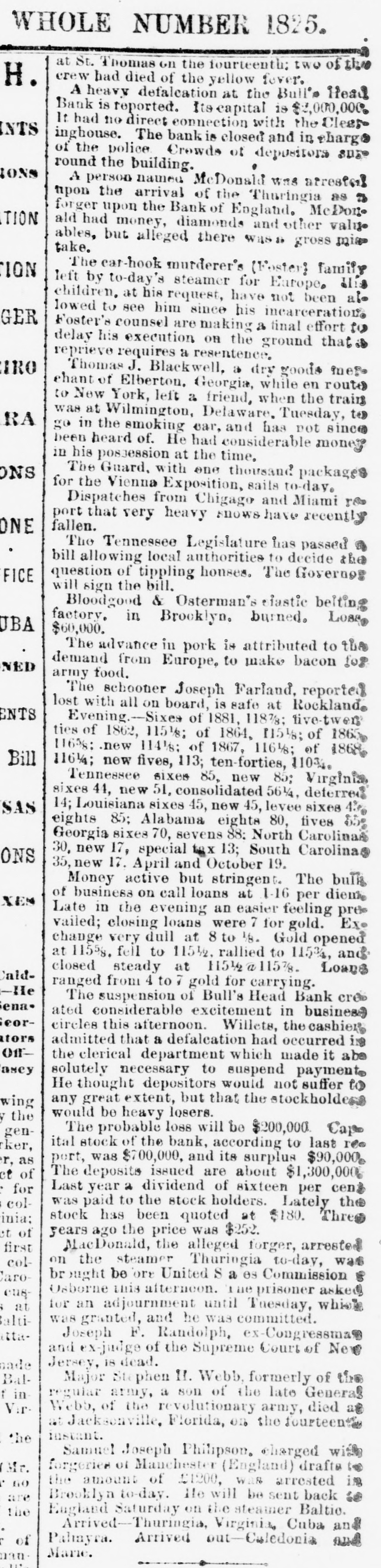 WHOLE NUMBER 1825. at St. Thomas on the fourteenth; two of the H. crew had died of the yellow fever. A heavy defalcation at the Buil's Head Bank is reported. Its capital is $2,000,000, It had no direct connection with the Clear INTS inghouse. The bank is closed and in charge of the police Crowds of depositors sure round the building. IONS A person named fcDonald was atrested upon the arrival of the Thuringia as s forger upon the Bank of England. McDon® TION ald had money, diamonds and other value ables, but alleged there was gross miss take. The car-hook murderer's (Foster: family TION left by to-day's steamer for Earope. 11: children, at his request, have not been ato lowed to see him since his incarceration. GER Foster's counsel are making a final effort to delay his execution on the ground that reprieve requires a resentence, IRO Thomas J. Blackwell, it dry goods mere ehant of Elberton. Georgia, while en route to New York, left a friend, when the train was at Wilmington, Delaware, Tuesday, to RA go in the smoking ear, and has not since been heard of. He had considerable money in his possession at the time, ONS The Guard, with one thousand packages for the Vienna Exposition, saits to-day. Dispatches from Chigago and Miami 180 port that very heavy snows have recently fallen. ONE The Tennessee Legislature has passed a bill allowing local authorities to decide the question of tippling houses. The Governor FICE will sign the bill. Bloodgood & Osterman's eiastic beiting factory. in Brocklyn. burned. Loses UBA $60,000. The advance in pork is attributed to the demand from Europe, to make bacon for NED army food, The schootier Joseph Farland, reported lost with all on board, is safe at Rockland. ENTS Evening.--Sixes of 1881, 118%; live-twen ties of 1862, 115 1/8; of 1864, 115% of 1865 116% new 114 % of 1867, 116 % of 1868 Bill 116 1/4; new fives, 113; ten-forties, 11034. Tennessee sixes 85, new 85; Virginia sixes 44, new 51, consolidated 561/4, deferred SAS 14; Louisiana sixes 45, new 45, levee sixes 4.00 eights 85; Alabama eights 80, tives in Georgia sixes 70, sevens 88; North Carolinait 30, new 17, special tax 13; South Carolina ONS 35, new 17. April and October 19. Money active but stringent. The buTi of business on call loans at 1.16 per diene XEN Late in the evening an easier feeling pres vailed; closing loans were 7 for gold. Exo change very dull at 8 to 18. Gold opened at 115% fell to 115 1/2, rallied to 115% and closed steady at 115 1/2 a 115% Loans Caldranged from 4 to 7 gold for carrying. -He The suspension of Bull's Head Bank cre enaated considerable excitement in business Seorcircles this afternoon. Willets, the cashier tors admitted that a defalcation had occurred is Offthe clerical department which made it abs asey solutely necessary to suspend payment. He thought depositors would not suffer to wing any great extent, but that the stockholders would be heavy losers. y the The probable loss will be $200,000. Cape genital stock of the bank, according to last ree rker, port, was $700,000, and its surplus $90,000 r, as ct of The deposits issued are about $1,300,000 : for Last year a dividend of sixteen per cent colwas paid to the stock holders. Lately the inia; stock has been quoted at $180. Three et of years ago the price was $252. first MacDonald, the alleged forger, arrested colon the steamer Thuringia to-day, was Carobr ought be ore United S a es Commission as Osborne this alterneon. the prisoner asked cus; at for an adjournment until Tuesday, whisk altiwas granted, and he was committed. ittaJoseph F. Randolph, ex-Congressma and ex-judge of the Supreme Court of New Jersey, 18 dead. made BalMajor phen II. Webb. formerly of the 1 in regular army, a son of the late General Var Webb, of the revolutionary army, died at at Jacksenville, Florida, 08 the fourteents instant. the Samuel Joseph Philipson. charged win Mr. forgerice of Manchester (England) drafts to no the amount of £1200. was arrested in are Brooklyn to-day. He will be sent back is the England Saturday on the steamer Baltio. Arrived--Thuringia, Virginia, Cuba and r of Pahayra. Arrived out-Caledonia and Marie. man