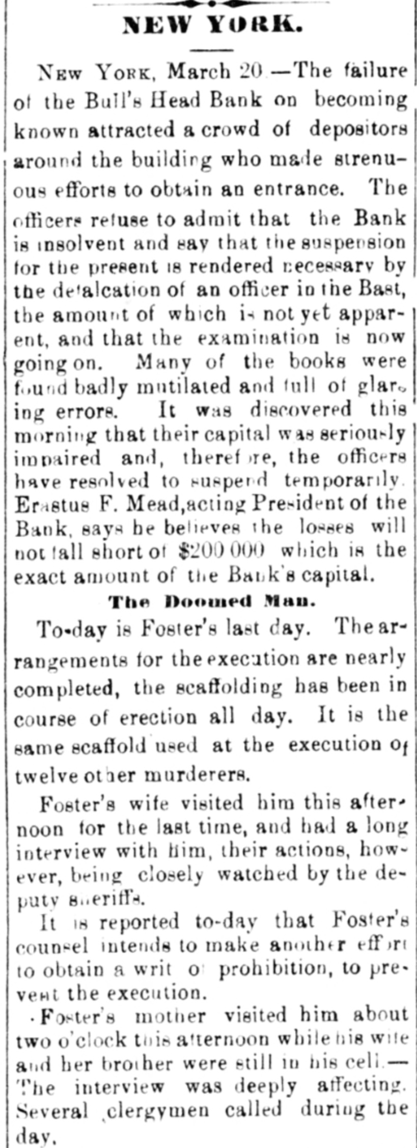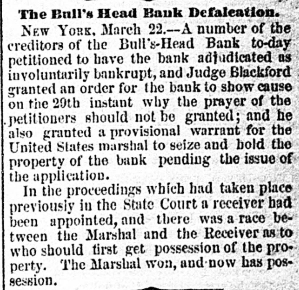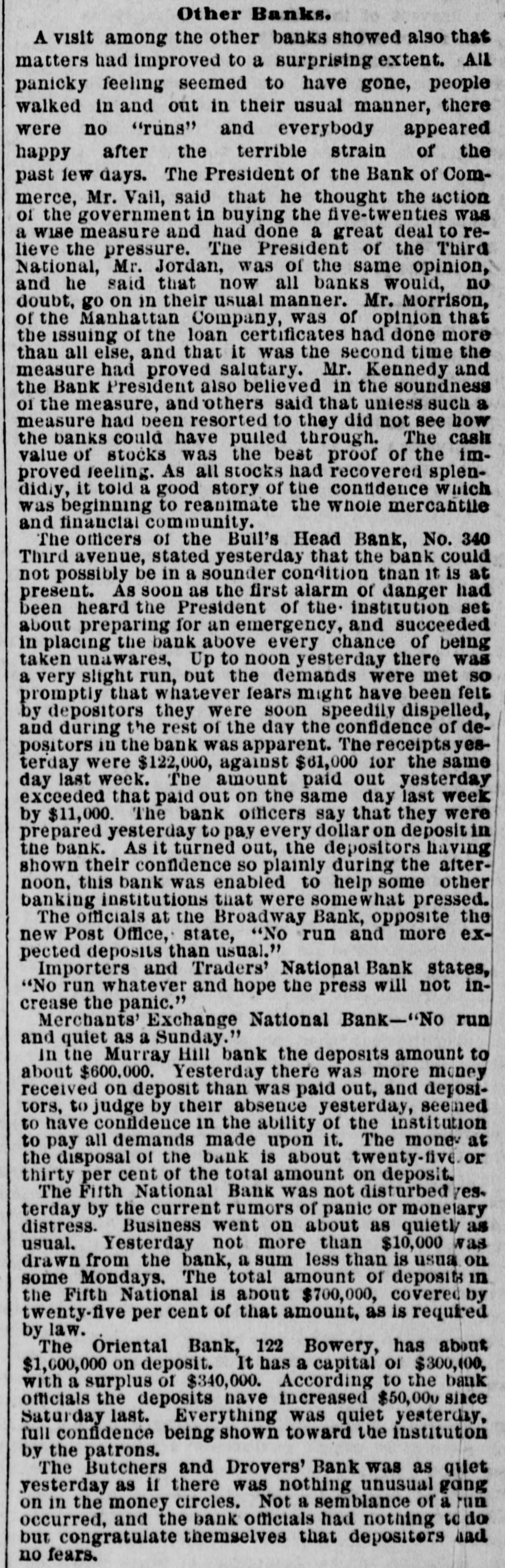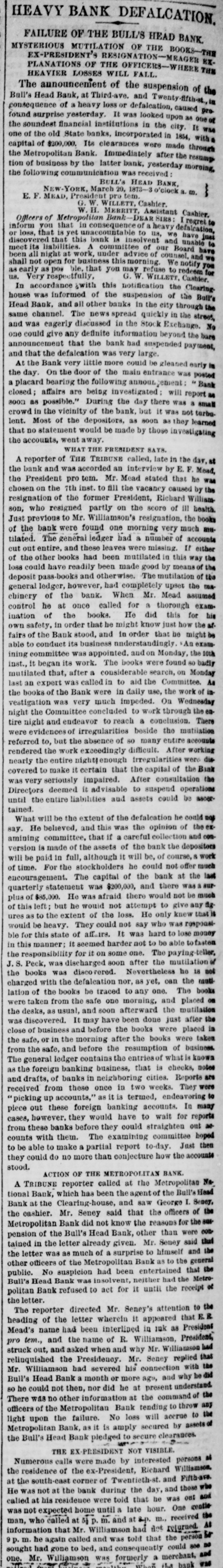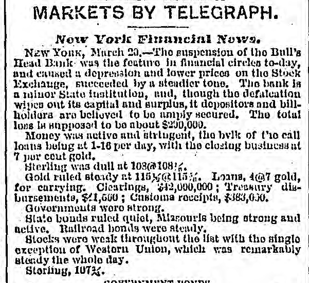 WHOLE NUMBER 1825. at St. Thomas on the fourteenth; two of the H. crew had died of the yellow fever. A heavy defalcation at the Buil's Head Bank is reported. Its capital is $2,000,000, It had no direct connection with the Clear INTS inghouse. The bank is closed and in charge of the police Crowds of depositors sure round the building. IONS A person named fcDonald was atrested upon the arrival of the Thuringia as s forger upon the Bank of England. McDon® TION ald had money, diamonds and other value ables, but alleged there was gross miss take. The car-hook murderer's (Foster: family TION left by to-day's steamer for Earope. 11: children, at his request, have not been ato lowed to see him since his incarceration. GER Foster's counsel are making a final effort to delay his execution on the ground that reprieve requires a resentence, IRO Thomas J. Blackwell, it dry goods mere ehant of Elberton. Georgia, while en route to New York, left a friend, when the train was at Wilmington, Delaware, Tuesday, to RA go in the smoking ear, and has not since been heard of. He had considerable money in his possession at the time, ONS The Guard, with one thousand packages for the Vienna Exposition, saits to-day. Dispatches from Chigago and Miami 180 port that very heavy snows have recently fallen. ONE The Tennessee Legislature has passed a bill allowing local authorities to decide the question of tippling houses. The Governor FICE will sign the bill. Bloodgood & Osterman's eiastic beiting factory. in Brocklyn. burned. Loses UBA $60,000. The advance in pork is attributed to the demand from Europe, to make bacon for NED army food, The schootier Joseph Farland, reported lost with all on board, is safe at Rockland. ENTS Evening.--Sixes of 1881, 118%; live-twen ties of 1862, 115 1/8; of 1864, 115% of 1865 116% new 114 % of 1867, 116 % of 1868 Bill 116 1/4; new fives, 113; ten-forties, 11034. Tennessee sixes 85, new 85; Virginia sixes 44, new 51, consolidated 561/4, deferred SAS 14; Louisiana sixes 45, new 45, levee sixes 4.00 eights 85; Alabama eights 80, tives in Georgia sixes 70, sevens 88; North Carolinait 30, new 17, special tax 13; South Carolina ONS 35, new 17. April and October 19. Money active but stringent. The buTi of business on call loans at 1.16 per diene XEN Late in the evening an easier feeling pres vailed; closing loans were 7 for gold. Exo change very dull at 8 to 18. Gold opened at 115% fell to 115 1/2, rallied to 115% and closed steady at 115 1/2 a 115% Loans Caldranged from 4 to 7 gold for carrying. -He The suspension of Bull's Head Bank cre enaated considerable excitement in business Seorcircles this afternoon. Willets, the cashier tors admitted that a defalcation had occurred is Offthe clerical department which made it abs asey solutely necessary to suspend payment. He thought depositors would not suffer to wing any great extent, but that the stockholders would be heavy losers. y the The probable loss will be $200,000. Cape genital stock of the bank, according to last ree rker, port, was $700,000, and its surplus $90,000 r, as ct of The deposits issued are about $1,300,000 : for Last year a dividend of sixteen per cent colwas paid to the stock holders. Lately the inia; stock has been quoted at $180. Three et of years ago the price was $252. first MacDonald, the alleged forger, arrested colon the steamer Thuringia to-day, was Carobr ought be ore United S a es Commission as Osborne this alterneon. the prisoner asked cus; at for an adjournment until Tuesday, whisk altiwas granted, and he was committed. ittaJoseph F. Randolph, ex-Congressma and ex-judge of the Supreme Court of New Jersey, 18 dead. made BalMajor phen II. Webb. formerly of the 1 in regular army, a son of the late General Var Webb, of the revolutionary army, died at at Jacksenville, Florida, 08 the fourteents instant. the Samuel Joseph Philipson. charged win Mr. forgerice of Manchester (England) drafts to no the amount of £1200. was arrested in are Brooklyn to-day. He will be sent back is the England Saturday on the steamer Baltio. Arrived--Thuringia, Virginia, Cuba and r of Pahayra. Arrived out-Caledonia and Marie. man