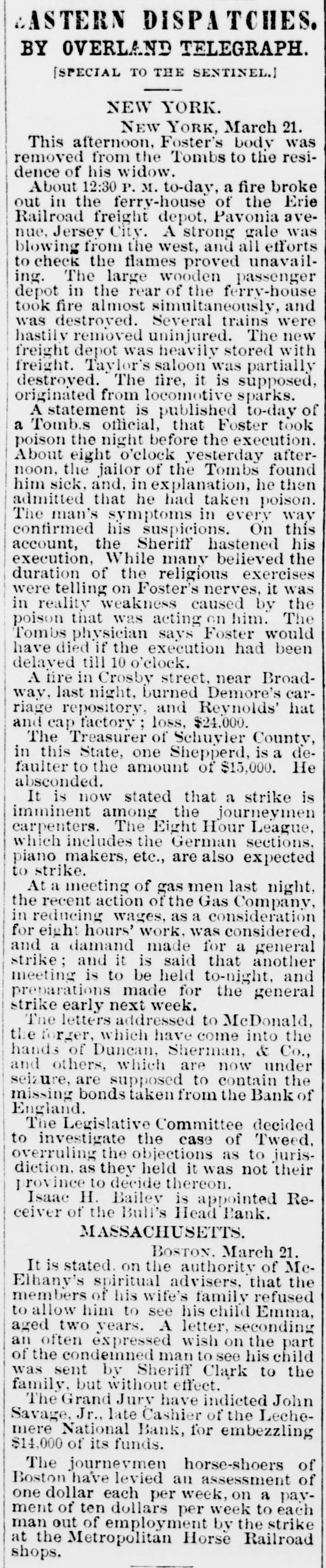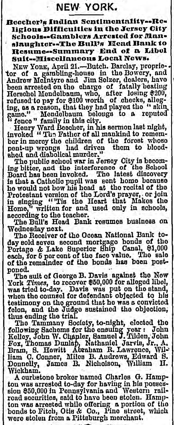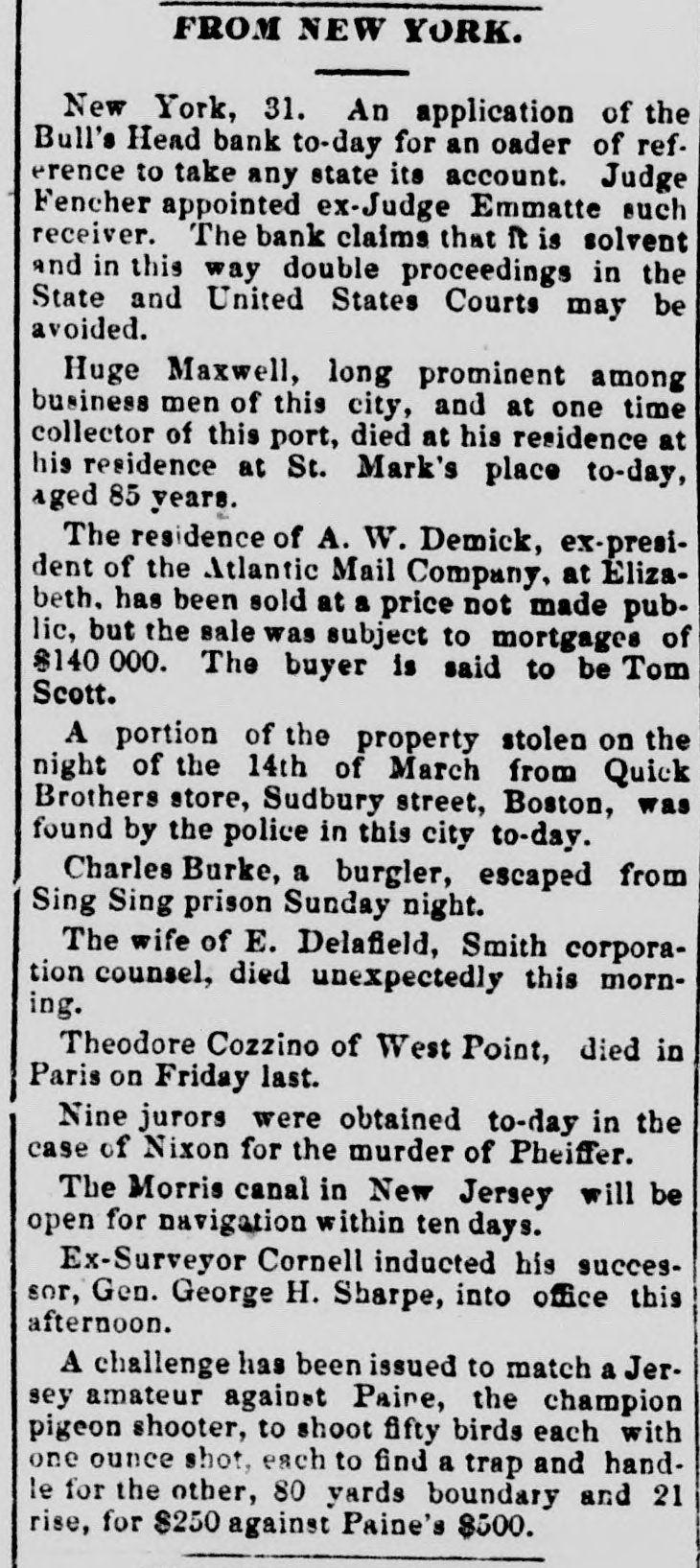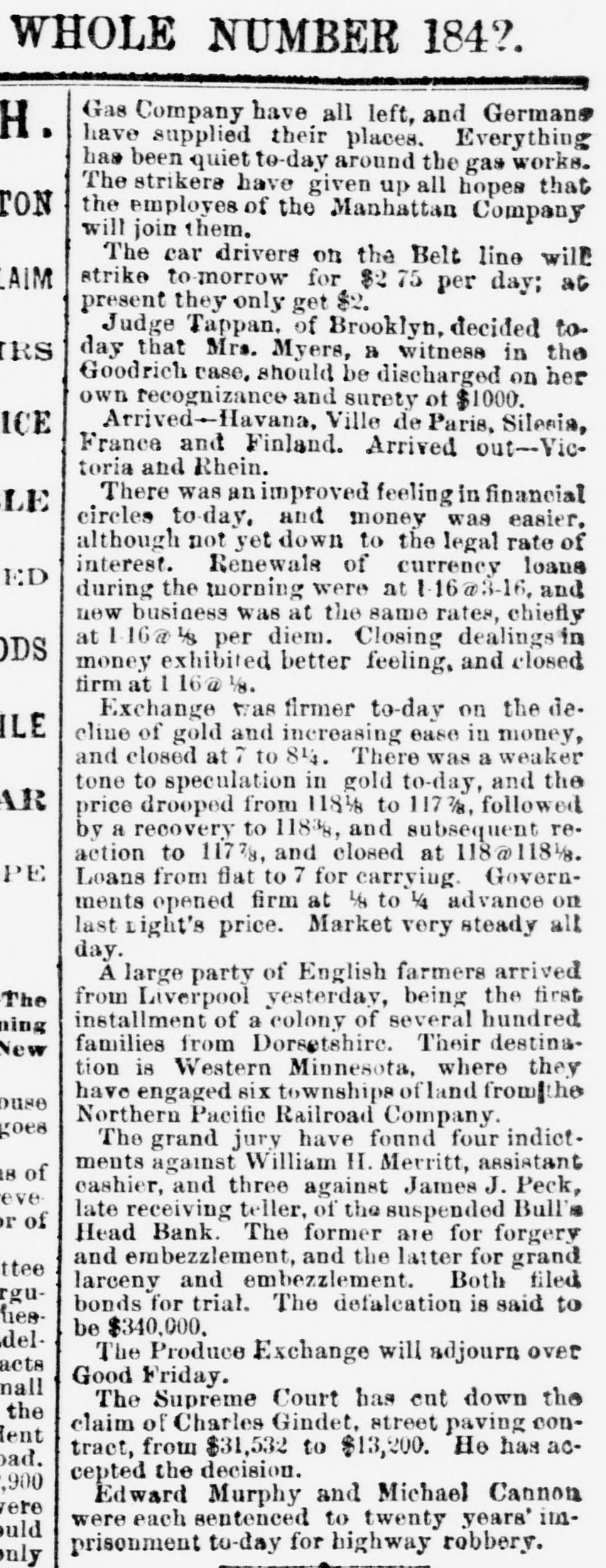 WHOLE NUMBER 1825. at St. Thomas on the fourteenth; two of the H. crew had died of the yellow fever. A heavy defalcation at the Buil's Head Bank is reported. Its capital is $2,000,000, It had no direct connection with the Clear INTS inghouse. The bank is closed and in charge of the police Crowds of depositors sure round the building. IONS A person named fcDonald was atrested upon the arrival of the Thuringia as s forger upon the Bank of England. McDon® TION ald had money, diamonds and other value ables, but alleged there was gross miss take. The car-hook murderer's (Foster: family TION left by to-day's steamer for Earope. 11: children, at his request, have not been ato lowed to see him since his incarceration. GER Foster's counsel are making a final effort to delay his execution on the ground that reprieve requires a resentence, IRO Thomas J. Blackwell, it dry goods mere ehant of Elberton. Georgia, while en route to New York, left a friend, when the train was at Wilmington, Delaware, Tuesday, to RA go in the smoking ear, and has not since been heard of. He had considerable money in his possession at the time, ONS The Guard, with one thousand packages for the Vienna Exposition, saits to-day. Dispatches from Chigago and Miami 180 port that very heavy snows have recently fallen. ONE The Tennessee Legislature has passed a bill allowing local authorities to decide the question of tippling houses. The Governor FICE will sign the bill. Bloodgood & Osterman's eiastic beiting factory. in Brocklyn. burned. Loses UBA $60,000. The advance in pork is attributed to the demand from Europe, to make bacon for NED army food, The schootier Joseph Farland, reported lost with all on board, is safe at Rockland. ENTS Evening.--Sixes of 1881, 118%; live-twen ties of 1862, 115 1/8; of 1864, 115% of 1865 116% new 114 % of 1867, 116 % of 1868 Bill 116 1/4; new fives, 113; ten-forties, 11034. Tennessee sixes 85, new 85; Virginia sixes 44, new 51, consolidated 561/4, deferred SAS 14; Louisiana sixes 45, new 45, levee sixes 4.00 eights 85; Alabama eights 80, tives in Georgia sixes 70, sevens 88; North Carolinait 30, new 17, special tax 13; South Carolina ONS 35, new 17. April and October 19. Money active but stringent. The buTi of business on call loans at 1.16 per diene XEN Late in the evening an easier feeling pres vailed; closing loans were 7 for gold. Exo change very dull at 8 to 18. Gold opened at 115% fell to 115 1/2, rallied to 115% and closed steady at 115 1/2 a 115% Loans Caldranged from 4 to 7 gold for carrying. -He The suspension of Bull's Head Bank cre enaated considerable excitement in business Seorcircles this afternoon. Willets, the cashier tors admitted that a defalcation had occurred is Offthe clerical department which made it abs asey solutely necessary to suspend payment. He thought depositors would not suffer to wing any great extent, but that the stockholders would be heavy losers. y the The probable loss will be $200,000. Cape genital stock of the bank, according to last ree rker, port, was $700,000, and its surplus $90,000 r, as ct of The deposits issued are about $1,300,000 : for Last year a dividend of sixteen per cent colwas paid to the stock holders. Lately the inia; stock has been quoted at $180. Three et of years ago the price was $252. first MacDonald, the alleged forger, arrested colon the steamer Thuringia to-day, was Carobr ought be ore United S a es Commission as Osborne this alterneon. the prisoner asked cus; at for an adjournment until Tuesday, whisk altiwas granted, and he was committed. ittaJoseph F. Randolph, ex-Congressma and ex-judge of the Supreme Court of New Jersey, 18 dead. made BalMajor phen II. Webb. formerly of the 1 in regular army, a son of the late General Var Webb, of the revolutionary army, died at at Jacksenville, Florida, 08 the fourteents instant. the Samuel Joseph Philipson. charged win Mr. forgerice of Manchester (England) drafts to no the amount of £1200. was arrested in are Brooklyn to-day. He will be sent back is the England Saturday on the steamer Baltio. Arrived--Thuringia, Virginia, Cuba and r of Pahayra. Arrived out-Caledonia and Marie. man