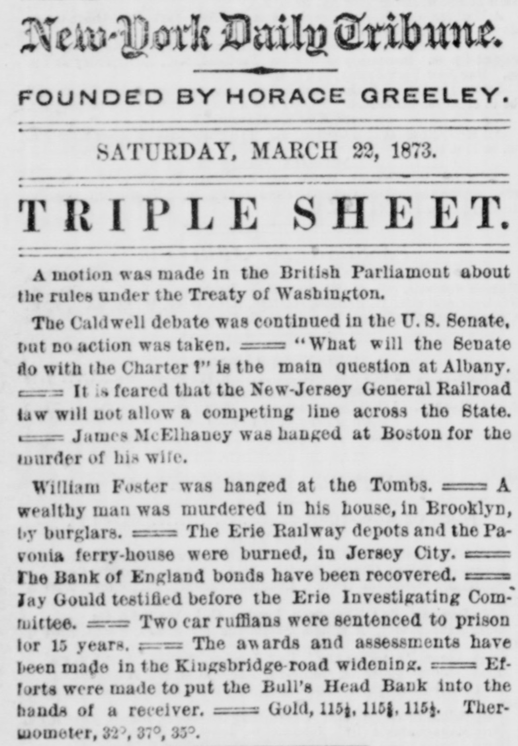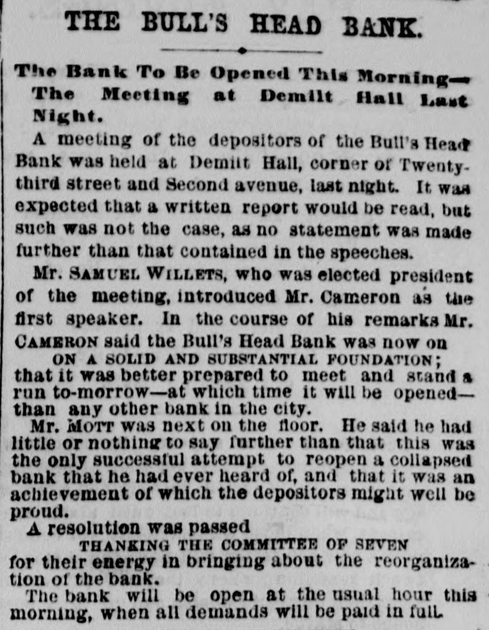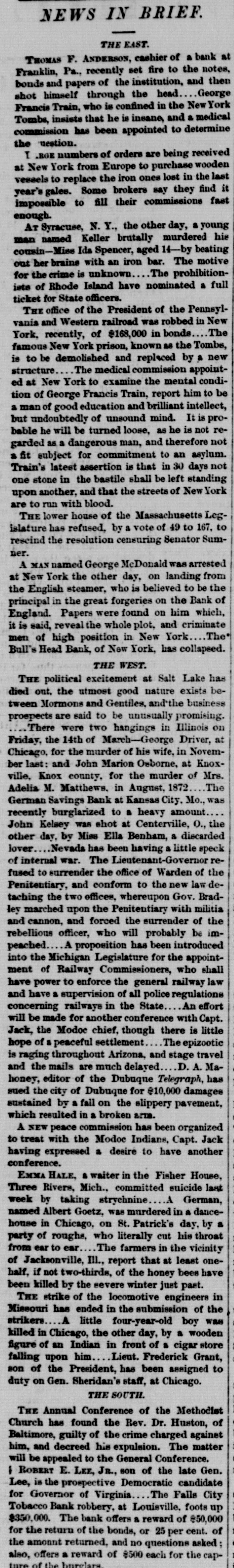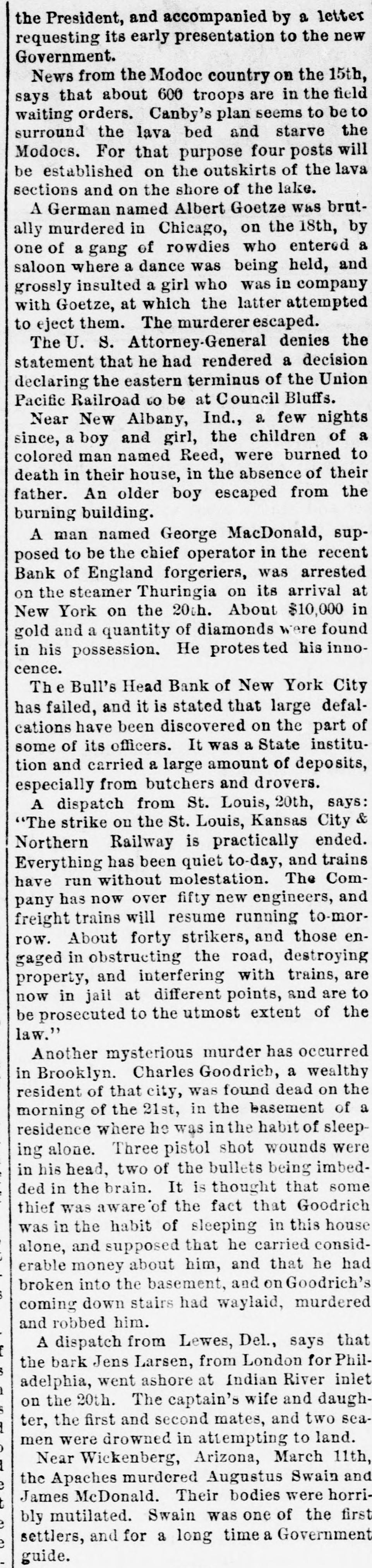 WHOLE NUMBER 1825. at St. Thomas on the fourteenth; two of the H. crew had died of the yellow fever. A heavy defalcation at the Buil's Head Bank is reported. Its capital is $2,000,000, It had no direct connection with the Clear INTS inghouse. The bank is closed and in charge of the police Crowds of depositors sure round the building. IONS A person named fcDonald was atrested upon the arrival of the Thuringia as s forger upon the Bank of England. McDon® TION ald had money, diamonds and other value ables, but alleged there was gross miss take. The car-hook murderer's (Foster: family TION left by to-day's steamer for Earope. 11: children, at his request, have not been ato lowed to see him since his incarceration. GER Foster's counsel are making a final effort to delay his execution on the ground that reprieve requires a resentence, IRO Thomas J. Blackwell, it dry goods mere ehant of Elberton. Georgia, while en route to New York, left a friend, when the train was at Wilmington, Delaware, Tuesday, to RA go in the smoking ear, and has not since been heard of. He had considerable money in his possession at the time, ONS The Guard, with one thousand packages for the Vienna Exposition, saits to-day. Dispatches from Chigago and Miami 180 port that very heavy snows have recently fallen. ONE The Tennessee Legislature has passed a bill allowing local authorities to decide the question of tippling houses. The Governor FICE will sign the bill. Bloodgood & Osterman's eiastic beiting factory. in Brocklyn. burned. Loses UBA $60,000. The advance in pork is attributed to the demand from Europe, to make bacon for NED army food, The schootier Joseph Farland, reported lost with all on board, is safe at Rockland. ENTS Evening.--Sixes of 1881, 118%; live-twen ties of 1862, 115 1/8; of 1864, 115% of 1865 116% new 114 % of 1867, 116 % of 1868 Bill 116 1/4; new fives, 113; ten-forties, 11034. Tennessee sixes 85, new 85; Virginia sixes 44, new 51, consolidated 561/4, deferred SAS 14; Louisiana sixes 45, new 45, levee sixes 4.00 eights 85; Alabama eights 80, tives in Georgia sixes 70, sevens 88; North Carolinait 30, new 17, special tax 13; South Carolina ONS 35, new 17. April and October 19. Money active but stringent. The buTi of business on call loans at 1.16 per diene XEN Late in the evening an easier feeling pres vailed; closing loans were 7 for gold. Exo change very dull at 8 to 18. Gold opened at 115% fell to 115 1/2, rallied to 115% and closed steady at 115 1/2 a 115% Loans Caldranged from 4 to 7 gold for carrying. -He The suspension of Bull's Head Bank cre enaated considerable excitement in business Seorcircles this afternoon. Willets, the cashier tors admitted that a defalcation had occurred is Offthe clerical department which made it abs asey solutely necessary to suspend payment. He thought depositors would not suffer to wing any great extent, but that the stockholders would be heavy losers. y the The probable loss will be $200,000. Cape genital stock of the bank, according to last ree rker, port, was $700,000, and its surplus $90,000 r, as ct of The deposits issued are about $1,300,000 : for Last year a dividend of sixteen per cent colwas paid to the stock holders. Lately the inia; stock has been quoted at $180. Three et of years ago the price was $252. first MacDonald, the alleged forger, arrested colon the steamer Thuringia to-day, was Carobr ought be ore United S a es Commission as Osborne this alterneon. the prisoner asked cus; at for an adjournment until Tuesday, whisk altiwas granted, and he was committed. ittaJoseph F. Randolph, ex-Congressma and ex-judge of the Supreme Court of New Jersey, 18 dead. made BalMajor phen II. Webb. formerly of the 1 in regular army, a son of the late General Var Webb, of the revolutionary army, died at at Jacksenville, Florida, 08 the fourteents instant. the Samuel Joseph Philipson. charged win Mr. forgerice of Manchester (England) drafts to no the amount of £1200. was arrested in are Brooklyn to-day. He will be sent back is the England Saturday on the steamer Baltio. Arrived--Thuringia, Virginia, Cuba and r of Pahayra. Arrived out-Caledonia and Marie. man