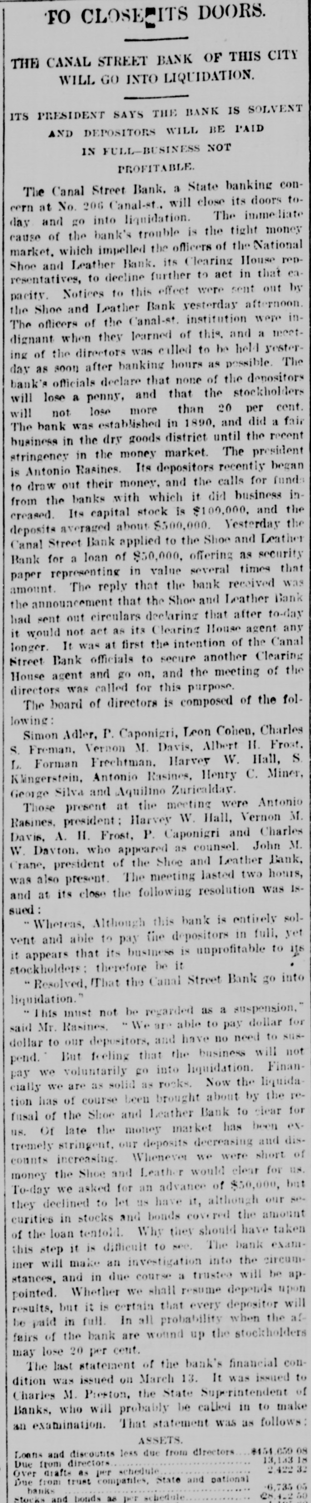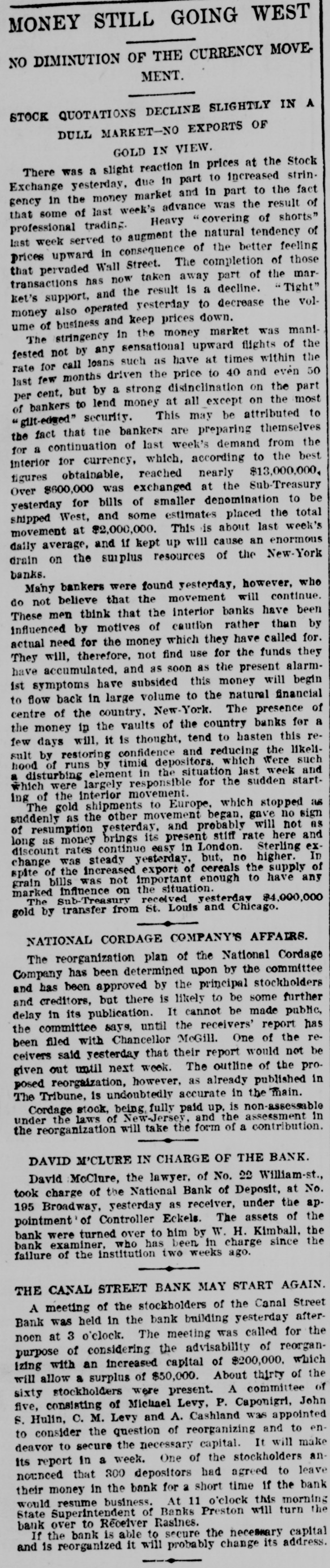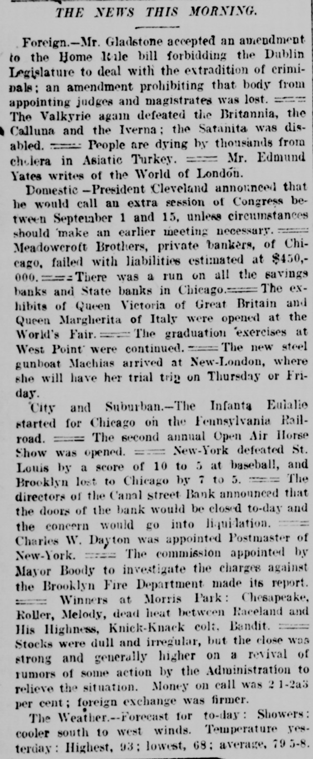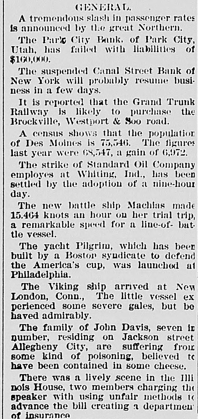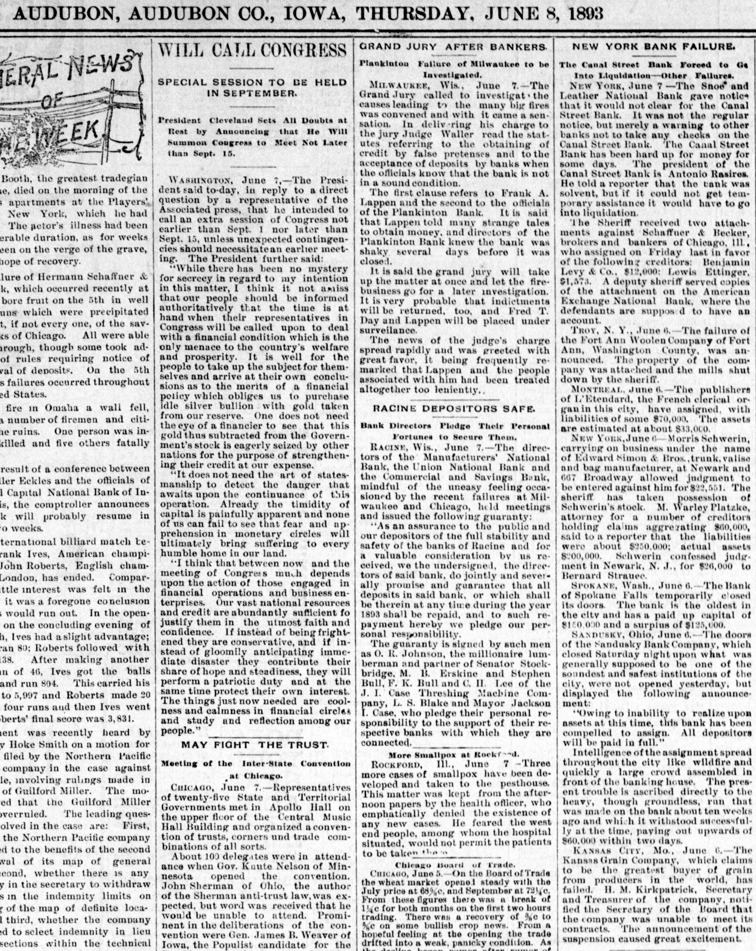 AUDUBON, AUDUBON CO., IOWA, THURSDAY. JUNE 8, 1893 NEW YORK BANK FAILURE. GRAND JURY AFTER BANKERS WILL CALL CONGRESS Plankinton Failure of Milwaukee to be The Canal Street Bank Forced to Ge Investigated. Into Liquldation-Other Failures. SPECIAL SESSION TO BE HELD ERAL NEWS MILWAUKEE, Wis., June 7.-The NEW YORK, June -The Snoe® and IN SEPTEMBER. Grand Jury called to investigat the Leather National Bank gave notice that it would not clear for the Canal causes leading to the many big fires was convened and with it came a senStreet Bank. It was not the regular President Cleveland Sets All Doubts at sation. In deliverir his charge to notice, but merely a warning to other Rest by Announcing that He will the jury Judge Waller read the statbanks not to take any checks on the Summon Congress to Meet Not Later Canal Street Bank. The Canal Street utes referring to the obtaining of than Sept. 15. credit by false pretenses and to the Bank has been hard up for money for acceptance of deposits by banks when some days. The president of the the officials know that the bank is not Canal Street Bank is Antonio Rasires. Booth, the greatest tradegian WASHINGTON, June ?,-The Presiin a sound condition. He told a reporter that the bank was e, died on the morning of the dent said to-day, in reply to a direct The first clause refers to Frank A. solvent, but if it could not get temquestion by a representative of the apartments at the Players' Lappen and the second to the officials porary assistance it would have to go Associated press, that he intended to of the Plankinton Bank. It is said into liquidation. New York, which lie had call an extra session of Congress not The Sheriff received two attachthat Lappen many strange tales The actor's illness had been earlier than Sept. 1 nor later than to obtain money. and directors of the ments against Schaffner & Becker, erable duration, as for weeks Sept. 15, unless unexpected contingenPlankinton Bank knew the bank was brokers and bankers of Chicago, III. cies should necessitatean earlier meeteen on the verge of the grave, shaky several days before it was who assigned on Friday last in favor ing. The President further said: closed. of the following creditors: Benjamin hope of recovery. 'While there has been no mystery Levy & Co., $12,000: Lewis Ettinger, It is said the grand jury will take lure of Hermann Schaffner & for secrecy in regard to my intention up the matter at once and let the fire$1,573. A deputy sheriff served copies in this matter, I think it not amiss k, which occurred recently at of the attachment on the American business go for a later investigation. that our people should be informed bore fruit on the 5th in well Exchange National Bank, where the It is very probable that indictments authoritatively that the time is at will be returned, too, and Fred T. defendants are supposed to have an uns which were precipitated hand when their representatives in account. Day and Lappen will be placed under t, if not every one, of the savCongress will be called upon to deal surveilance. TROY, N. Y. June -The failure of with a financial condition which is the ks of Chicago. All were able The news of the judge's charge the Fort Ann Woolen Company of Fort only menace to the country's welfare rough, though some took adspread rapidly and was greeted with Ann, Washington County. was anand prosperity. It is well for the of rules requiring notice of great favor, it being frequently renounced. The property of the compeople to take up the subject for themval of deposits. On the 5th pany was attached and the mills shut marked that Lappen and the people selves and arrive at their own concluassociated with him had been treated down by the sheriff. s failures occurred throughout sions as to the merits of a financial altogether too leniently. MONTREAL June The publishers ed States. policy which obliges us to purchase of L'Etendard, the French clerical oridle silver bullion with gold taken fire in Omaha a wall fell, RACINE DEPOSITORS SAFE. this city, have assigned, with from our reserve. One does not need liabilities of some $70,000. The assets a number of firemen and citiBank Directors Pledge Their Personal the eye of a financier to see that this are estimated at about $33,000. he ruins. One person was ingold thus subtracted from the GovernFortunes to Secure Them. NEW YORK, B-Morris Schwerin, killed and five others fatally ment's stock is eagerly seized by other RACINE, Wis., June 7.-The direccarrying on business under the name nations for the purpose of strengthentors of the Manufacturers' National of Edward Simon & Bros., trunk, valise ing their credit at our expense. Bank, the Union National Bank and and bag manufacturer, at Newark and result of a conference between "It does not need the art of statesthe Commercial and Savings Bank, 667 Broadway allowed judgment to ller Eckles and the officials of manship to detect the danger that mindful of the uneasy feeling occabe entered against him for The 1 Capital National Bank of Inawaits upon the continuance of this sioned by the recent failures at Milsheriff has taken possession of operation. Already the timidity of is, the comptroller announces waukee and Chicago, held meetings Schwerin's stock. M. Warley Platzke, capital is painfully apparent and none and issued the following guaranty: k will probably resume in attorney for a number of creditors of us can fail to see that fear and ap o weeks. As an assurance to the public and holding claims aggrerating $60,000, prehension in monetary circles will our depositors of the full stability and said to a reporter that the liabilities ternational billiard match teultimately bring suffering to every safety of the banks of Racine and for were about $350,000; actual assets humble home in our land. rank Ives, American champia valuable consideration by us re$200,000. Schwerin confessed judgthink that between now and the ceived, we the undersigned, the direeJohn Roberts, English chamment in Newark