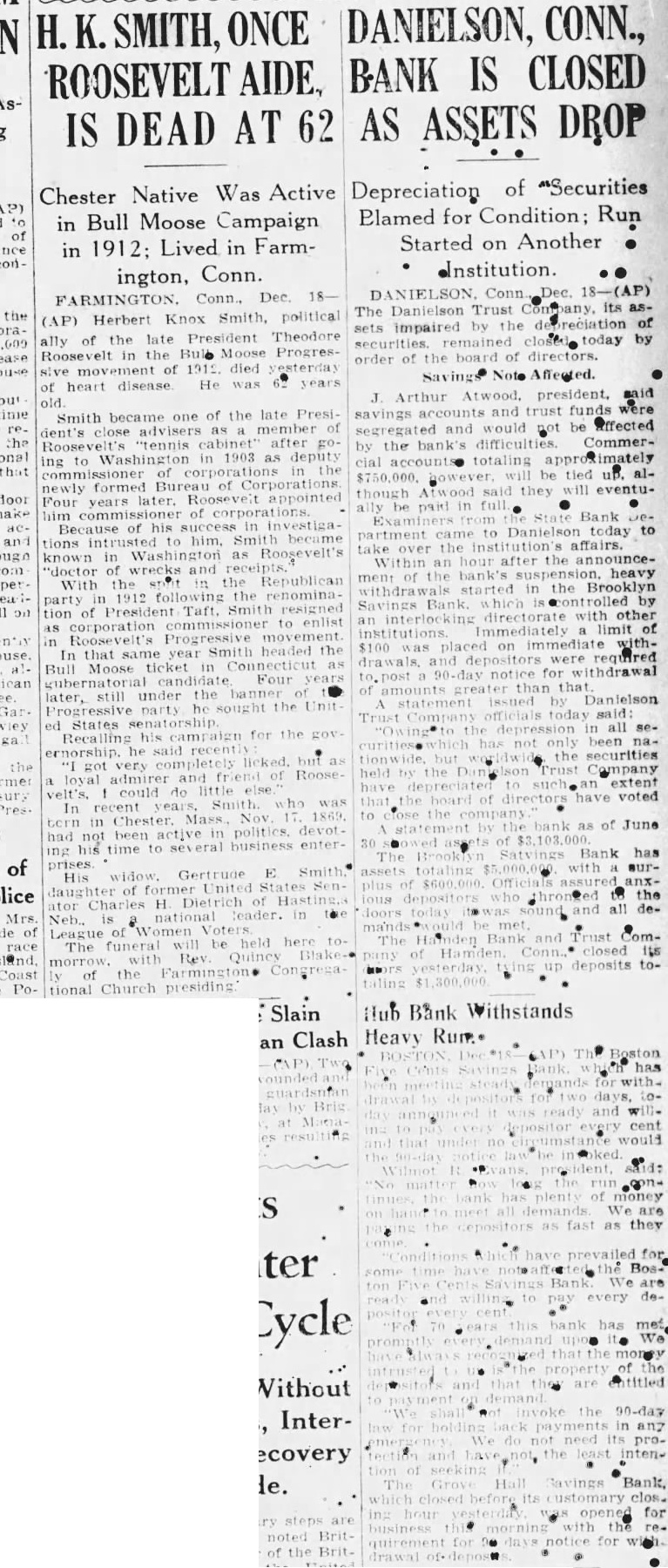FARMINGTON. Conn., Dec. Herbert Knox political (AP) late President Theodore ally of the in the Moose sive movement of of heart disease old became one of the Smith close after Roosevelt's Washington in 1903 as deputy ing to in newly formed Bureau of later. appointed Four years of him Because of his success intrusted to Smith tions known in Washington as "doctor wrecks and the With following the renominaparty of President Smith tion to enlist corporation Roosevelt's Smith the In that same year Bull Moose ticket candidate Four later, under the he the party ed States for Recalling ernorship he got and Roose loyal admirer could do In recent Mass devot had not been his time to several Gertrude E His of former Charles H. Dietrich national in League held here funeral Quincy of the tional Church