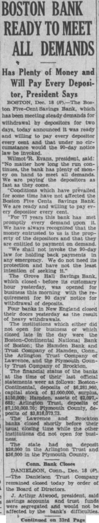Has Plenty of Money and Will Pay Every Depositor, President Says BOSTON, Dec. 18 Boston Bank, which meeting steady demands for withdrawal by depositors for two days, today it was ready and willing to pay every depositor every cent and that under no circumstance would the 90-day notice law be invoked. Wilmot Evans, president, said: "No matter how long the run continues, the bank has plenty of monhand to meet all demands. We are paying the depositors as fast as they come. Conditions which have prevailed some have affected the Boston Five Cents Savings We ready and willing to pay ery every cent. 77 years bank has met promptly every demand upon We have always that the entrusted to us the property the and that they to payment on demand. shall not invoke the 90-day law for holding back any We do not need its protection and have not the least intention of seeking The Grove Hall Savings Bank, which closed before its hour yesterday, was opened for business this with the requirement for 90 days' notice for withdrawal Four banks in New England closed their yesterday as the result withdrawals. The institutions which either did not open for business which closed in the were the National Bank the Hamden Bank Trust Company of Hamden, Conn., the Arlington Trust Company of the Plymouth CounTrust Company of Brockton. The financial status of the banks at the time of their last official statements weer as BostonContinental, of capital stock Hamden, assets of 683; Arlington Trust, deposits Plymouth County, deposits of The Lawrence and Brockton banks closed shortly their usual closing time while the other institutions did not open for business The state had on deposit in the Arlington Trust and in the Plymouth County.