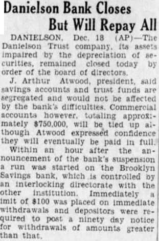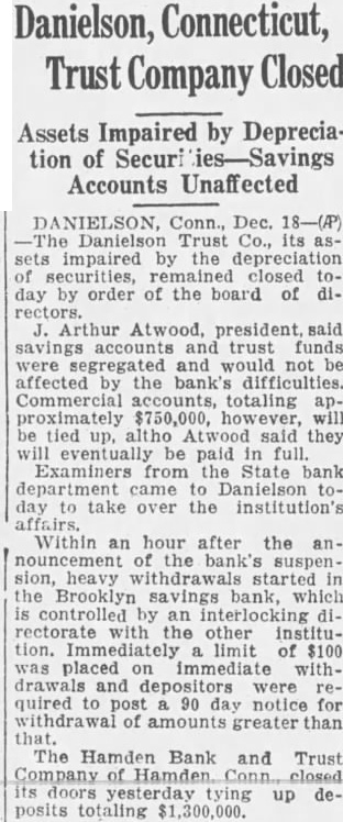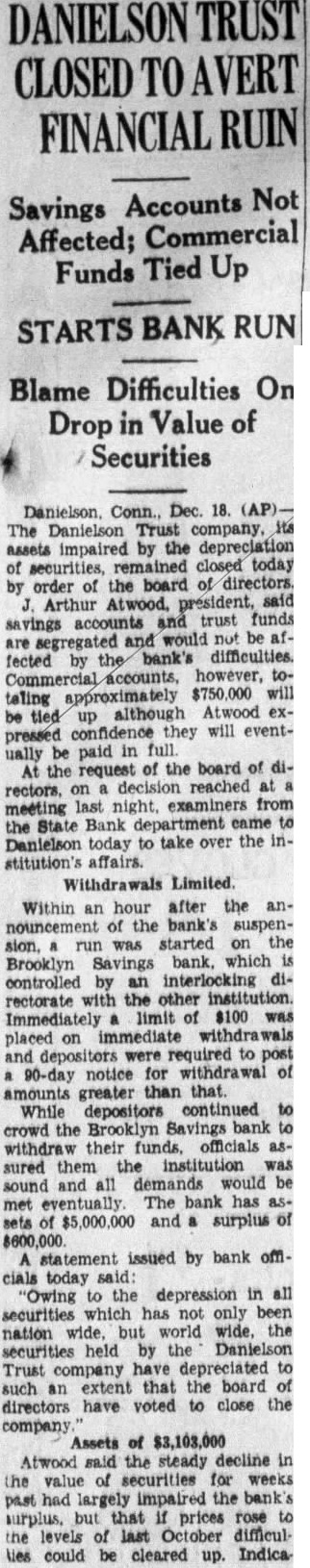 DANIELSON, Dec. 18 (AP)-The Danielson Trust company. its assets by the depreciation of curities, remained closed today by order of the board of directors. Arthur savings and trust are segregated would be affected by the accounts however. totaling approx:will be tied up Atwood expressed confidence they eventually be paid in Within an hour after the anof the bank's suspension started on the Brooklyn Savings bank, which controlled an interlocking directorate with the other institution. Immediately imit of $100 was placed immediate on withdrawals and depositors were required to post ninety day notice for withdrawals of amounts greater than that
