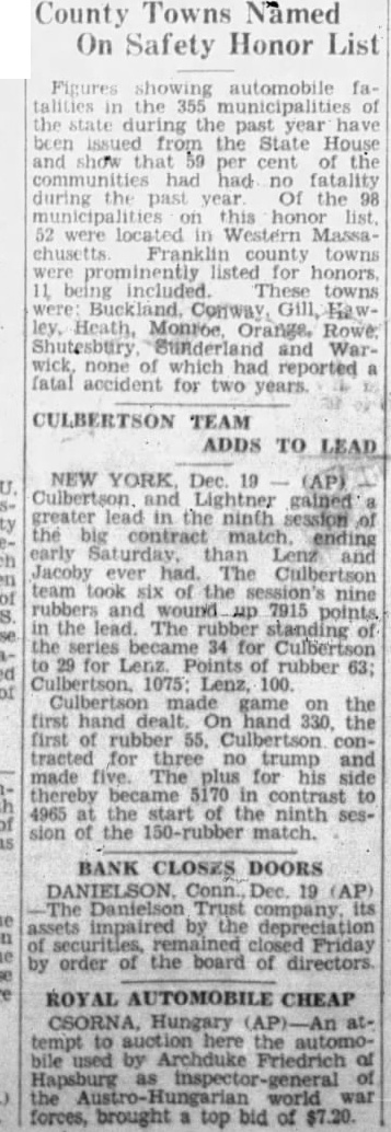 Figures showing automobile fatalities in the 355 municipalities of the state during the past year have the State House and show per cent of the had had no fatality during Of the 98 honor list 52 were located Western MassaFranklin county towns were listed for honors 11, included These towns Shutesbury Sunderland and Warwick, none of which had reported fatal accident for two years.