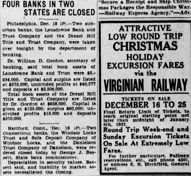 Philadelphia, Dec. subATTRACTIVE urban Lansdowne Bank Trust Company and the Drexel Hill LOW ROUND TRIP Title and Trust taken CHRISTMAS over tonight by the department of banking. HOLIDAY Dr. William D. Gordon. secretary of EXCURSION FARES banking, book assets Lansdowne Bank and Trust were the 954,000. and surplus are listed profits $40,377 RAILWAY VIRGINIAN deposits Total book assets the Drexel Hill Trust Company are listed TICKETS SALE Dr. Gordon $938,000. Capital 16 TO 25 surplus $90,000: ungiven Final Return Limit Tickets. divided profits $15,000 deposits midnight January