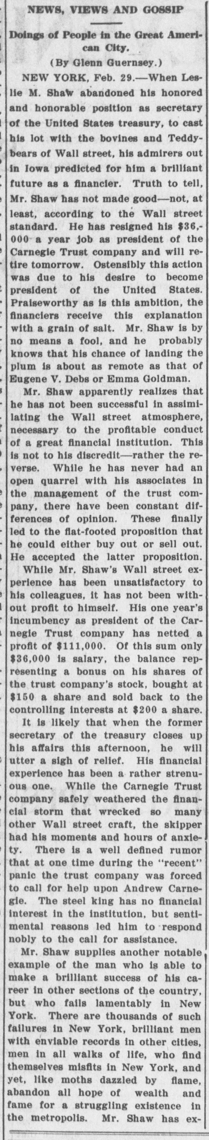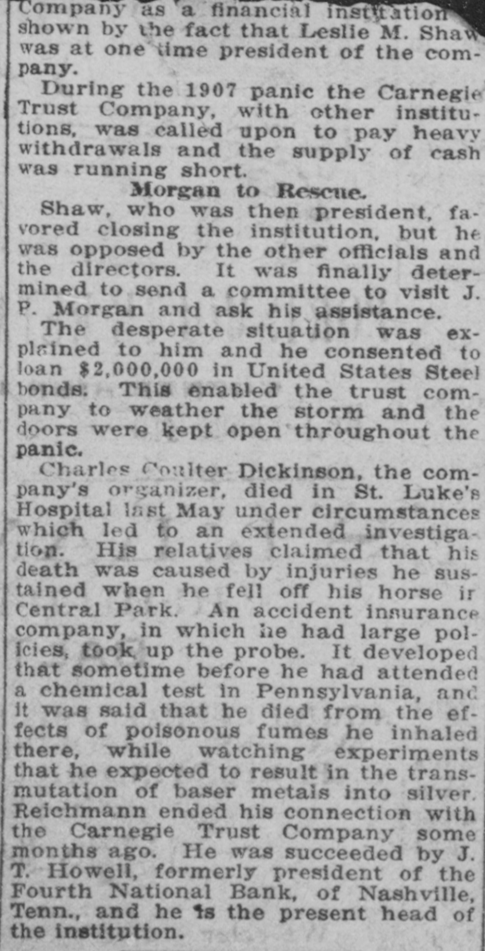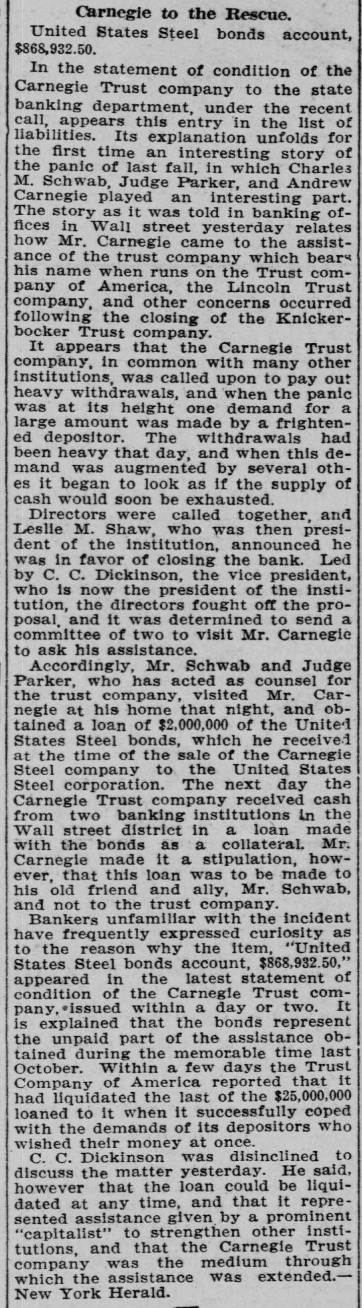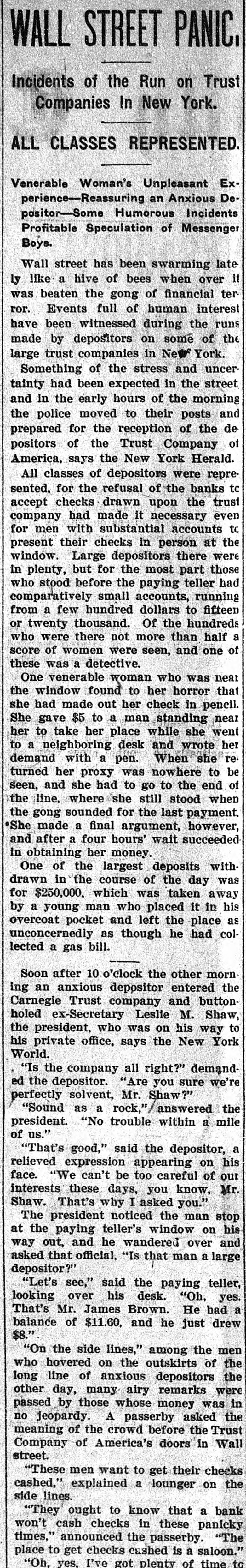 WALL STREET PANIC. Incidents of the Run on Trust Companies In New York. ALL CLASSES REPRESENTED. Venerable Woman's Unpleasant Experience-Reassuring an Anxious Depositor-Some Humorous Incidents Profitable Speculation of Messenger Boys. Wall street has been swarming late ly like a hive of bees when over It was beaten the gong of financial ter ror. Events full of human interest have been witnessed during the runs made by depositors on some of the large trust companies in Ne York. Something of the stress and uncer tainty had been expected in the street and in the early hours of the morning the police moved to their posts and prepared for the reception of the de positors of the Trust Company of America, says the New York Herald. All classes of depositors were repre sented, for the refusal of the banks tc accept checks drawn upon the trust company had made it necessary even for men with substantial accounts to present their checks in person at the window. Large depositors there were in plenty, but for the most part those who stood before the paying teller had comparatively small accounts, running from a few hundred dollars to fifteen or twenty thousand. Of the hundreds who were there not more than half a score of women were seen, and one of these was a detective. One venerable woman who was near the window found to her horror that she had made out her check in pencil. She gave $5 to a man standing near her to take her place while she went to a neighboring desk and wrote her demand with a pen. When she returned her proxy was nowhere to be seen, and she had to go to the end of the line. where she still stood when the gong sounded for the last payment. *She made a final argument, however, and after a four hours' wait succeeded in obtaining her money. One of the largest deposits withdrawn in the course of the day was for $250,000. which was taken away by a young man who placed it in his overcoat pocket and left the place as unconcernedly as though he had collected a gas bill. Soon after 10 o'clock the other morn ing an anxious depositor entered the Carnegie Trust company and buttonholed ex-Secretary Leslie M. Shaw, the president. who was on his way to his private office, says the New York World. "Is the company all right?" demanded the depositor. "Are you sure we're perfectly solvent, Mr. Shaw? "Sound as a rock,"/answered the president. "No trouble within a mile of us." "That's good," said the depositor, a relieved expression appearing on his face. "We can't be too careful of our interests these days, you know, Mr. Shaw. That's why I asked you." The president noticed the man stop at the paying teller's window on his way out, and he wandered over and asked that official, "Is that man a large depositor?" "Let's see," said the paying teller, looking over his desk. "Oh, yes. That's Mr. James Brown. He had a balance of $11.60, and he just drew $8." "On the side lines," among the men who hovered on the outskirts of the long line of anxious depositors the other day, many airy remarks were passed by those whose money was in no jeopardy. A passerby asked the meaning of the crowd before the Trust Company of America's doors in Wall street. "These men want to get their checks cashed," explained a lounger on the side lines. "They ought to know that a bank won't cash checks in these panicky times," announced the passerby. "The place to get checks cashed is a saloon." "Ob L'ue