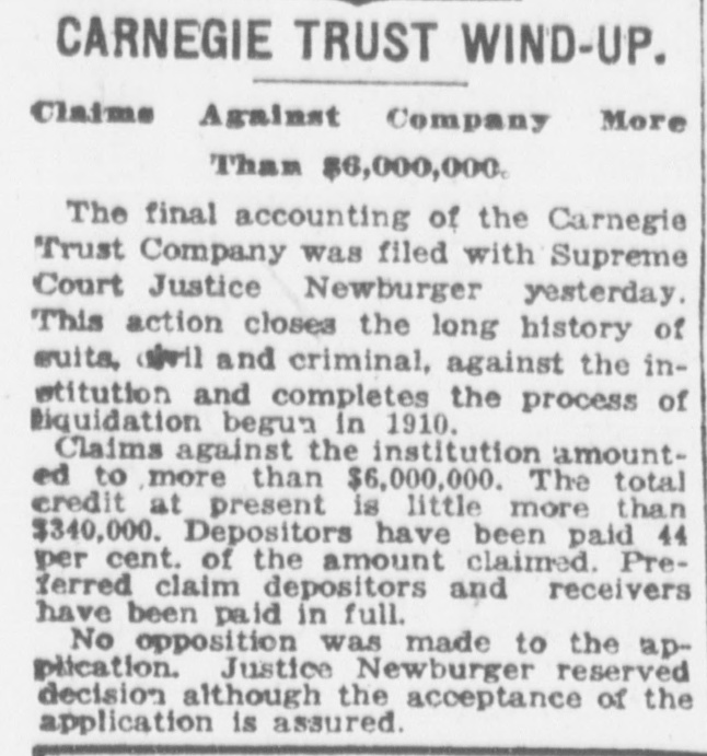 CARNEGIE TRUST WIND-UP. Claims Against Company More Than $6,000,000. The final accounting of the Carnegie Trust Company was filed with Supreme Court Justice Newburger yesterday. This action closes the long history of suita, will and criminal, against the institution and completes the process of liquidation begun in 1910. Claims against the institution amounted to more than $6,000,000. The total credit at present is little more than $340,000. Depositors have been paid 44 per cent. of the amount claimed. Preferred claim depositors and receivers have been paid in full. No opposition was made to the application. Justice Newburger reserved decision although the acceptance of the application is assured.