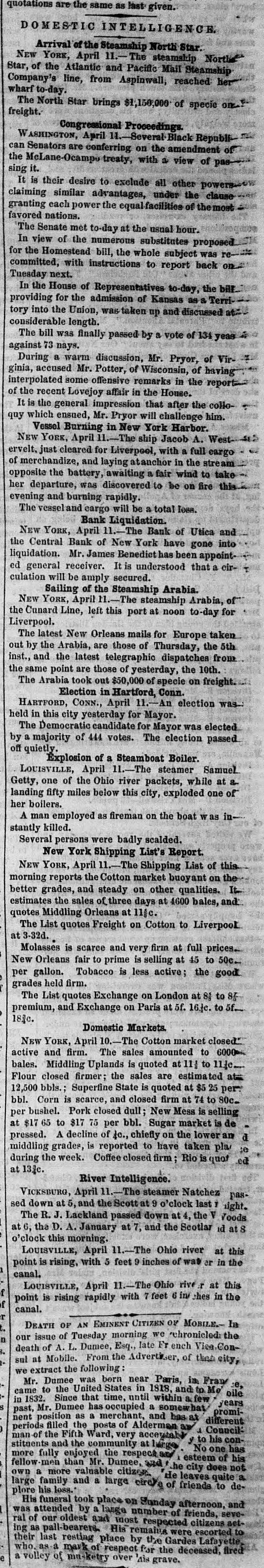 quotations are the same as last given. OMESTIC INTELLIGENCE Arrival of the Steamship North Star. North Star, and Pacific Mail NEW of YORK, the Atlantic April 11.-The steamship Steamship Company's line, from Aspinwall, reached her wharf to-day. The North Star brings $1,150,000 of specie on freight. Congressional Proceedings. WASHINGTON, April 11 Several-Black Republican Senators are conferring on the amendment of the McLane-Ocampo treaty with a view of pass sing it. It is their desire to exclude all other powers claiming similar advantages, under the clause granting each power the equal facilities of themost favored nations. The Senate met to-day at the usual hour. In view of the numerous substitutes proposed for the Homestead bill, the whole subject was re--committed, with instructions to report back on Tuesday next. In the House of Representatives to-day, the bill. providing for the admission of Kansas as a Territory into the Union, taken up and discussed at... considerable length. The bill was finally passed by a vote of 134 yeas a against 73 nays. During a warm discussion, Mr. Pryor, of Virginia, of accused Mr. offensive Potter, of remarks Wisconsin, in the having interpolated some report of the recent Lovejoy affair in the House. It is the general impression that after the colloquy which ensued, Mr. Pryor will challenge him. Vessel Burning in New York Harbor. NEW YORK, April 11. The ship Jacob A. West ervelt, just cleared for Liverpool, with a full cargo of merchandize, and laying atanchor in the stream opposite the battery, awaiting a fair wind to take her departure, was discovered to be on fire this. evening and burning rapidly. The vessel and cargo will be a total loan. Bank Liquidation. NEW YORK, April 11.-The Bank of Utica and the Central Bank of New York have gone into liquidation. Mr. James Benediet ha been appointed general receiver. It is understood that a circulation will be amply secured. Sailing of the Steamship Arabia. NEW YORK, April 11.-The steamship Arabia, of the Cunard Line, left this port at noon to-day for Liverpool. The latest New Orleans mails for Europe taken out by the Arabia, are those of Thursday, the 5th inst., and the latest telegraphic dispatches from the same point are those of yesterday, the 10th. The Arabia took out $50,000 of specie on freight Election in Hartford, Conn. HARTFORD, CONN., April 11.-An election washeld in this city yesterday for Mayor. The Democratic candidate for Mayor was elected by a majority of 444 votes. The election passed off quietly Explosion of a Steamboat Boiler. LOUISVILLE, April -The steamer Samuel Getty, one of the Ohio river packets, while at a landing fifty miles below this city, exploded one of her boilers. A man employed as fireman on the boat W as instantly killed. Several persons were badly scalded. New York Shipping List's Report. NEW YORK, April The Shipping List of this morning reports the Cotton market buoyant on the better grades, and steady on other qualities. It.. estimates the sales of three days at 4600 bales, and quotes Middling Orleans at 11/c. The List quotes Freight on Cotton to Liverpook at 3-32d. Molasses is scarce and very firm at full prices... New Orleans fair to prime is selling at 45 to 50c. per gallon. Tobacco is less active; the good grades held firm. The List quotes Exchange on London at 81 to 87 premium, and Exchange on Paris at 5f. 16.je. to 5f. 183c. Domestic Markets. NEW YORK, April 10.-The Cotton market closed' active and firm. The sales amounted to 6000 bales. Middling Uplands is quoted at 11 to 113c Flour closed firmer; the sales are estimated at 12,500 bbls.: Superfine State is quoted at $5 25 per: bbl. Corn is scarce, and closed firm at 74 to 80c. per bushel. Pork closed dull; New Mess is selling at $17 65 to $17 75 per bbl. Sugar market is de d pressed. A decline of 40., chiefly on the lower an middling grades, is reported to have taken pla to during the week. Coffee closed firm Rio is quot ed at 133c. River Intelligence. VICKSBURG, April -The steamer Natchez passed down at 5, and theScott at 9 o'clock last , ight. The R. J. Lackland passed down at 4, the V Foods at 6, the D. A. January at 7, and the Scotlar d at 8 o'clock this morning. LOUISVILLE, April 11.-The Ohio river at this point is rising, with 5 feet 9 inches of wat or in the canal. LOUISVILLE, April 11.-The Ohio rive r at this point is rising rapidly with 7 feet 6 in ches in the canal. DEATH OF AN EMINENT CITIZEN or MOBILE. In our issue of Tuesday morning we chronicled the n death of A. L. Dumee, Esq. late Fr ench Vice Consul at Mobile. From the Advertizer, of that city, we extract the following Mr. Dumee was born near Paris, in Fran e. came to the United States in 1818, and to Mo oile in 1832. Since that time, until within a few years past, Mr. Damee has occupied a somewhat prominent position as a merchant, and has at different periods filled the posts of Alderman aw 4 Council man of the Fifth Ward, very acceptable to his y constituents and the community at larger No one has more fully enjoyed the respectan esteem of his fellow men than Mr. Dumee, and, he city does not own a more valuable citizen de leaves quite a large family and a large circle of friends to deplore his loss. His funeral took place on Sunday afternoon, and was attended by a large number of friends, several of oldest and most respected citizens acting as pall-bearers. His remaina were escorted to their last resting place by the Gardes Lafayette, who, a mark of respect for the deceased, fired a volley of masketry over Ais grave.