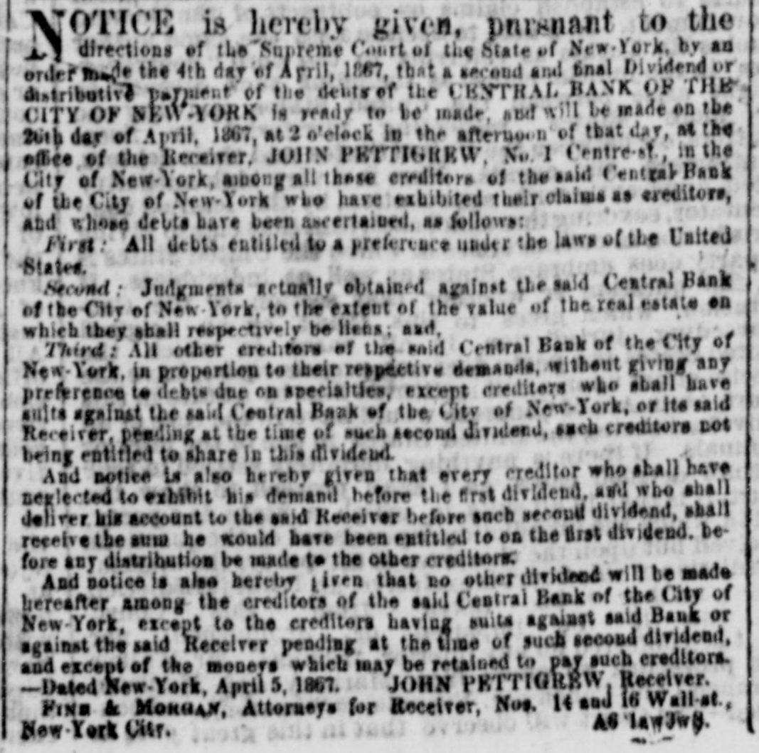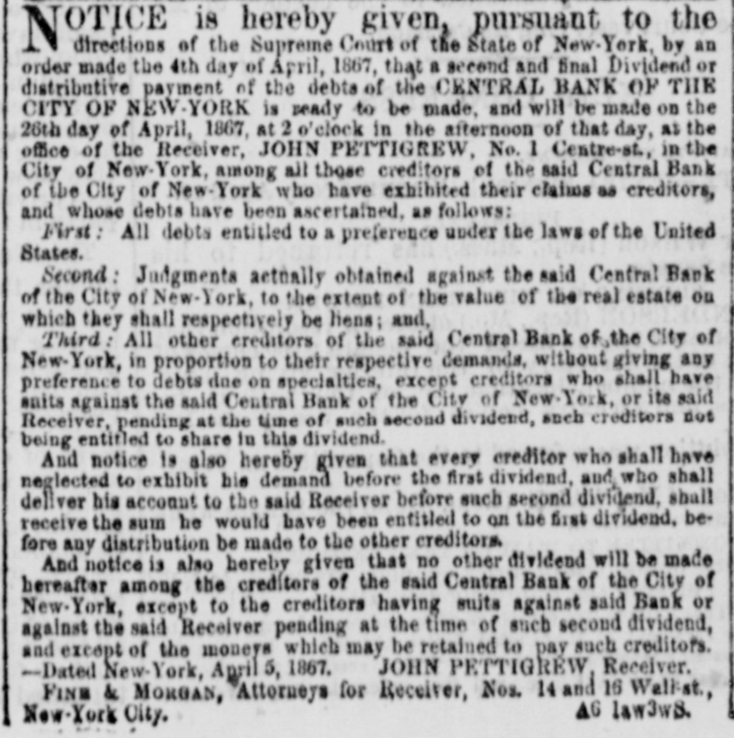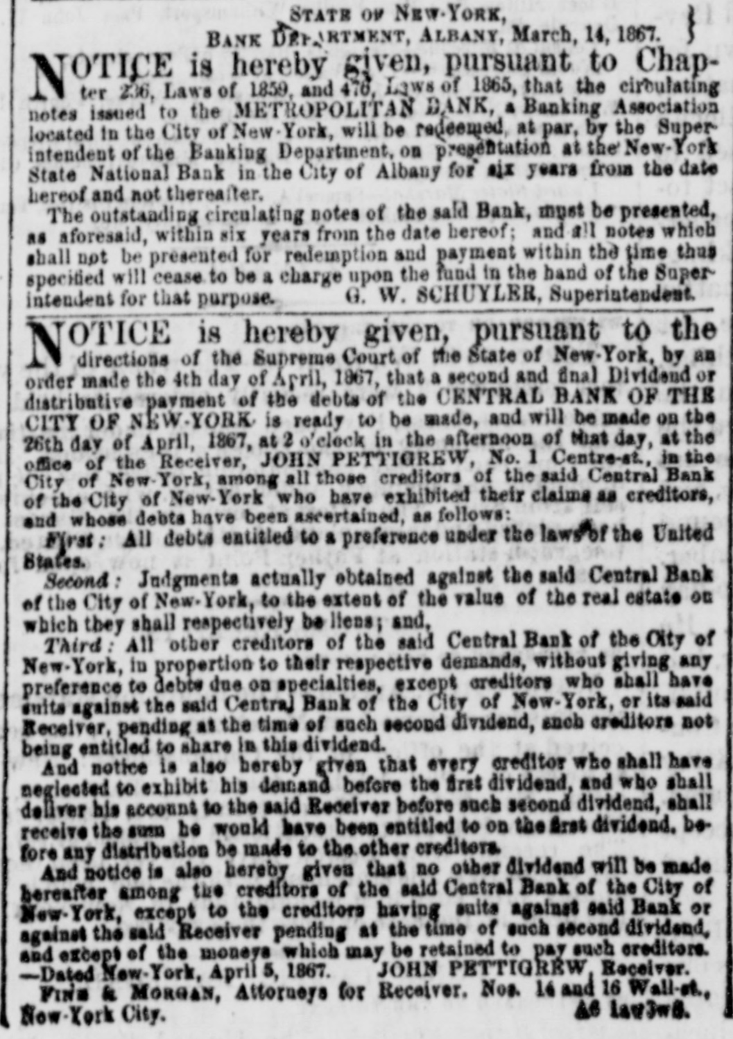 STATE OF NEW-YORK, BANK DEPARTMENT ALBANY, March, 14, 1867. NOTICE is hereby given, pursuant to Chapter 236, Laws of 1859, and 476, Laws of 1865, that the circulating notes issued to the METROPOLITAN BANK, & Banking Association located in the City of New York, will be redeemed at par, by the Super intendent of the Banking Department, on presentation at the New-York State National Bank in the City of Albany for six years from the date hereof and not thereafter. The outstanding circulating notes of the said Bank, must be presented, as aforesaid, within six years from the date hereof; and all notes which shall not be presented for redemption and payment within the time thus specified will cease to be a charge upon the fund in the hand of the Super G. W. SCHUYLER, Superintendent intendent for that purpose. NOTICE is hereby given, pursuant to the directions of the Supreme Court of the State of New-York, by an order made the 4th day of April, 1867, that a second and final Dividend or distributive payment of the debts of the CENTRAL BANK OF THE CITY OF NEW-YORK is ready to be made, and will be made on the 26th day of April, 1867, at 2 o'clock in the afternoon of that day, at the office of the Receiver, JOHN PETTIGREW, No. 1 Centre-at. in the City of New York, among all those creditors of the said Central Bank of the City of New-York who have exhibited their claims as creditors, and whose debts have been ascertained, as follows: First: All debts entitled to & preference under the laws of the United States. Second: Judgments actually obtained against the said Central Bank of the City of New-York, to the extent of the value of the real estate on which they shall respectively be liens; and, Third: All other creditors of the said Central Bank of the City of New-York, in propertion to their respective demands, without giving any preference to debts due on specialties, except creditors who shall have suits against the said Central Bank of the City of New York, or its said Receiver, pending at the time of such second dividend, ench creditors not being entitled to share in this dividend. And notice is also hereby given that every creditor who shall have neglected to exhibit his demand before the first dividend, and who shall deliver his account to the said Receiver before such second dividend, shall receive the sum be would have been entitled to on the first dividend. be fore any distribation be made to the other creditors. And notice is also hereby given that no other dividend will be made hereafter among the creditors of the said Central Bank of the City of New-York, except to the creditors having suits against said Bank or against the said Receiver pending at the time of such second dividend, and except of the moneya which may be retained to pay such creditors. JOHN PETTIGREW, Receiver. -Dated New-York, April 5, 1867. FINE k MORGAN, Attorneys for Receiver. Nos. and 16 Wall-et., law3w8. New-York City.