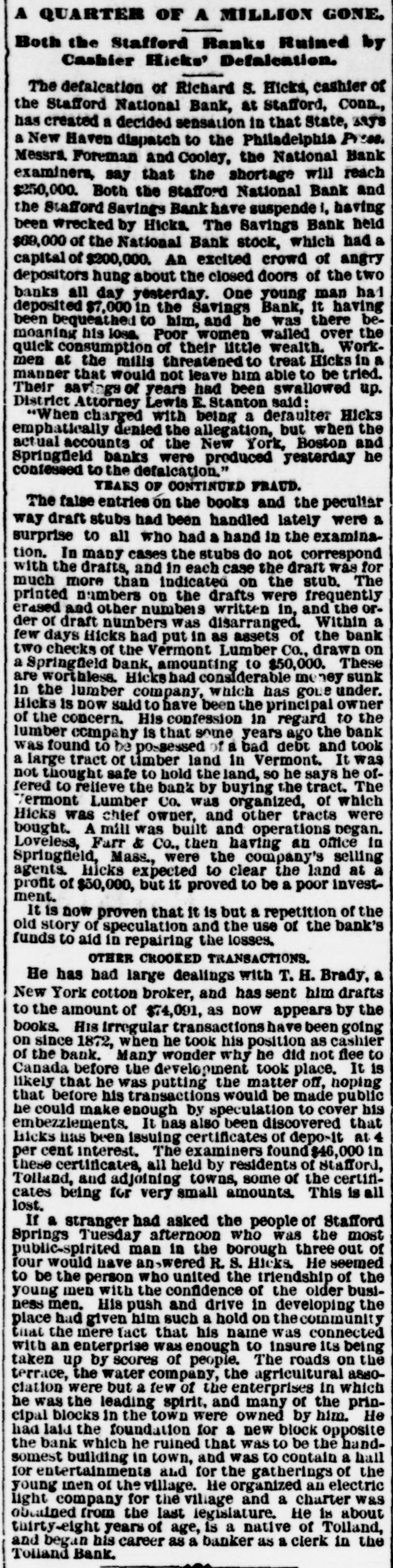 A QUARTER OF A MILLION GONE. Both the Stafford Banks Ruined by Cashier Hicks' Defalcation. ... Both the Stafford National Bank and the Stafford Savings Bank have suspended, having been wrecked by Hicks. An excited crowd of angry depositors hung about the closed doors of the two banks all day yesterday.