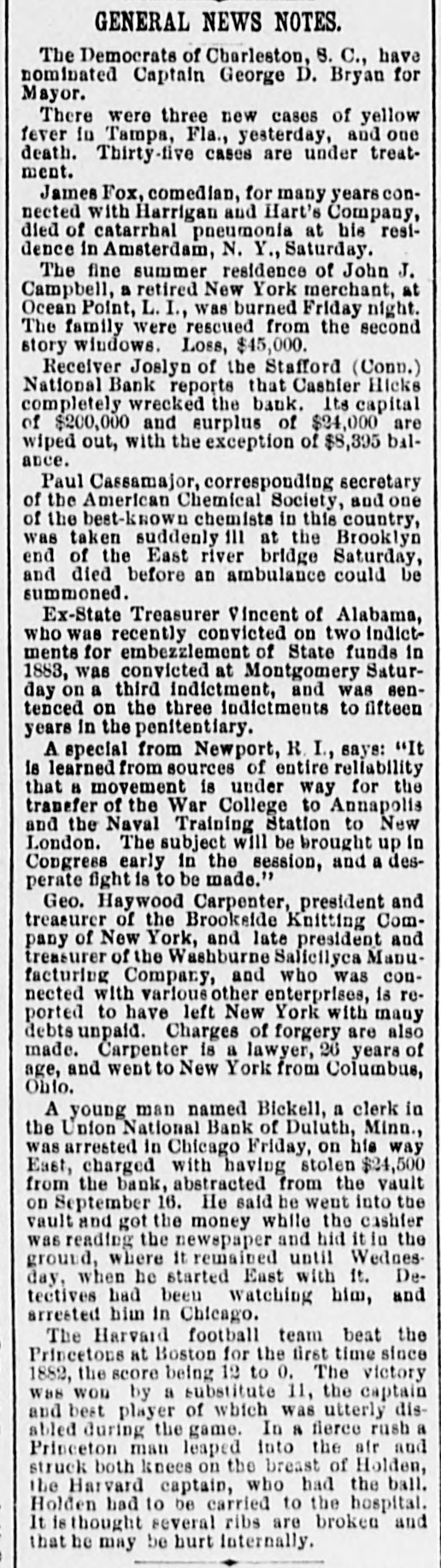 # GENERAL NEWS NOTES. The Democrats of Charleston, S. C., have nominated Captain George D. Bryan for Mayor. There were three new cases of yellow fever in Tampa, Fla., yesterday, and one death. Thirty-five cases are under treatment. James Fox, comedian, for many years connected with Harrigan and Hart's Company, died of catarrhal pneumonia at his residence in Amsterdam, N. Y., Saturday. The fine summer residence of John J. Campbell, a retired New York merchant, at Ocean Point, L. I., was burned Friday night. The family were rescued from the second story windows. Loss, $45,000. Receiver Joslyn of the Stafford (Conn.) National Bank reports that Cashier Hicks completely wrecked the bank. Its capital of $200,000 and surplus of $24,000 are wiped out, with the exception of $8,395 balance. Paul Cassamajor, corresponding secretary of the American Chemical Society, and one of the best-known chemists in this country, was taken suddenly ill at the Brooklyn end of the East river bridge Saturday, and died before an ambulance could be summoned. Ex-State Treasurer Vincent of Alabama, who was recently convicted on two indictments for embezzlement of State funds in 1883, was convicted at Montgomery Saturday on a third indictment, and was sentenced on the three indictments to fifteen years in the penitentiary. A special from Newport, R. I., says: "It is learned from sources of entire reliability that a movement is under way for the transfer of the War College to Annapolis and the Naval Training Station to New London. The subject will be brought up in Congress early in the session, and a desperate fight is to be made." Geo. Haywood Carpenter, president and treasurer of the Brookside Knitting Company of New York, and late president and treasurer of the Washburne Salicilyca Manufacturing Company, and who was connected with various other enterprises, is reported to have left New York with many debts unpaid. Charges of forgery are also made. Carpenter is a lawyer, 26 years of age, and went to New York from Columbus, Ohio. A young man named Bickell, a clerk in the Union National Bank of Duluth, Minn., was arrested in Chicago Friday, on his way East, charged with having stolen $24,500 from the bank, abstracted from the vault on September 16. He said he went into the vault and got the money while the cashier was reading the newspaper and hid it in the ground, where it remained until Wednesday, when he started East with it. Detectives had been watching him, and arrested him in Chicago. The Harvard football team beat the Princetons at Boston for the first time since 1882, the score being 12 to 0. The victory was won by a substitute 11, the captain and best player of which was utterly disabled during the game. In a fierce rush a Princeton man leaped into the air and struck both knees on the breast of Holden, the Harvard captain, who had the ball. Holden had to be carried to the hospital. It is thought several ribs are broken and that he may be hurt internally.