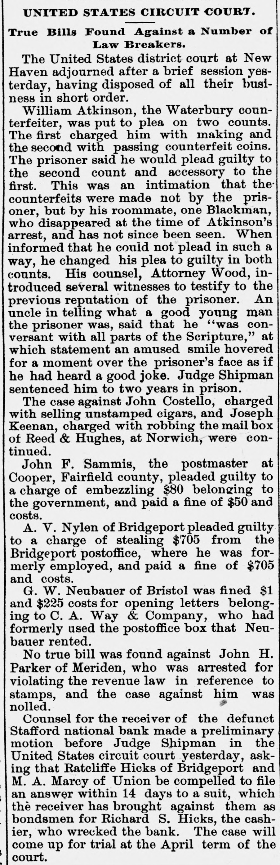 UNITED STATES CIRCUIT COURT. True Bills Found Against a Number of Law Breakers. The United States district court at New Haven adjourned after a brief session yesterday, having disposed of all their business in short order. William Atkinson, the Waterbury counterfeiter, was put to plea on two counts. The first charged him with making and the second with passing counterfeit coins. The prisoner said he would plead guilty to the second count and accessory to the first. This was an intimation that the counterfeits were made not by the prisoner, but by his roommate, one Blackman, who disappeared at the time of Atkinson's arrest, and has not since been seen. When informed that he could not plead in such a way, he changed his plea to guilty in both counts. His counsel, Attorney Wood, introduced several witnesses to testify to the previous reputation of the prisoner. An uncle in telling what a good young man the prisoner was, said that he "was conversant with all parts of the Scripture," at which statement an amused smile hovered for a moment over the prisoner's face as if he had heard a good joke. Judge Shipman sentenced him to two years in prison. The case against John Costello, charged with selling unstamped cigars, and Joseph Keenan, charged with robbing the mail box of Reed & Hughes, at Norwich, were continued. John F. Sammis, the postmaster at Cooper, Fairfield county, pleaded guilty to a charge of embezzling $80 belonging to the government, and paid a fine of $50 and costs. A. V. Nylen of Bridgeport pleaded guilty to a charge of stealing $705 from the Bridgeport postoffice, where he was formerly employed, and paid a fine of $705 and costs. G. W. Neubauer of Bristol was fined $1 and $225 costs for opening letters belonging to C. A. Way & Company, who had formerly used the postoffice box that Neubauer rented. No true bill was found against John H. Parker of Meriden, who was arrested for violating the revenue law in reference to stamps, and the case against him was nolled. Counsel for the receiver of the defunct Stafford national bank made a preliminary motion before Judge Shipman in the United States circuit court yesterday, asking that Ratcliffe Hicks of Bridgeport and M. A. Marcy of Union be compelled to file an answer within 14 days to a suit, which the receiver has brought against them as bondsmen for Richard S. Hicks, the cashier, who wrecked the bank. The case will come up for trial at the April term of the court.