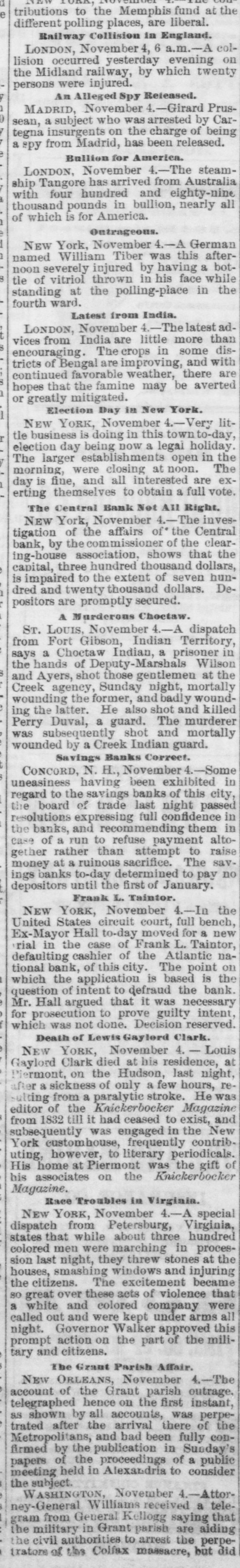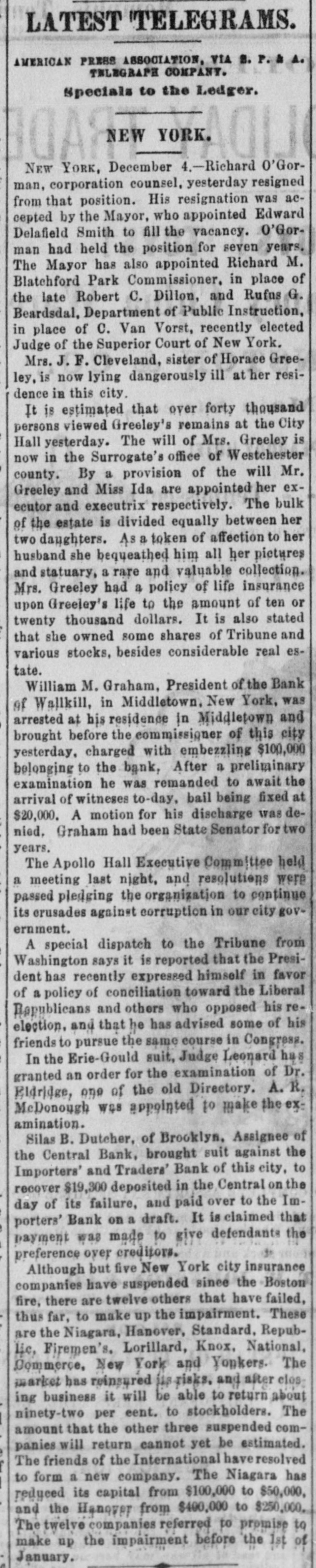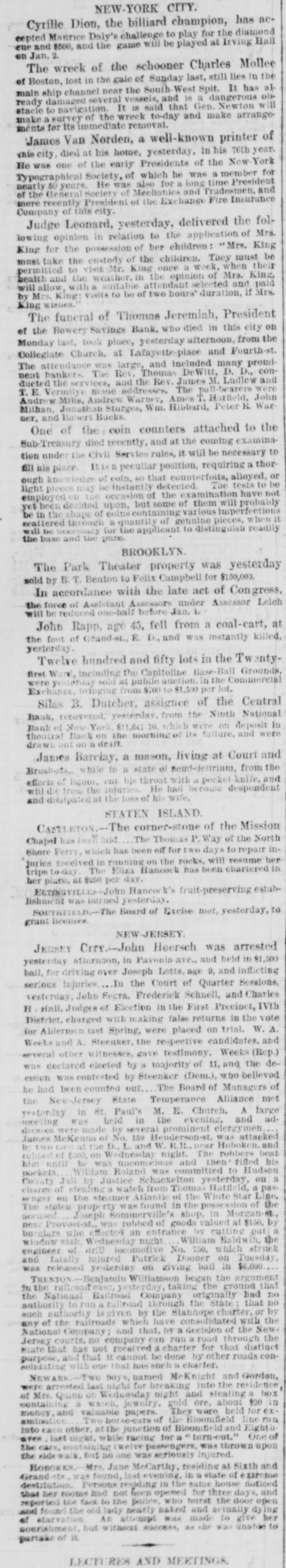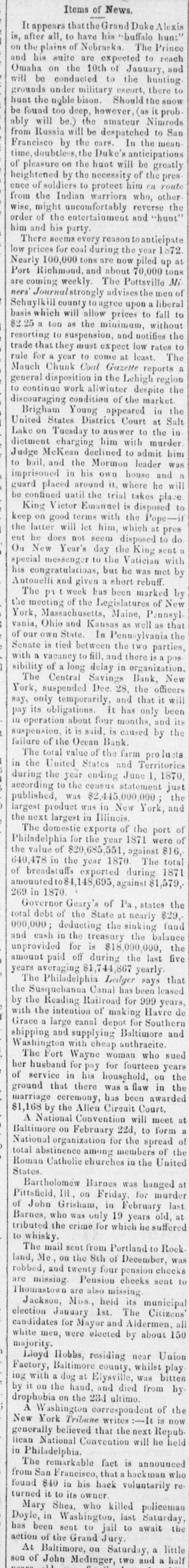 be amateur hunt found the too deep, however Nimrods Russia the ably will be.) will the be despatched to mean San by Duke's time, on the hunt will of be the pleasure the necessity of from Francisco doubtless, by the the cars. him In anticipations en greatly route pres heightened to protect other ence of soldiers warriors who, from the Indian reverse the order wise, might of the entertainment uncomfortably and "hunt' him and his party. reasontoanticipate There the year prices seems every for coal during now piled 1572 up at 100,00 tons and are about 70,000 weekly. The low Nearly Port Richmond, Pottsville tons Mi of ners Journal strongly e coming advises upon the a men liberal Schuylkill county will allow to agree prices to without fall to the minimum, the $2.25 a tou suspension, and rates trade that they must come at least. basis which resorting to as expect low notifies The to a rule for a year Guzette reports Chunk Coal to Lehigh region Mauch in the the general to continue disposition work condition allwinter of the despite market. the discouraging appeared in States to the United Brigham Tuesday Young District to answer Court murder at Salt in Lake on with him dietment declined to was to and McKean charging the Mormon him leader admit Judge and contined is guard the trial to imprisoned bail, placed gatil in around his own it. where house takes disposed he place will be King Victor Emanuel with the Popeon good terms him, which at pres the latter seem keep he does will not let day the disposed King seut to do eut Ou New messenger Year's to but the he Vatician was met his a short special congratulations, given rebuff. with by by Antoaelli and has been marked The p1 putweek of the Legislatures Pennsyl- of New the meeting Massachusetts, Maine, as well as that of vania, York, own Ohio State. and Kansas In Pennsylvania th the two parties, the is tied and there is a with Senate our a vacancy between to fill, delay in organization. New pos of a long Bank, Central 28, the only sibility The suspended Savings Dec. that officers it will It York, temporarily and has only been its say, obligations. months, and in operation it is said, is caused of the Ocean failure suspension, pay its about four the Bank. farm products by the total value of Territories in the United June 1, The the year States ending and statement 1870, just to the $2,445,000,000 largest largest in published, product was was in New York, according during ceusus Illinois. the port and the of the next The domestic exports of 1871 were of for the year against 816, value of 1870. The in the year during 640,478 the Philadelphia $20,685,551, exported $1,579, 1871 total 269 in 1870. of amounted breadstuffs $4,148,695, against the states Governor Geary's State of at Pa, nearly $29, fund total debt of deducting the the sinking balance 000,000; the the cash in the treasury $18,000,000, five and unprovided for off is during the last amount $1,744,867 Philadelphia has been years The averaging paid Canal Ledger yearly says leased that the Susquehanua Railroad for 999 years, de the Reading of making with the a large canal depot Baltimore for shipping with cheap who by Grace intention and supplying anthracite. Havre Southern sued and Washington The Fort Wayne woman for fourteen years the her husband for his pay household, on in the of service there was awarded ground marriage that ceremony, in Circuit has been flaw Court. at to $1,168 by the Allen will meet A National on February Convention 22d, the spread form the of a Baltimore organization for members of total National Roman abstinence Catholic among churches in the United at States. Bartholomew on Barnes Friday. February was for hanged murder last Pittsfield, Grisham, III., in old, John who was only which 19 he to whisky; of tributed Barnes, the crime for years suffered Rock at sent from Portland to The mail the 8th of land, and twenty cheeks sent are are also its robbed, missing. Me, on Pension four missing pension December, checks was to municipal Thomastown Jackson, Miss, 1st. held The Citizens all January Aldermen candidates white men, election for were Mayor elected and by about Union 150 majority. Hobbs, residing near whilst play a dog at and died from it on the hand, ultimo. by Factory, ing with Lloyd Baltimore 23d Elysville, county, was of bitten now the by drophobia Washington on the correspondent :-It is A York Tribune that writes the next Repub generally New believed Convention will he lican in Philadelphia. National fact is announced held who The remarkable that a hackman re from San $40 Fraucisco, in his hack voluntarily turned it to its who killed in Washington, to await has been sent Jary. found Doyle, Mary Shea, owner. to jail last policeman Saturday, little the of John action At of Baltimore, the Grand Medinger, on Saturday, two and a a half