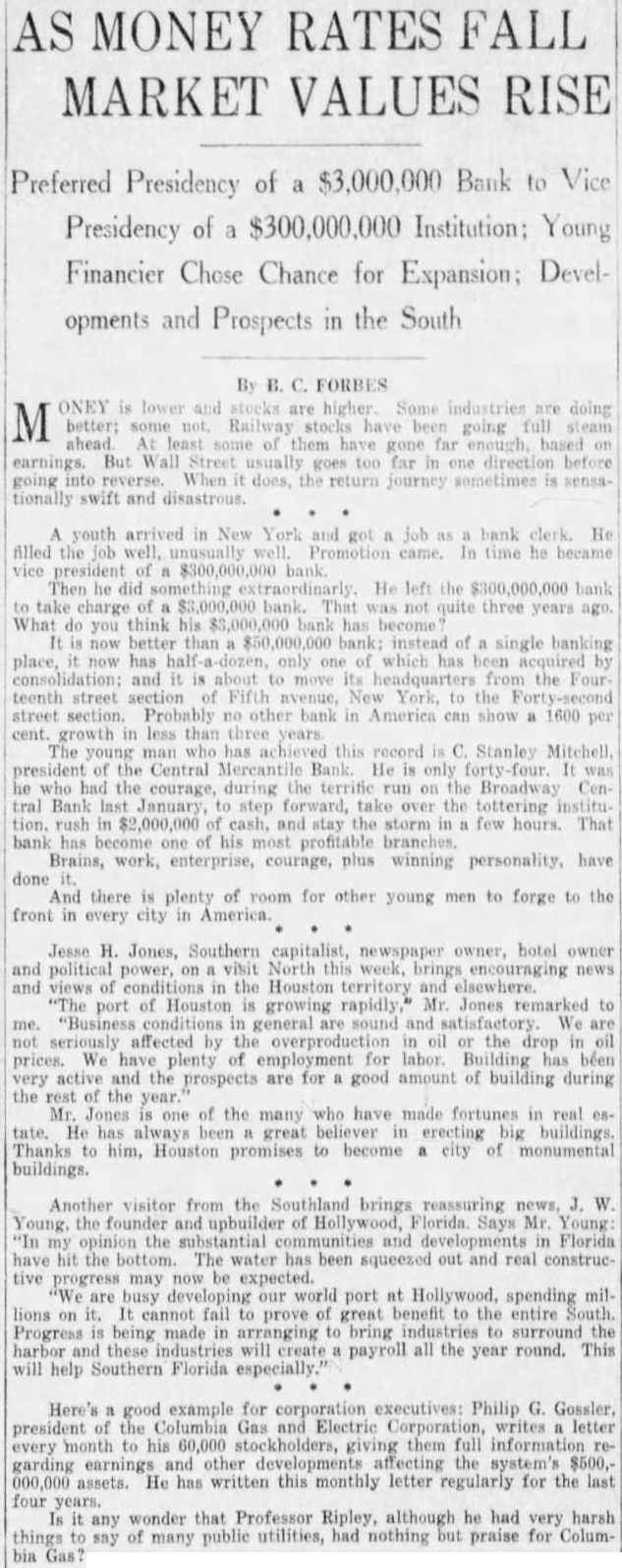 AS MONEY RATES FALL MARKET VALUES RISE Preferred Presidency of a $3,000,000 Bank to Vice Presidency of a $300,000,000 Institution: Young Financier Chose Chance for Expansion; Developments and Prospects in the South By B. FORBES ONEY is lower and stocks are higher Some industries are doing M better; Railway going full steam At them far But too far one direction before goes going into When does, the return journey sometimes is sensationally swift and youth arrived in New York and as bank He filled the well, In time he became vice president of Then he did He left the bank charge of not quite three years ago What do you think his has become is now better than instead of a single banking place, now has half only one of which has been and is about to move its the teenth street section Fifth avenue, York, to the street section. Probably no other bank in America can show 1600 per cent. growth in less than three man who has this record is C. Stanley president the Central Mercantile Bank. He is only was who had the courage, during terrific run on the Broadway tral Bank last January, step forward, over the tottering tion. rush $2,000,000 cash, and stay the storm in few hours. That has of his Brains, work, enterprise, courage, plus winning personality, have done And there is plenty of room for other young to forge to the front in every city in America. Jesse H. Jones, Southern capitalist, newspaper hotel owner and power, on North week, brings and of the Houston territory "The port of Houston growing rapidly,' Mr Jones remarked to and satisfactory We are affected by the overproduction oil the drop in oil prices. We plenty of labor. Building has béen very active and the prospects are for good amount of building during the rest the Mr. Jones one of the many who have fortunes real He has always great believer erecting big buildings. Thanks to him, Houston promises become city of buildings. Another visitor from the Southland brings reassuring W Young, the founder and upbuilder of Hollywood, Florida Says Mr Young: "In my opinion the substantial and developments in Florida have hit the bottom. The water has been squeezed out and real constructive progress may now be expected. "We are busy developing our world port at Hollywood, spending millions on it. cannot fail prove great benefit entire Progress being made arranging to bring harbor and will create payroll all the year round. This will help Southern Florida especially." Here's good example for executives: Philip G. Gossler, president of the Columbia and Electric writes letter every month to his 60,000 stockholders, them full information garding earnings and the system's assets. He has written this monthly letter regularly for the last four years. it any that Professor Ripley, although he had very harsh things say of many public utilities, had nothing praise for Colum- bia Gas?