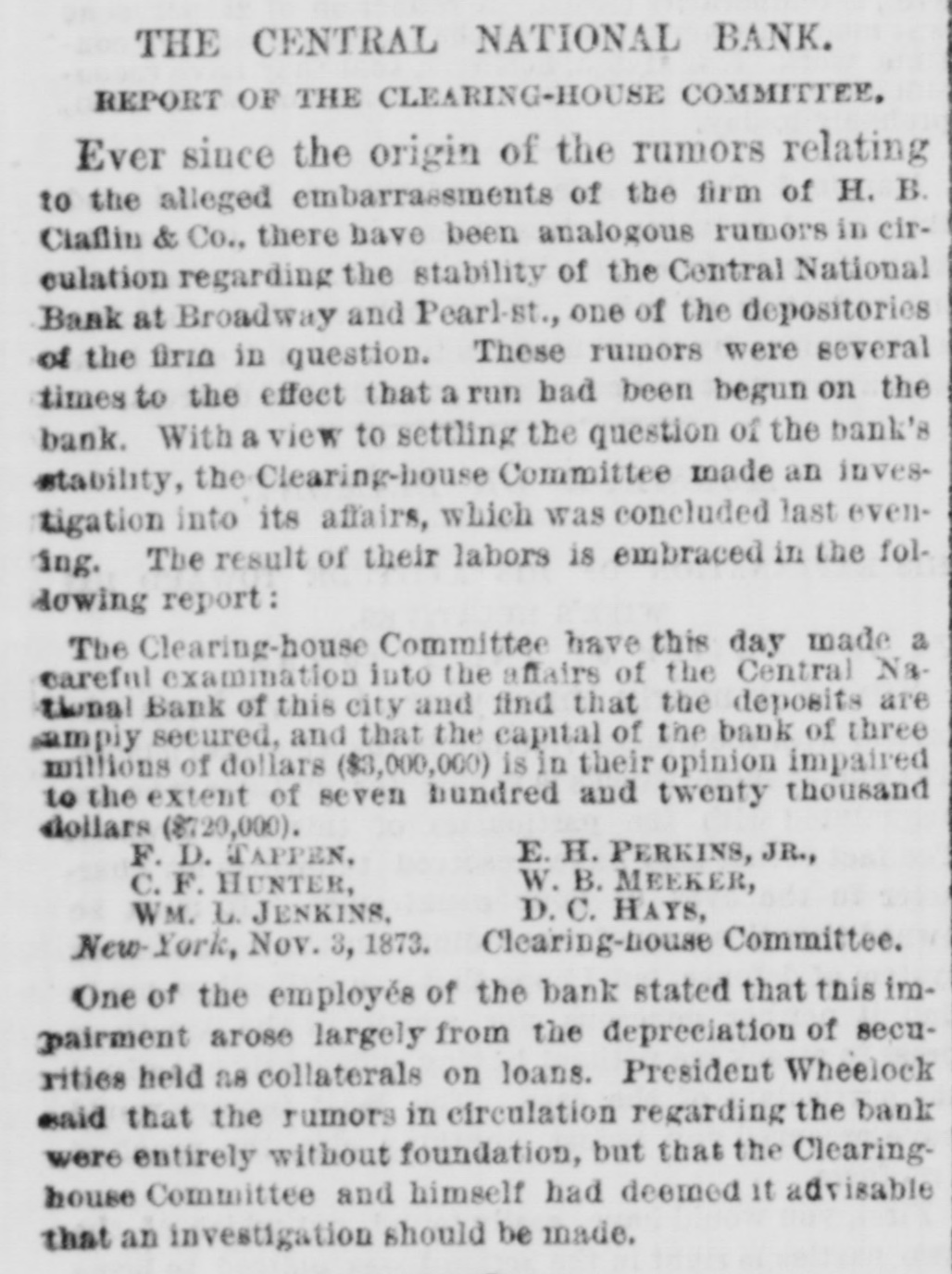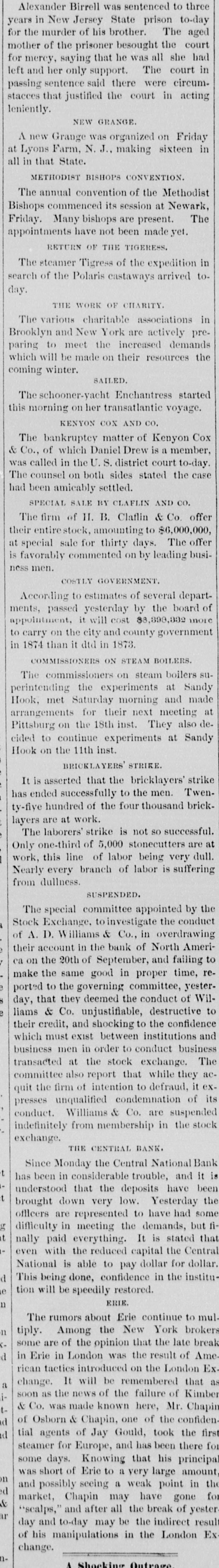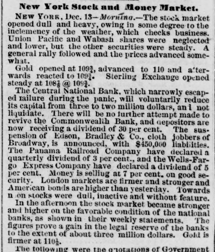 THE MONETARY SITUATION. A QUIET DAY ON 'CHANGE. Condition of the Central National Bank and of the Banks Generally. CLOSING OF THE CANALS. Yesterday was quiet day on 'Change, and, save the prevailing dulness, one would scarcely have thought for the country was passing through a great forfinancial crisis that had already shattered the tunes of some of the giants of the monetary world, and crippled scores of others only less in stature itself to its in strength, and shaken the nation very centre. Yet such was the case. It was EBB TIDE movein our troubled sea. and only very gentle never ment, sufficient to indicate that its motion being ceased, was apparent, the seeming pause reason also full of promise of an early now. stock One market of this expectant condition in the approachwill be found below, in reference to the when the of canal navigation, ing close from the West to the whole freight traffic the railwill be thrown upon so seaboard their earnings and roads, increasing speculation in their stocks. The stimulating condition of the banks noticeable in the to improved increase of their joint legal tender encouragement, reserve $21,000,000 brought also with it the in its manifestation, however, by checked want of accurate knowledge concerning their real condition. Rumor was again busy with THE CENTRAL NATION AL BANK, and its failure,was freshly reported. While, correct in the meaning of this word, it may not be strict application to the condition of the bank in in question, its must be acknowledged there has was been reconstructive failure. The bank at least debtor at the Clearing House yesterday ported morning, whereupon the associated banks permit- it with ted it effect its clearances by supplying which it This may loan certificates issued upon collateral, by have been enabled to go through. but wise policy on the part of the associated banks,bu of all the people have right to a full knowledge their the facts to enable them to judge how far interests are affected thereby. As THE ENDOWERS OF THESE INSTITUTIONS, giving them the privilege to issue currency and on in them six per cent interest endowment know paying amount so issued, they have right to their the condition whenever that condition them, becomes and in matter of peculiar importance to know how connection they have a right to capital this more weak banks there are whose and who many impaired, as was that of the Central, supthe did Central yesterday. may is any day have to lean on its fellows The for Bank Exami port, as ner is the party to supply this information of their the public. He is the visible trustee duty, to in the banks, and should do his the interests the consequences. The capital of AS whatever Bank is to be reduced to $2,000,000. Central said here yesterday, this is no longer panic. It 18 xtravagance NATIONAL PURGATION. born the war and its The reckless vices thus engendered, financial results, and the proof has been manifest in which such less apparent Before body. in the body politic, are now the we can enter again the financial progress looking upon the of honorable national creasing greatness that the lastened upou of the as well lungous and former. more Honest trugality in direction business unders standing of our to great new course The great find an opporexpansion broken up, and small in their several depart of tunity for without the danger ments of trade, himself ergrown crushed by powert any shock. unable thstand labor must revised and relations of capital and each against undue their rights comb. nation the part nds and unhealthy impositions which huge the other. Those people, as in the case diviratiroads inflict upon exorbitant freight charges pay no existence, must be g dends on stock sense justice, of right, the id of, and higher the national Hie, while must must be governed by personal life PRUDENCE AND that these like virtues true the reme all ills, and will find the as we seek them or are degree, meantime, greater or less the much attain by their teachings in desired relief. At & meet Commerce called, vesterday, national character the Chamber the purpose of giv ing the that would seem. for in the absence of payments banks good document from the Bank Examiner came sirable subject of resumption of specie it was strongly tion, when to take immediate up for consider government ought that measures urged that the bring about that stating gentleman should result one any reason why releading falled to gentleman, delayed. The saine which he of econpublican, offered the day is suggestive "that the lesson of revenues lower prices, and of duminished of government and point accelerate return omy, the obvious duty to specie pay the banks to the Chamber will and that of United ments, be. the purchase gress o cause discon tinued need and the applicaStates bonds to be reserve notes, tion of the national gold but the power of tion of Treas This would seem to indicate reissue, &c. NEW DEPART the part government being tended on the be a wise one and the reputation financial what becomes of the secretary the Treasury President, which the presen office, and the referred his predecesso these very a sound acquired proposition above? the the to stop Treasury to resumption, accumulate gold in when and bonds,and for greenbac exchangeable the what and proportion fit. seem would the above The countr. plied might have resumed long since. extent least would be much richer, applied the Euro- the quence excess of taxes have less fear from the pean financial our debt. and would disturbance in consee government enormous amount there while in the absence which and others, held mark abroad, to the loan bonds the gov home this stimulation purchase its own unfinished weekly furnished, many financial failed tion would have ernment terprises at that encumber to obtain our the means of bills, becoming dangerous. EXCHANGE WENT OFF AGAIN days' FOREIGN any demand for sixty effect of this in the absence was stiffer. The is while short sight chan