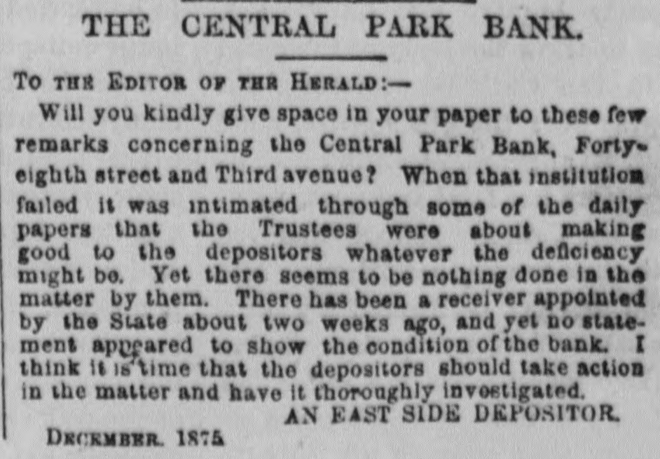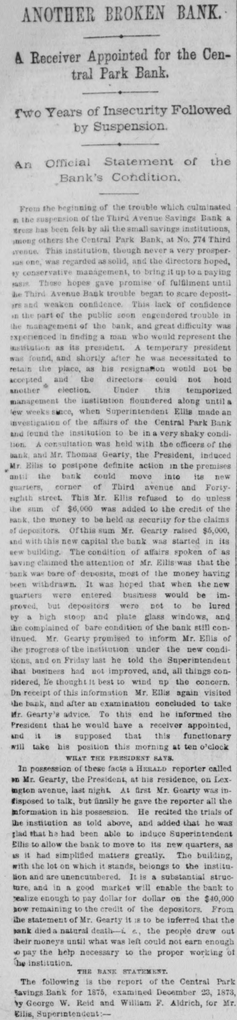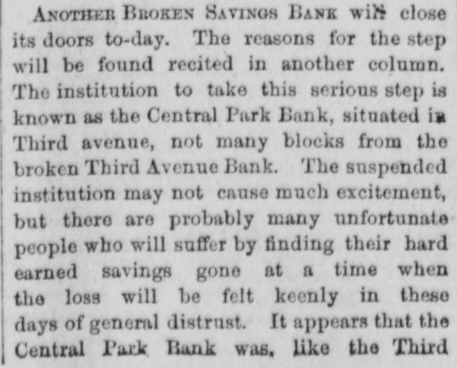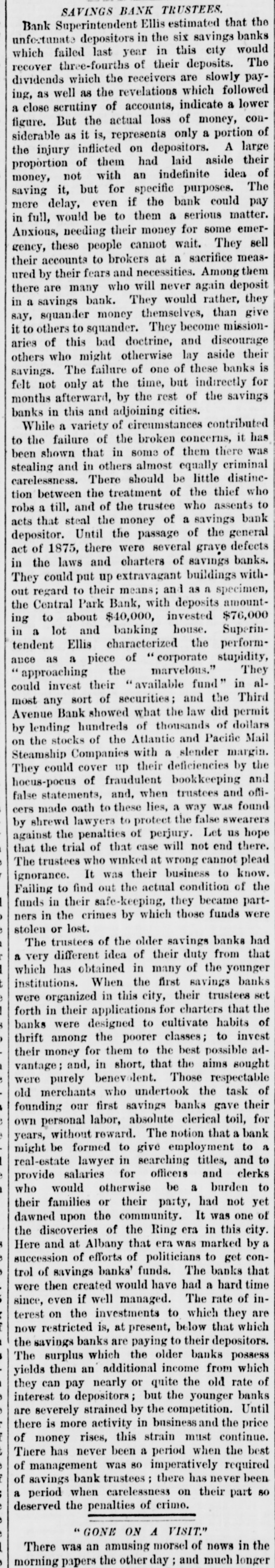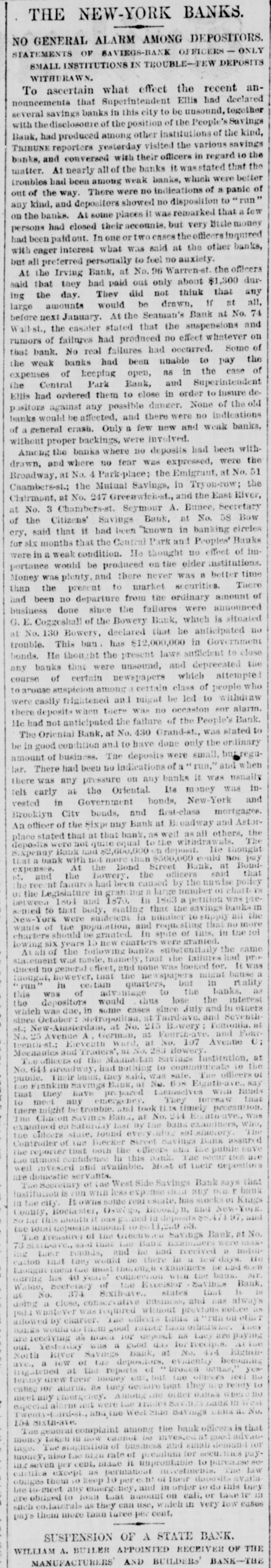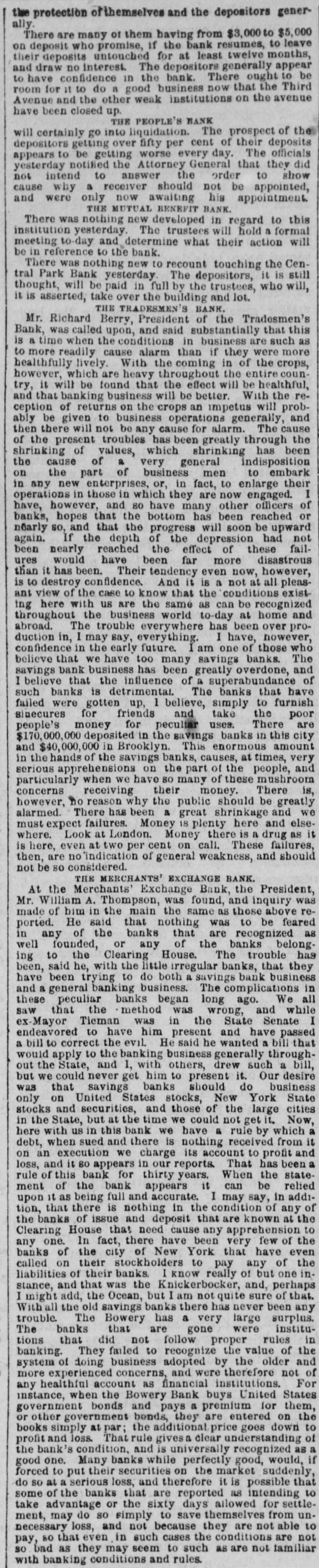 the protection of themselves and the depositors generally. are many of them having from $3,000 to to $5,000 leave There who promise, if the bank resumes, twelve months, on deposit deposits untouched for at least generally appear their no interest. The depositors ought to be and draw confidence in the bank. There that the Third to have do a good business now the avenue room Avenue for and it to the other weak institutions on have been closed up. THE PEOPLE'S BANK certainly go into liquidation. The of prospect their deposits of the will depositors getting over fifty worse per every cent day. The officials appears to notified be getting the Attorney General that to they show did to answer the a receiver should not be not yesterday intend why order appointment appointed, cause and were only now awaiting his THE MUTUAL BENEFIT BANK. There was nothing new developed in regard hold to formal this yesterday. The trustees will a will institution meeting to-day and determine what their action be in reference was nothing to the new bank. to recount touching it the is Cen- still There Park Bank yesterday The depositors, who will, tral thought, will be paid in full by the trustees, lot. it is asserted, take over TRADESMEN'S the building BANK. and THE Berry, President of the Tradesmen's that Mr. Richard called upon, and said substantially such this as Bank, was when the conditions in business are were more is a time cause alarm than if they the crops, to more readily lively. With the coming in of entire counhealthfully which are heavy throughout will the be healthful, however, will be found that the effect With the retry, it business will be better. will proband that of banking returns on the crops an impetus generally, and ception be given to business operations for alarm. The cause ably then there will not troubles be any has cause been greatly through has been the of the present of values, which shrinking indisposition shrinking of a very general to embark the cause of business men their on the new part enterprises, or, in fact, now to enlarge engaged. I operations in any in those in which have they many are other officers of banks, have, however, hopes that and the so bottom has will been soon reached be upward or nearly so, and that depth the of progress the depression had fail- not again. reached the effect of nearly have been far more been. Their tendency even now, at all been ures would If the these disastrous however, pleasthan it has confidence. And it is a conditions not exist is to destroy of the case to know that the can be recognized ant view are the same as home and ing here with us business world to-day at prothroughout abroad. The the trouble everywhere has I have, been over however, duction in, I may early say, everything. future. am one of banks. those who The I confidence believe that in we the have too has many been greatly savings overdone, and of savings believe bank that business the influence of The a superabundance banks that have such banks were gotten is detrimental. up, I believe, and take simply the to furnish poor sinecures failed for friends for pecultar uses. banks There in this city are people's 70,000,000 money deposited in the savings This enormous amount and $40,000,00 the in Brooklyn. savings banks, causes, at people, times, very and serious in the hands apprehensions of on so the many part of of these the mushroom is, receiving should particularly when we have their money. There be greatly concerns no reason why the public great shrinkage and else- we alarmed. however, There failures. has been Money a IS plenty there here is a drug and as it must expect Look at London. Money on call. These failures, then, are is where. here, even no indication two per of cent general weakness, and should not be so considered. MERCHANTS' EXCHANGE BANK. the Merchants' THE Exchange found, Bank, and the inquiry President, was Mr. At William A. Thompson, the main the was same as those be above feared remade of him in said that nothing was recognized to as ported. He the banks that are banks belongin any founded, of or any of the The trouble has well to the Clearing little House. irregular banks, that business they been, ing said he, with the to do both a savings complications bank in have been trying banking business. The ago. We all a general banks began long and these method was State Senate I and that peculiar the was in the wrong, have passed while that saw ex-Mayor Tieman him present and a bill endeavored to the have evil. He said he generally wanted througha bill to correct the banking business drew such a bill, out the State, get him to present do business but we could never banks should York would apply to and 1, with others, it. Our desire State that States stocks, the large only was on United savings and those of New get cities Now, a stocks and securities, at the time we could not rule by which in the State, in but this bank we have a received from it when sued and its account to has been here debt, with us we there charge is nothing That profit and on loss, an and execution it 80 appears for in thirty our reports years. When can be the state- relied rule of this the bank bank appears it I may say, in addi- of ment upon it of as being full nothing and accurate. in the condition known of any at the tion, that there is and deposit that are the banks of issue that need cause any few of In fact, there have York been that have Clearing House apprehension very even the the to banks of the stockholders to pay of but one any called one. on their city banks. of New I know really and, any perhaps of inliabilities of their the Knickerbocker, sure of that. stance, and that was Ocean, but I am not quite never been any I might add, old the savings banks there has large surplus. the The Bowery has a gone were trouble. banks that are follow proper value of With all The not very the rules institu- the in tions that did failed to recognize the older and banking. They business adopted were by 