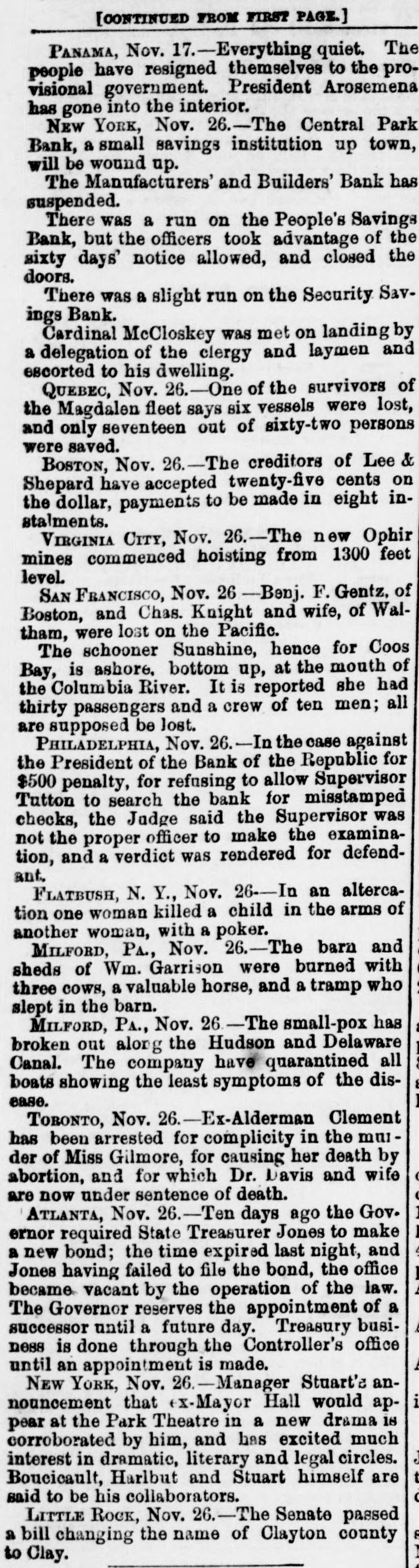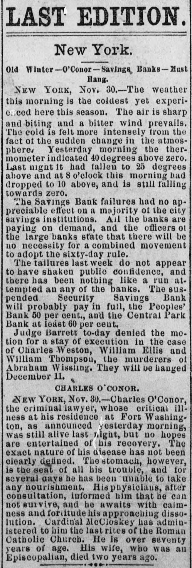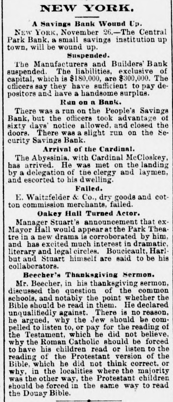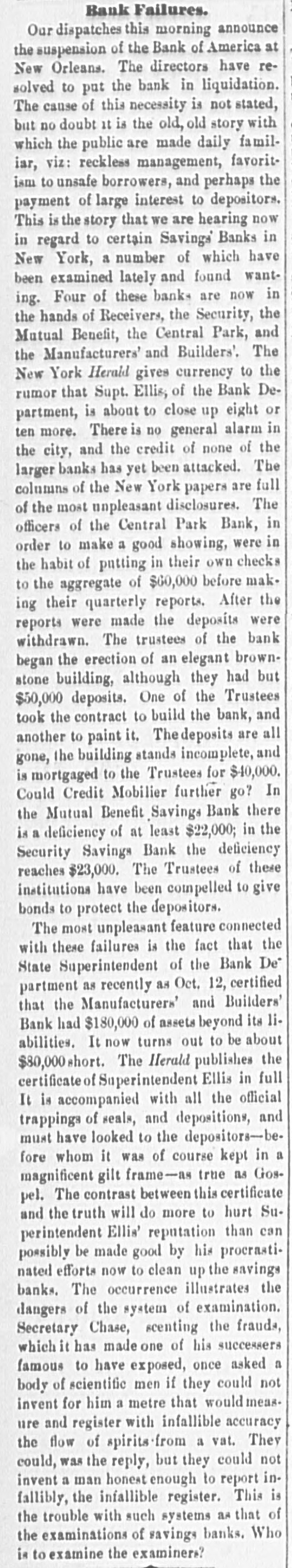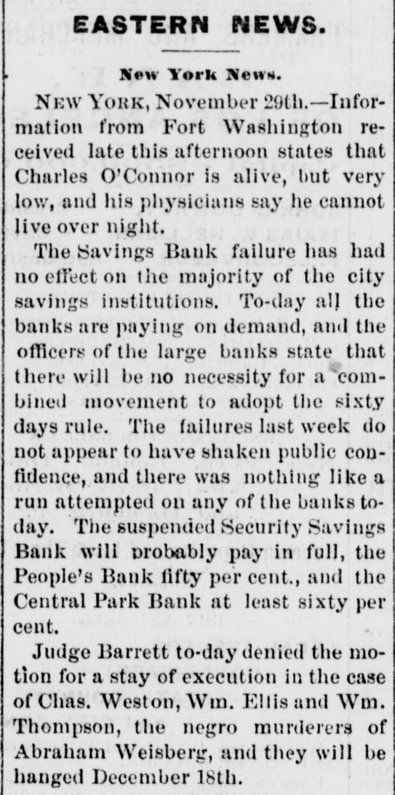 the protection of themselves and the depositors generally. are many of them having from $3,000 to to $5,000 leave There who promise, if the bank resumes, twelve months, on deposit deposits untouched for at least generally appear their no interest. The depositors ought to be and draw confidence in the bank. There that the Third to have do a good business now the avenue room Avenue for and it to the other weak institutions on have been closed up. THE PEOPLE'S BANK certainly go into liquidation. The of prospect their deposits of the will depositors getting over fifty worse per every cent day. The officials appears to notified be getting the Attorney General that to they show did to answer the a receiver should not be not yesterday intend why order appointment appointed, cause and were only now awaiting his THE MUTUAL BENEFIT BANK. There was nothing new developed in regard hold to formal this yesterday. The trustees will a will institution meeting to-day and determine what their action be in reference was nothing to the new bank. to recount touching it the is Cen- still There Park Bank yesterday The depositors, who will, tral thought, will be paid in full by the trustees, lot. it is asserted, take over TRADESMEN'S the building BANK. and THE Berry, President of the Tradesmen's that Mr. Richard called upon, and said substantially such this as Bank, was when the conditions in business are were more is a time cause alarm than if they the crops, to more readily lively. With the coming in of entire counhealthfully which are heavy throughout will the be healthful, however, will be found that the effect With the retry, it business will be better. will proband that of banking returns on the crops an impetus generally, and ception be given to business operations for alarm. The cause ably then there will not troubles be any has cause been greatly through has been the of the present of values, which shrinking indisposition shrinking of a very general to embark the cause of business men their on the new part enterprises, or, in fact, now to enlarge engaged. I operations in any in those in which have they many are other officers of banks, have, however, hopes that and the so bottom has will been soon reached be upward or nearly so, and that depth the of progress the depression had fail- not again. reached the effect of nearly have been far more been. Their tendency even now, at all been ures would If the these disastrous however, pleasthan it has confidence. And it is a conditions not exist is to destroy of the case to know that the can be recognized ant view are the same as home and ing here with us business world to-day at prothroughout abroad. The the trouble everywhere has I have, been over however, duction in, I may early say, everything. future. am one of banks. those who The I confidence believe that in we the have too has many been greatly savings overdone, and of savings believe bank that business the influence of The a superabundance banks that have such banks were gotten is detrimental. up, I believe, and take simply the to furnish poor sinecures failed for friends for pecultar uses. banks There in this city are people's 70,000,000 money deposited in the savings This enormous amount and $40,000,00 the in Brooklyn. savings banks, causes, at people, times, very and serious in the hands apprehensions of on so the many part of of these the mushroom is, receiving should particularly when we have their money. There be greatly concerns no reason why the public great shrinkage and else- we alarmed. however, There failures. has been Money a IS plenty there here is a drug and as it must expect Look at London. Money on call. These failures, then, are is where. here, even no indication two per of cent general weakness, and should not be so considered. MERCHANTS' EXCHANGE BANK. the Merchants' THE Exchange found, Bank, and the inquiry President, was Mr. At William A. Thompson, the main the was same as those be above feared remade of him in said that nothing was recognized to as ported. He the banks that are banks belongin any founded, of or any of the The trouble has well to the Clearing little House. irregular banks, that business they been, ing said he, with the to do both a savings complications bank in have been trying banking business. The ago. We all a general banks began long and these method was State Senate I and that peculiar the was in the wrong, have passed while that saw ex-Mayor Tieman him present and a bill endeavored to the have evil. He said he generally wanted througha bill to correct the banking business drew such a bill, out the State, get him to present do business but we could never banks should York would apply to and 1, with others, it. Our desire State that States stocks, the large only was on United savings and those of New get cities Now, a stocks and securities, at the time we could not rule by which in the State, in but this bank we have a received from it when sued and its account to has been here debt, with us we there charge is nothing That profit and on loss, an and execution it 80 appears for in thirty our reports years. When can be the state- relied rule of this the bank bank appears it I may say, in addi- of ment upon it of as being full nothing and accurate. in the condition known of any at the tion, that there is and deposit that are the banks of issue that need cause any few of In fact, there have York been that have Clearing House apprehension very even the the to banks of the stockholders to pay of but one any called one. on their city banks. of New I know really and, any perhaps of inliabilities of their the Knickerbocker, sure of that. stance, and that was Ocean, but I am not quite never been any I might add, old the savings banks there has large surplus. the The Bowery has a gone were trouble. banks that are follow proper value of With all The not very the rules institu- the in tions that did failed to recognize the older and banking. They business adopted were by 