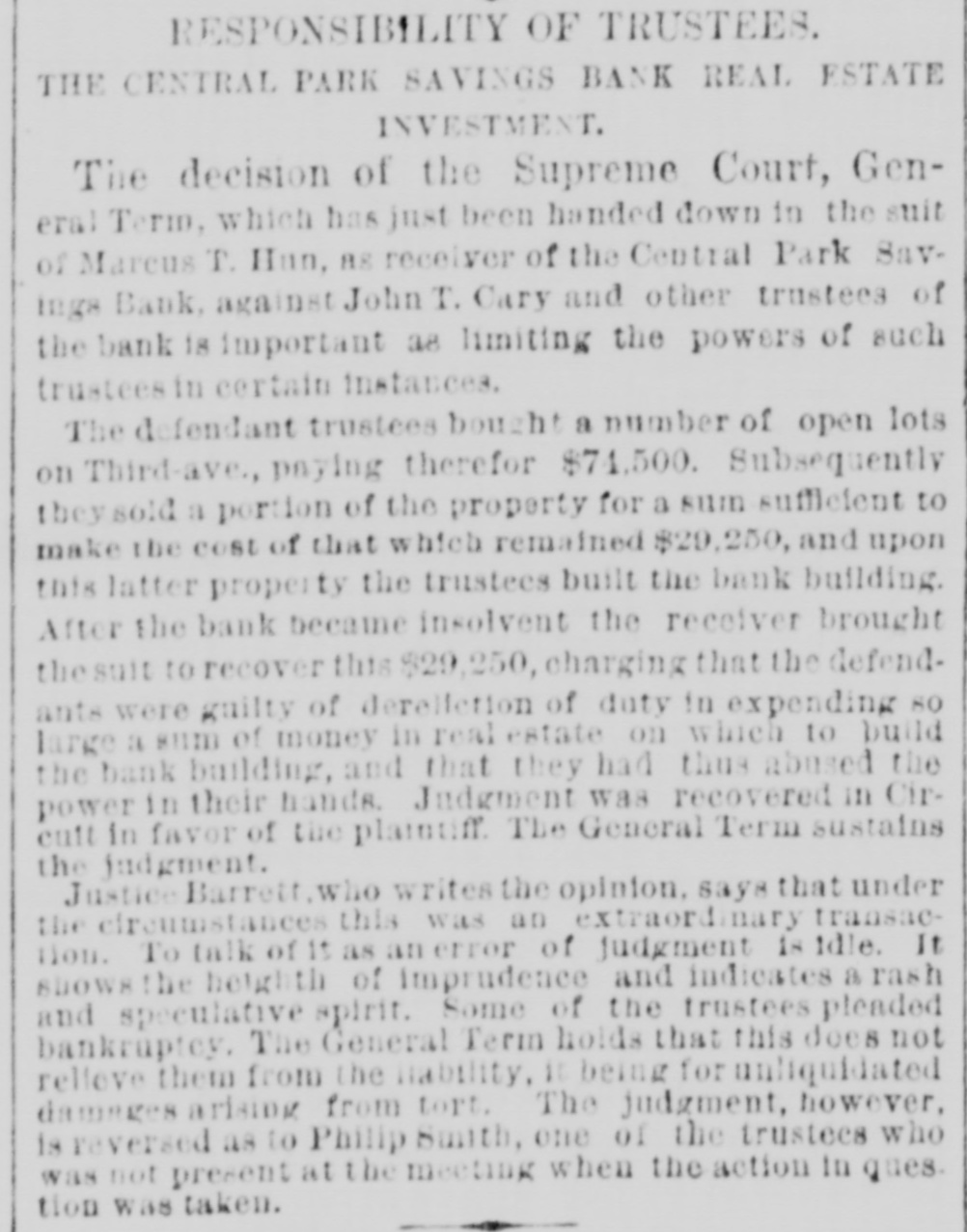RESPONSIBILITY OF TRUSTEES. THE CENTRAL PARK SAVINGS BANK REAL ESTATE INVESTMENT. The decision of the Supreme Court, General Term, which has just been handed down in the suit of Marcus T. Hun, as receiver of the Central Park SavHaga Bank, against John T. Cary and other trustees of the bank 18 important as limiting the powers of such trustees in certain instances. The defendant trustees bought a number of open lots on Third-ave., paying therefor $71,500. Subsequently they sold a portion of the property for a sum sufficient to make the cost of that which remained $29,250, and upon this latter property the trustees built the bank building. After the bank became insolvent the receiver brought the suit to recover this $29,250, charging that the defendants were guilty of derelletion of duty in expending so large a sum of money in real estate on which to build the bank building, and that they had thus abused the power in their hands Judgment was recovered in Circutt in favor of the plantiff The General Term sustains the judgment. Justice Barrett. who writes the opinion. says that under the circumstances this was an extraordinary transaction. To talk of is as an error of judgement 18 idle. It BHOWS the heighth of imprudence and indicates a rash and speculative spirit. Some of the trustees pleaded bankruptcy, The General Term holds that this does not relieve them from the Hability, 10 being for unliquidated damages arising from tort. The judgment, however, is reversed as to Philip Smith, one of the trustees who was not present at the meeting when the action in ques. tion was taken.