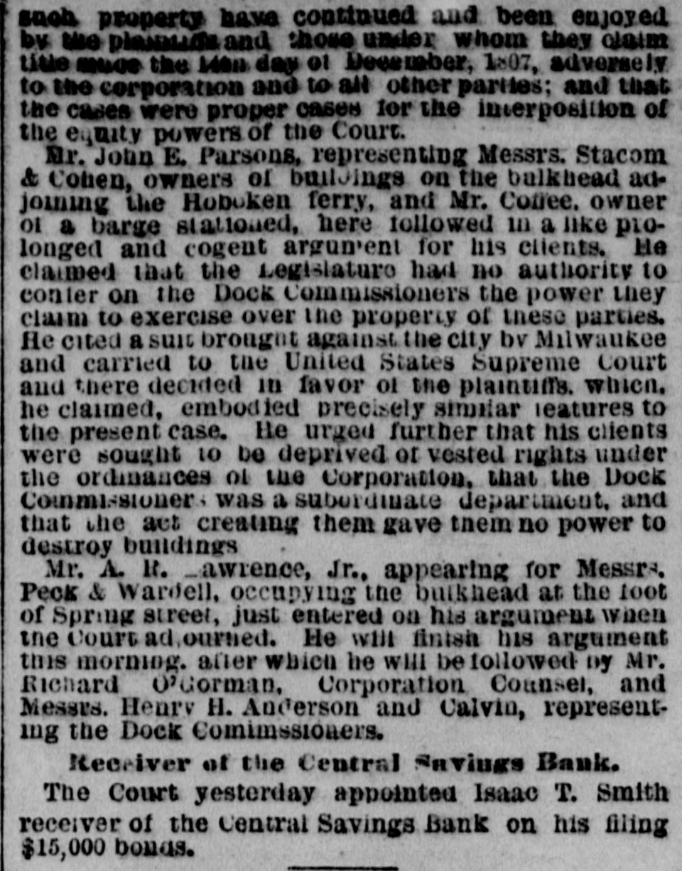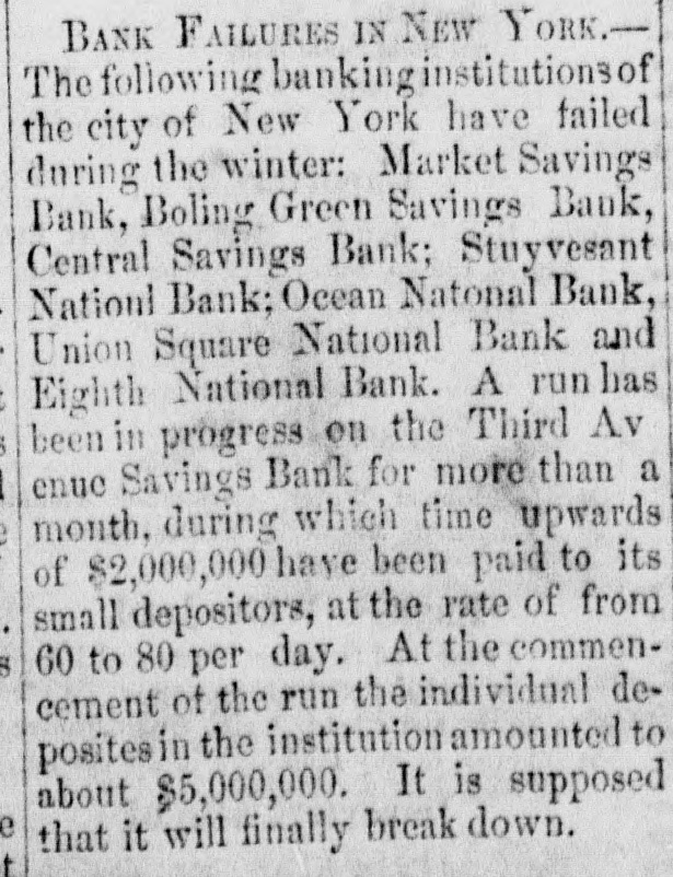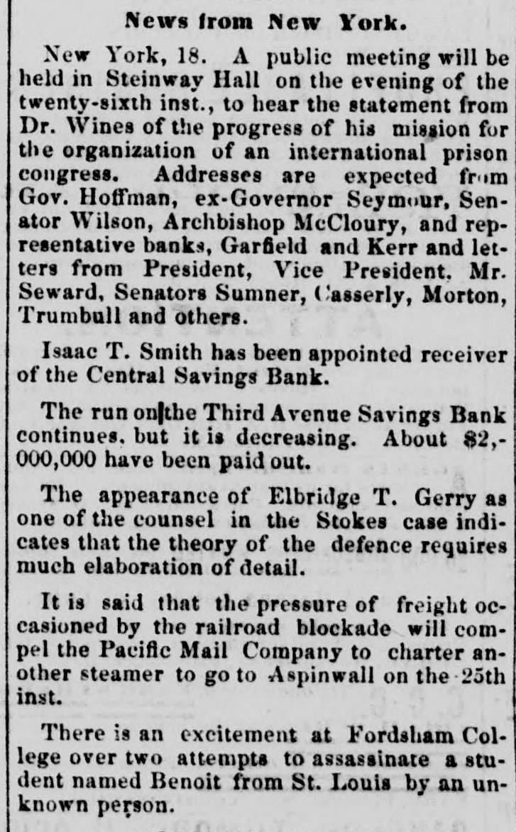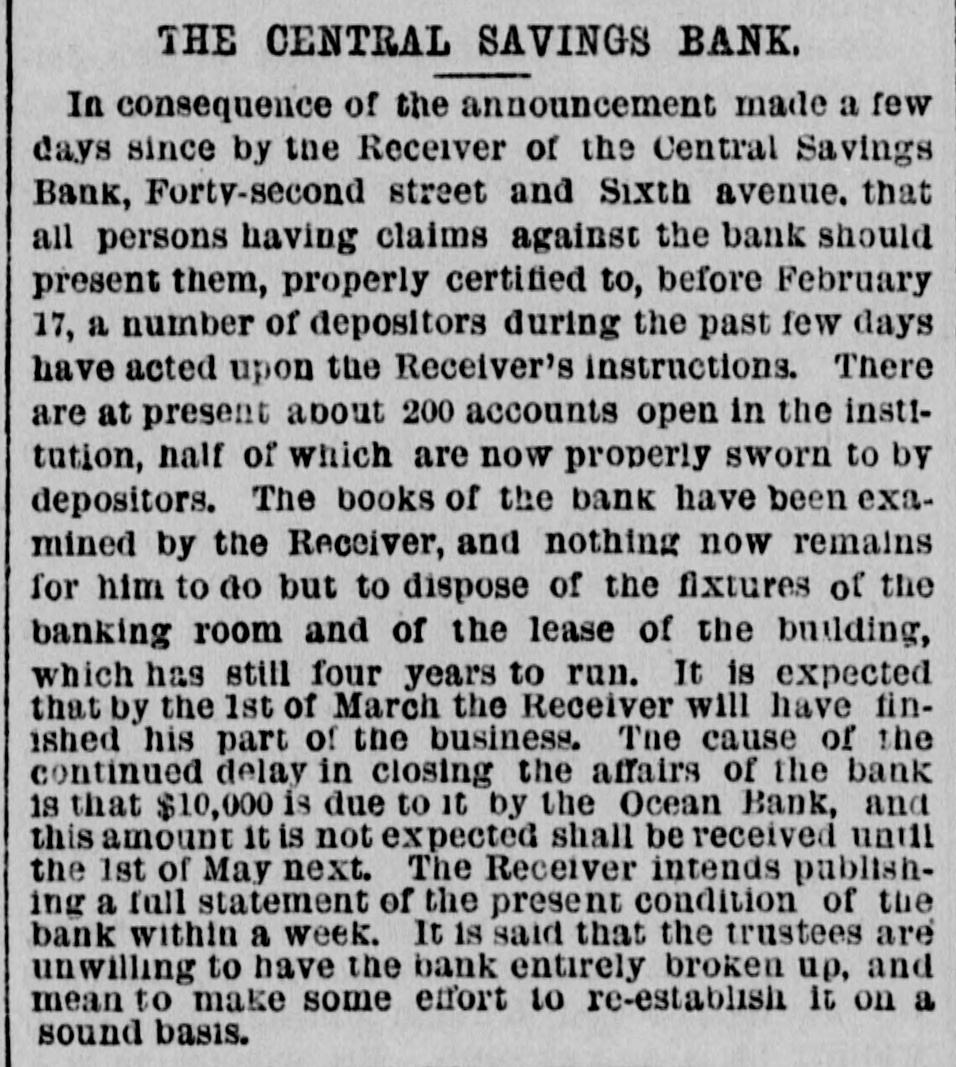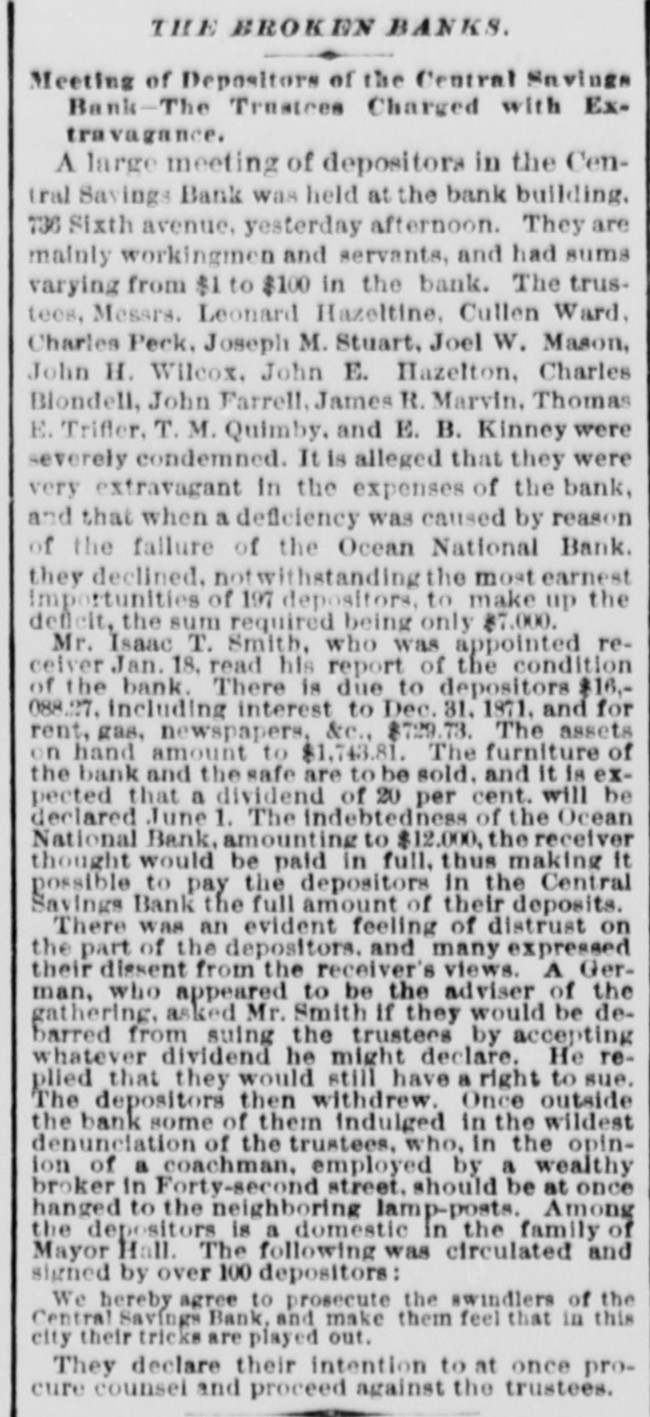BANK AFFAIRS. INVESTIGATION BY THE CONGRESS COMMITTEETHE CENTRAL SAVINGS BANK. The sub-Committee of the Committee on Banking and Currency. consisting of Representatives Worthington C. Smith, Merriam, and Randall, appointed to investigate the bank suspensions in this city, met at the Clearing-House in Wall-st. yesterday morning, to confer with Messrs. Leverich and Tappen, representing the Clearing-House Committee, on the best means of preventing such disasters as have befallen the Ocean, Eighth, and Union Square National banks. Messrs. Leverich and Tappen were of the opinion that the failure of the banks named was attributable to bad banking. They recommended that a proper compensation should be attached to the office of Bank Examiner, and that it should only be filled by men of approved ability and integrity. They further recommend that Bank Examiners should be moved from one center of finance to another. and not allowed to remain in one place, as in the case of Callender. It is understood that the Committee will urge the passage of an act making it a misdemeanor for a Bank Examiner to borrow money. directly or indirectly. from any bank examined by him, and making it a similar offense for any bank officer to lend a Bank Examiner any money even upon the most approved securities. The Committee have investigated the affairs of the Ocean and Union Square National Banks, but will not report until Congress reassembles. Mr. Merriam informed 8 TRIBUNE reporter last evening that nothing had been discovered calculated to throw discredit on the National Banking system. Mr. Smith has been suddenly called away from the city, and the investigations will be conducted by Mr. Merriam. The Central Savings Bank. at Sixthave. and Fortysecond-st., was organized four months ago, and having had $12,000 on deposit in the Ocean National Bank at the time of its suspension, has been unable to meet all the demands which its depositors have made upon it. Several days have elapsed before checks made by depositors have been honored, and considerable Anxiety prevails among them. officers of the bank have stated that the institution has not paid expenses. The rest of the building which the Bank occupies*is a large one, and although the number of depositors IN considerable, yet the aggregate amount of money intrusted to its care is comparatively small. A TRIBUNE reporter was informed yester day by Mr. Davis, Receiver of the Ocean National Bank, that the amount due the Savings Institution will ulti. mately be paid in full. and there is no doubt from the statement of Mr. Peek, President of the Central Bank, that the bank will be able to pay all its depositors.