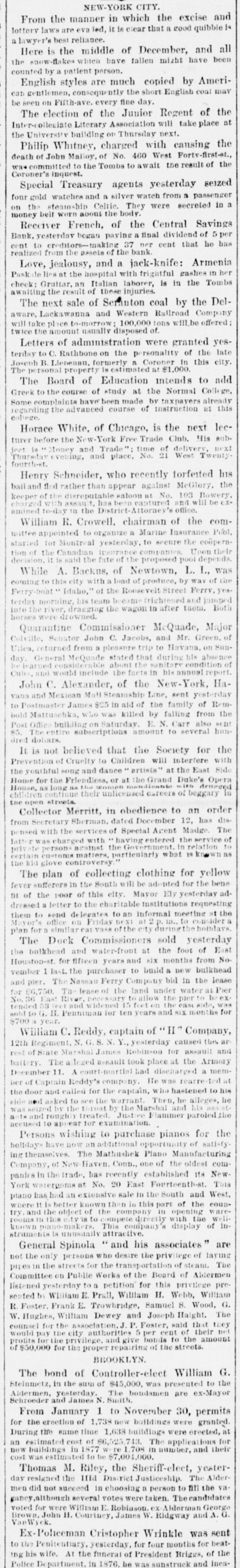 NEW-YORK CITY. From the manner in which the excise and lottery laws are led, it is clear that a good quibble is alawyer's best reliance. Here is the middle of December, and all the snow-flakes which have tallen mizht have been counted by patient person. English styles are much copied by American gentlemen, consequently the short English coat may be seen on Fifth-ave. every fine day. The election of the Junior Regent of the Inter-colleciate Literary Association will take place at the University building or Thursday next. Philip Whitney, charged with causing the death of John Malioy, of No. 460 West Forty-first-at. rae committed to the Tombs to await the result of the Coroner's inquest. Special Treasury agents yesterday seized four gold watches and a silver watch from a passenger on the steamship Celtic They were secreted in a money belt worn about the body. Receiver French, of the Central Savings Bank. vesterdav began paying a final ividend of 5 per cent to creditors-making 37 ner cent that he has realized from the assets of the bank. Love, jealousy, and a jack-knife: Armenia Paskate lies at the hospital with frightful gashes in her check: Gruttar, an Italian laborer, is in the Tombs awaiting the result of these injuries. The next sale of Scrauton coal by the Delaware, Lackawanna and Western Railroad Company I take place to-morrow; 100,000 tons will be offered; twice the amount usually disposed of. Letters of administration were granted yesterday to C. Rathbone on the personality of the late Joseph B Liebenau, formerly a Coroner in this city. The personal property estimated at $1,000. The Board of Education intends to add Greek to the course of study at the Normal College, Some complaints have been made by taxpayers already regarding the advanced course of instruction at this college. Horace White, of Chicago, is the next lecturer before the New-York Free Trade Club. His subMoney and Trade": time of delivery, next Thursday evening, and place, No. 21 West Twenty fourth-st. Henry Schneider, who recently torfetted his bail and fled rather than appear against MeGlory, the keeper of the disreputable saloon at No. 103 Bowery, assault. has been captured and III be amined to-day in the District-Attorney '8 office. William R. Crowell, chairman of the committee appointed to organize a Marine Insurance Pool, started for Montreal yesterday. to secure the cooperation the Canadian Upon their decision. it is said the fate of the proposed pool depends While A. Backus, of Newtown, L. I., was coming to this city with load of produce, by way of the Ferry-boat ** Idaho," of the Roosevelt Street Ferry, forday morning, his team became frightened and jumped the river, dragging the wagon in after taem. Both drowned. were Quarantine Commissioner M Quade, Major Colville, Senator John C. Jacobs, and Mr. Green. of Utica, returned from pleasure trip to Havana, on Sunday. General McQuade stated that during his absence about the sanitary condition of Cuba,and would include the facts in his annual report. John C. Alexander, of the New-York, Havana and Mexican Mall Steamship Line, sent yesterday to Postmaster James $25 in aid of the family of Rembold Mattuschka, who was killed by falling from the Post Office building Saturday E. N. Carr also sent 85. The entire subscriptions amount to several handred dollars. It is not believed that the Society for the Prevention of Cruelty to Children will interfere with the youthful song and dance artists' at the East Side Home for the Friendless, or at the Grand Duke's Opera drugged House, their unlicensed careers of beggary In the open streets. Collector Merritt, in obedience to an order from Secretary Sherman, dated December 12, has dis pensed with the services of Special Agent Madge. The with having entered the service of private persons against the Government relation certain customs matters, particularly what 18 known as the kid glove controversy The plan of collecting clothing for yellow fever sufferers in the South will be adopted for the bene fit of the poor of this city. Mayor Ely yesterday addressed letter to the charitable institutions requesting their to kend de legates to an informal meeting at the . Mayor's office on Friday next in., to consider plan for similar vass of the city duringthe holidays. The Dock Commissioners sold yesterday the bulkhead and water-front at the foot of East Houston-st for fifteen years and six months from No vember 1 last. the purchaser to build a new bulkhead and pier. The Nassau Ferry Company bid in the lease $6,750. The lease of the land under water at Pier to allow the pier beex tended widened 15 feet on the ease side, G. H. Penniman for ten years and SIX months for year. $700 William C. Reddy, captain of "I" Company, 12th Regiment. N. G. S. N. Y. yesterday caused the ar rest of State Marshal James Robinson for assault and battery. The leged assault took place at the Armory December 11. A court-martial had discharged a member of Captain Reddy's company. He was rearre-ted door and called for the captain, who hastened to his and asked to see the warrant. Then, he alleges, he the throat by the Marshal and it and roughly treated Justic Flammer paroled the accused to appear for examination. Persons wishing to purchase pianos for the holidays have now an additional opportunity of satisfy ing themselves. The Mathushek Plano Manufacturing Company, of New-Haven Conn., one of the oldest companics in the trade. has recently established its New York watergoms at No. 20 East Fourteenth-st. This plano has had an extensive sale in the South and West, where it better known than in this part of the counand the object of the company in opening warerooms to compete directly with the well known This company's display of instraments is unusually attractive. General Spinola " and his associates " are not the only persons who desire the privilege of laying pipes in the streets for the transportation of steam. The Committee on Public Works of the Board of Aldermen
